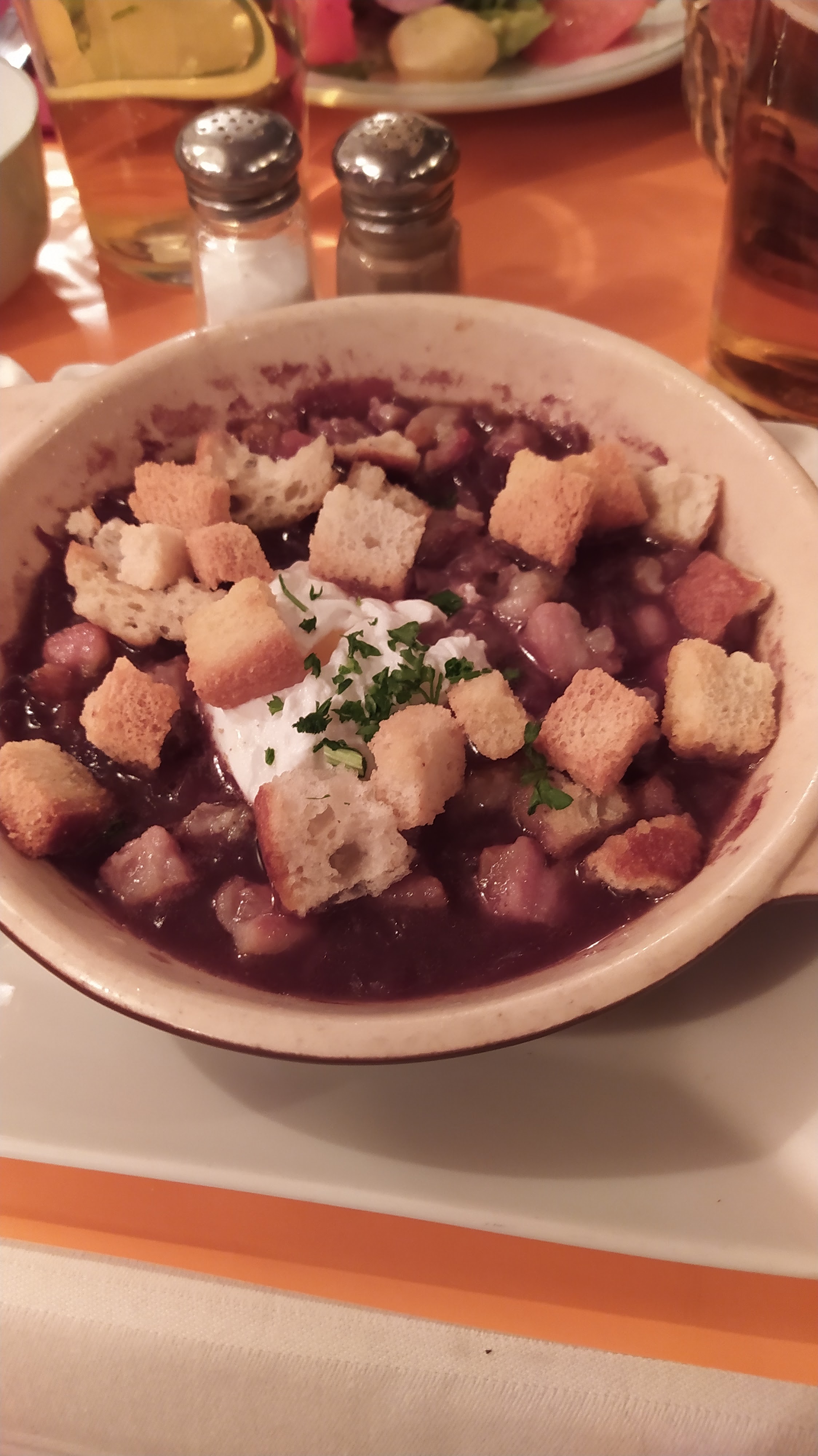 Ils ont un menu avec des images et différentes langues. Ce qui est sympa. MAIS il ne contient pas de prix et lorsque le chèque est arrivé, le prix semblait un peu plus élevé. Surtout pour l'assiette avec différents fromages. Le premier serveur était super gentil et nous parlait anglais. Après avoir reçu le plat principal, il était parti. Le deuxième serveur (un homme plus âgé) n'était pas vraiment communicatif et ne prêtait pas beaucoup d'attention aux quelques clients présents. La soupe au bœuf semble bonne. Le rumsteck était constitué de deux morceaux minces qui ne ressemblaient pas beaucoup à un steak. Les pommes de terre frites semblaient vraiment sortir d'une friteuse. Ce n'était pas très mal mais nous nous attendions à quelque chose de différent de ce que nous avons eu. Les toilettes sont un désastre absolu. Tout l'étage était rempli (espérons-le) d'eau et il fallait littéralement grimper derrière les toilettes pour fermer la porte.