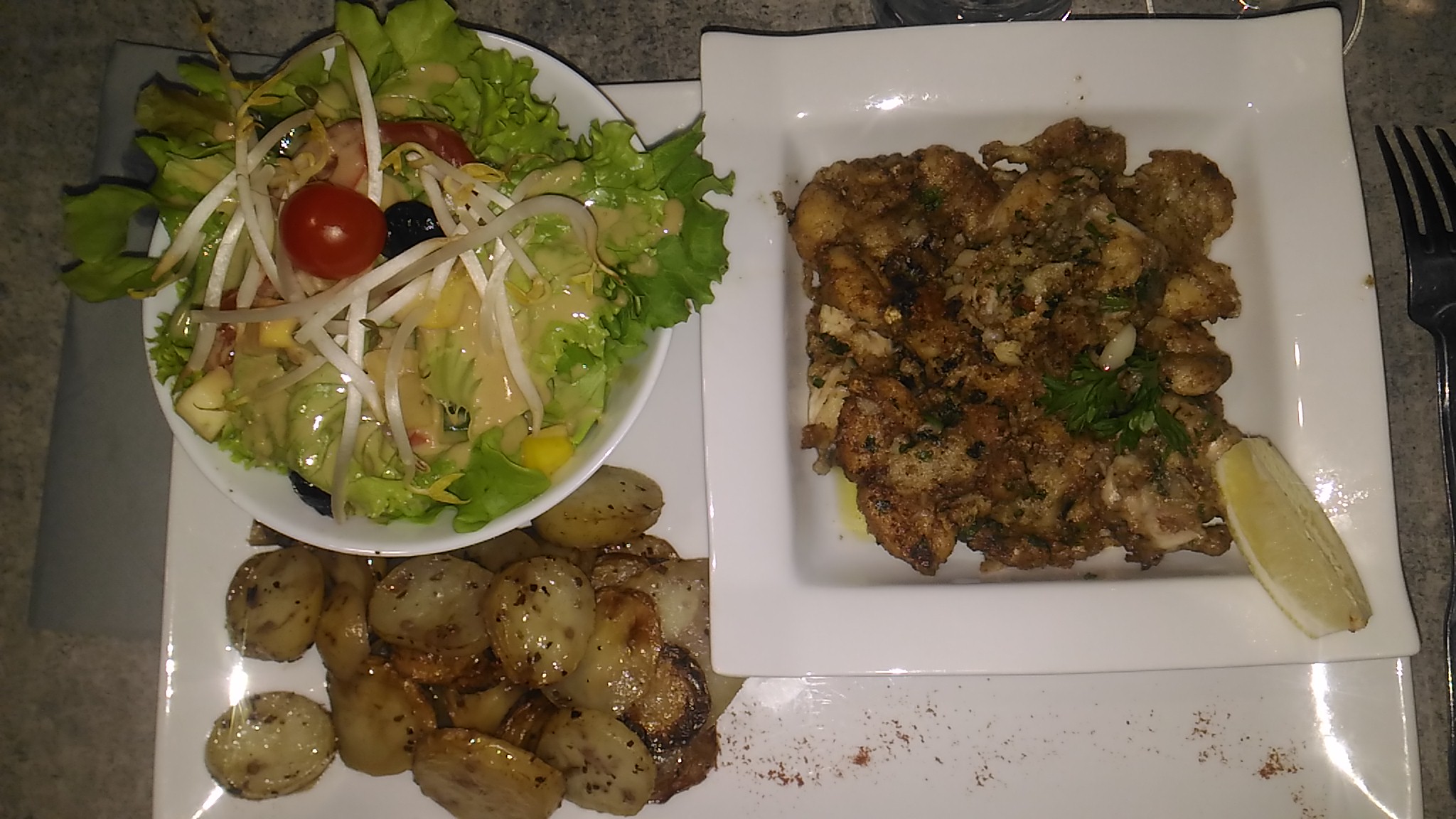 L entrée fois gras, grenouille/salade/pomme de terre sautées, dessert cheesse cake bananes...repas bon, un peu déçu sur le dessert et l odeur du poisson cuit à la planche, a refaire