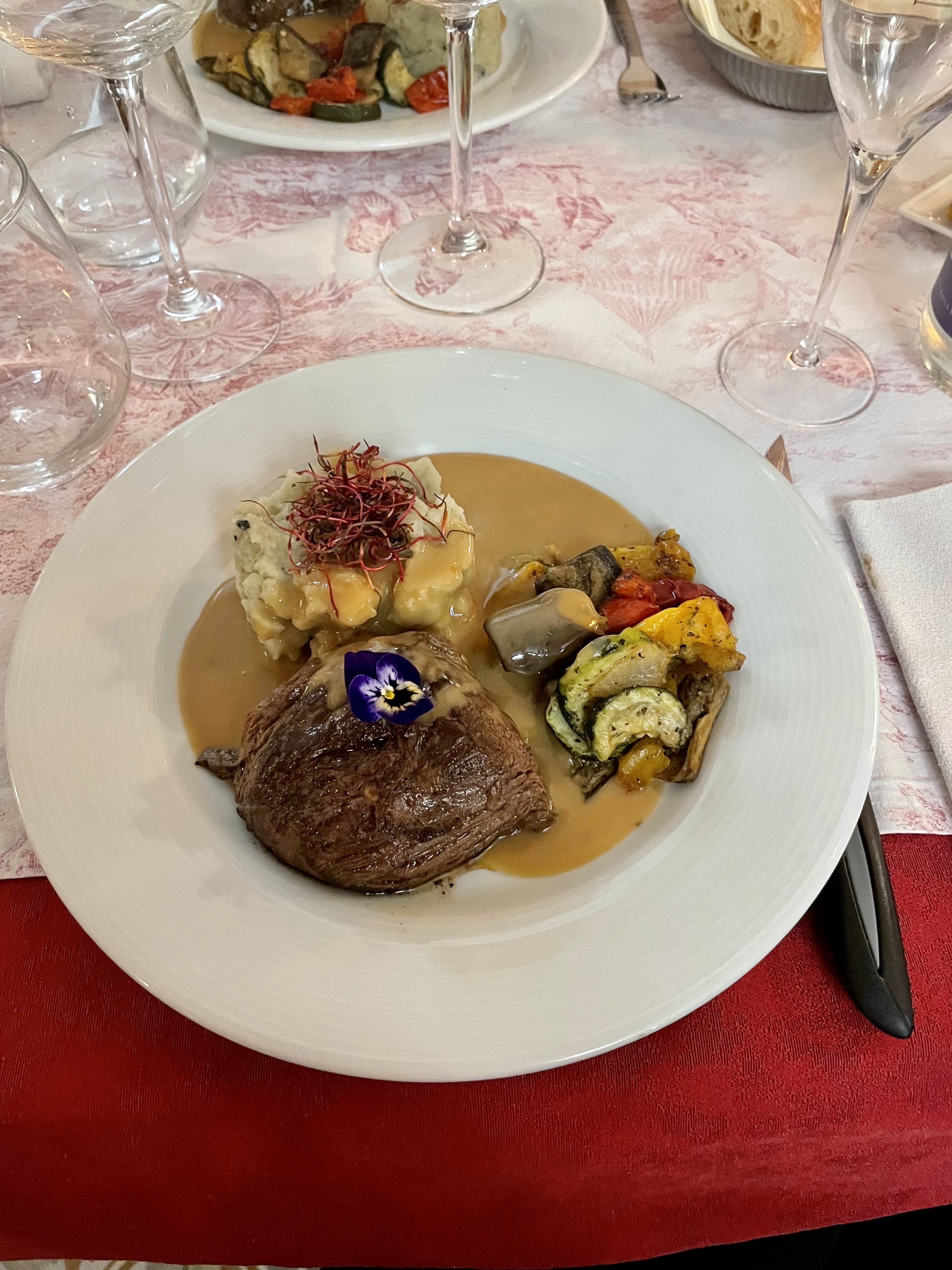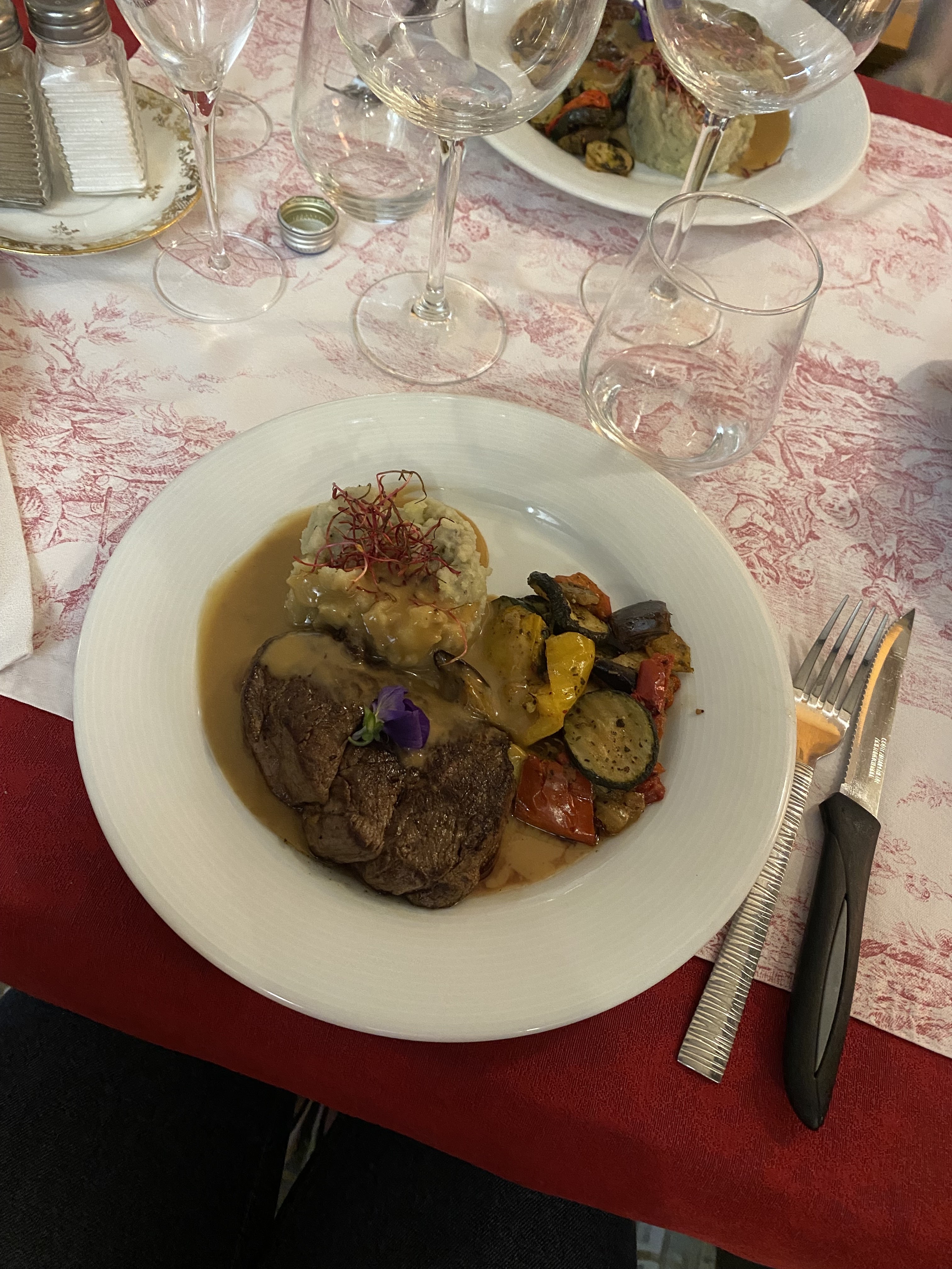 Jean Michel est un chef fantastique, nous avons eu plusieurs plats délicieux. Le plat principal s'est démarqué, le filet était parfaitement cuit, la sauce aux champignons sur les frites était coupée à la main et frite à la perfection ! Catherine était une hôtesse formidable, nous avons eu un délicieux champagne aux fleurs de violette. Merci pour tout!
