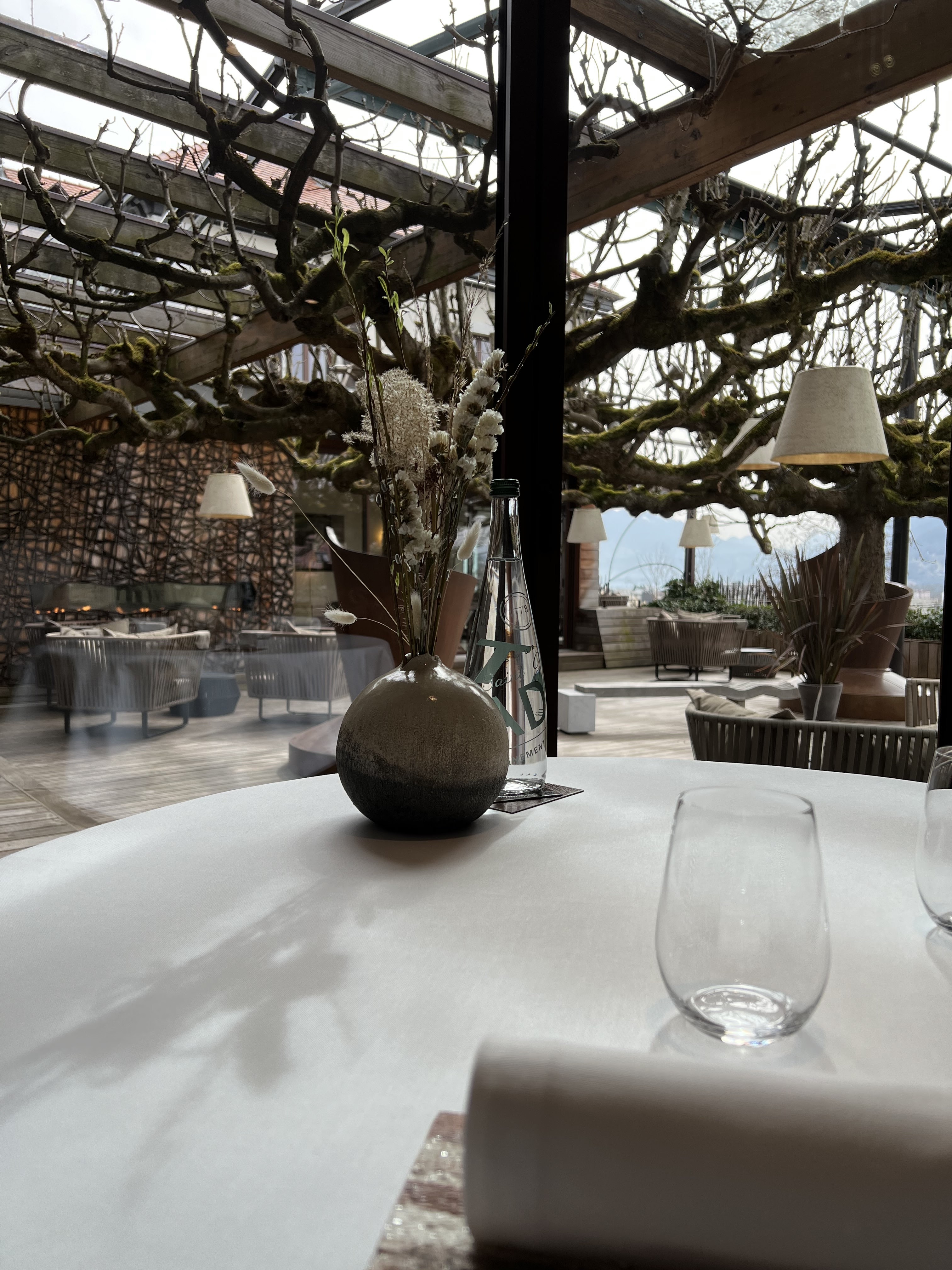 La salle est très belle, la terrasse superbe, le service excellent. Enchainement des mets parfaitement contrôlé. Mais…. Nous n’avons pas apprécié toutes les préparations. Bien que visuellement parfaites, certaines sont osées et nous les avons trouvées un peu trop élitistes à notre goût. Le foie de féra, le sorbet de roquette ne nous ont pas convaincus Mais, quelle expérience ! De l’art dans les assiettes. Bravo.