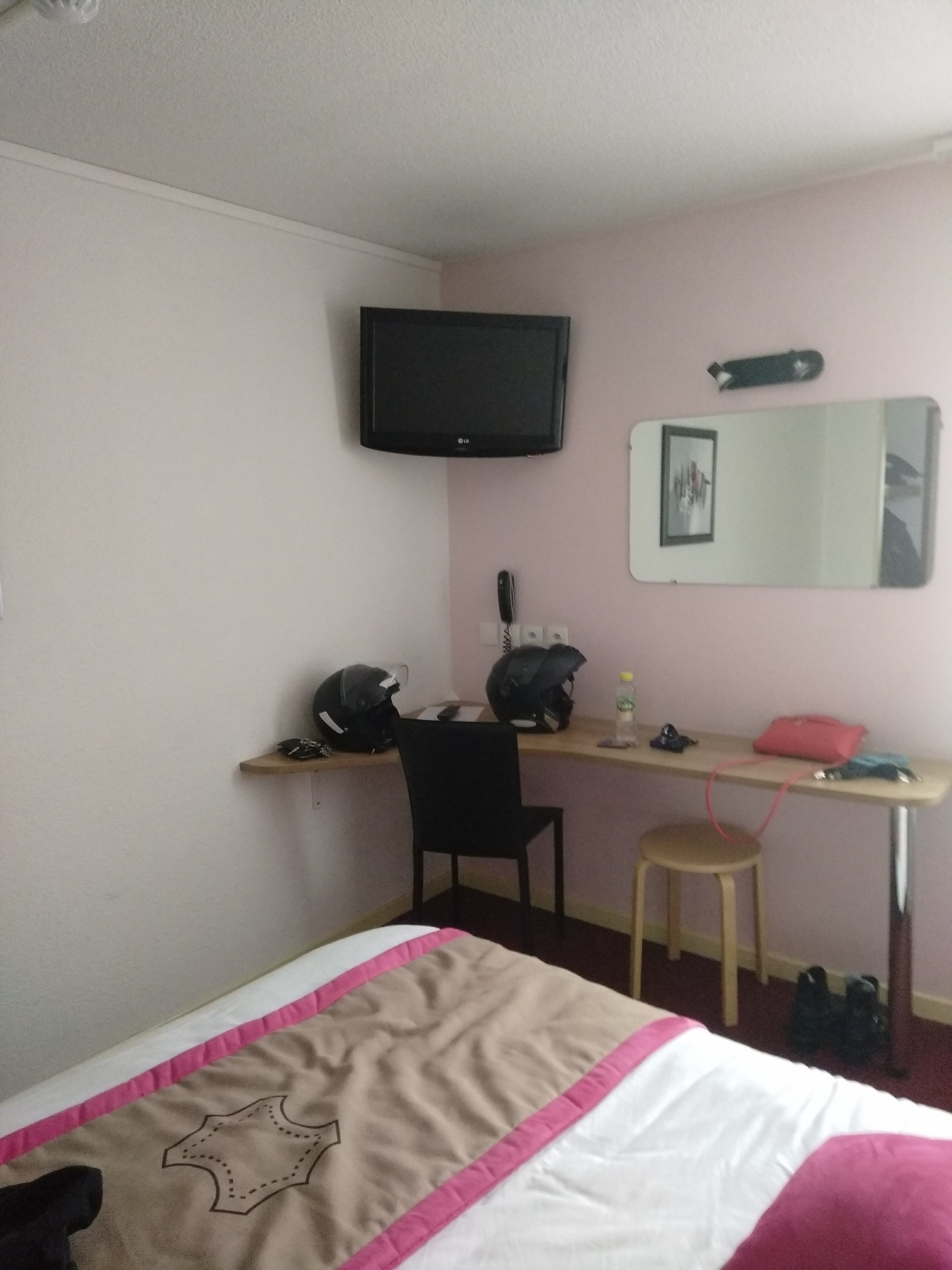 Hôtel d'étape, chambre propre,attention à la robinetterie, problème signalé, matelas à surveiller,tendance à s'affaisser sur le bord, et non, on ne regarde pas la télé de son lit en tournant la tête de côté, ces emplacements de télé qui nous oblige 1) à lever la tête 2) à la tourner m'exaspère un peu,attention aux arrivées tardives, 2h du matin, dire aux gens de ne pas discuter dans les couloirs, je suis intervenue et tout s'est bien passé mais bon, sinon accueil charmant ainsi qu'au restaurant, sourires, écoute et attention,merci mesdames