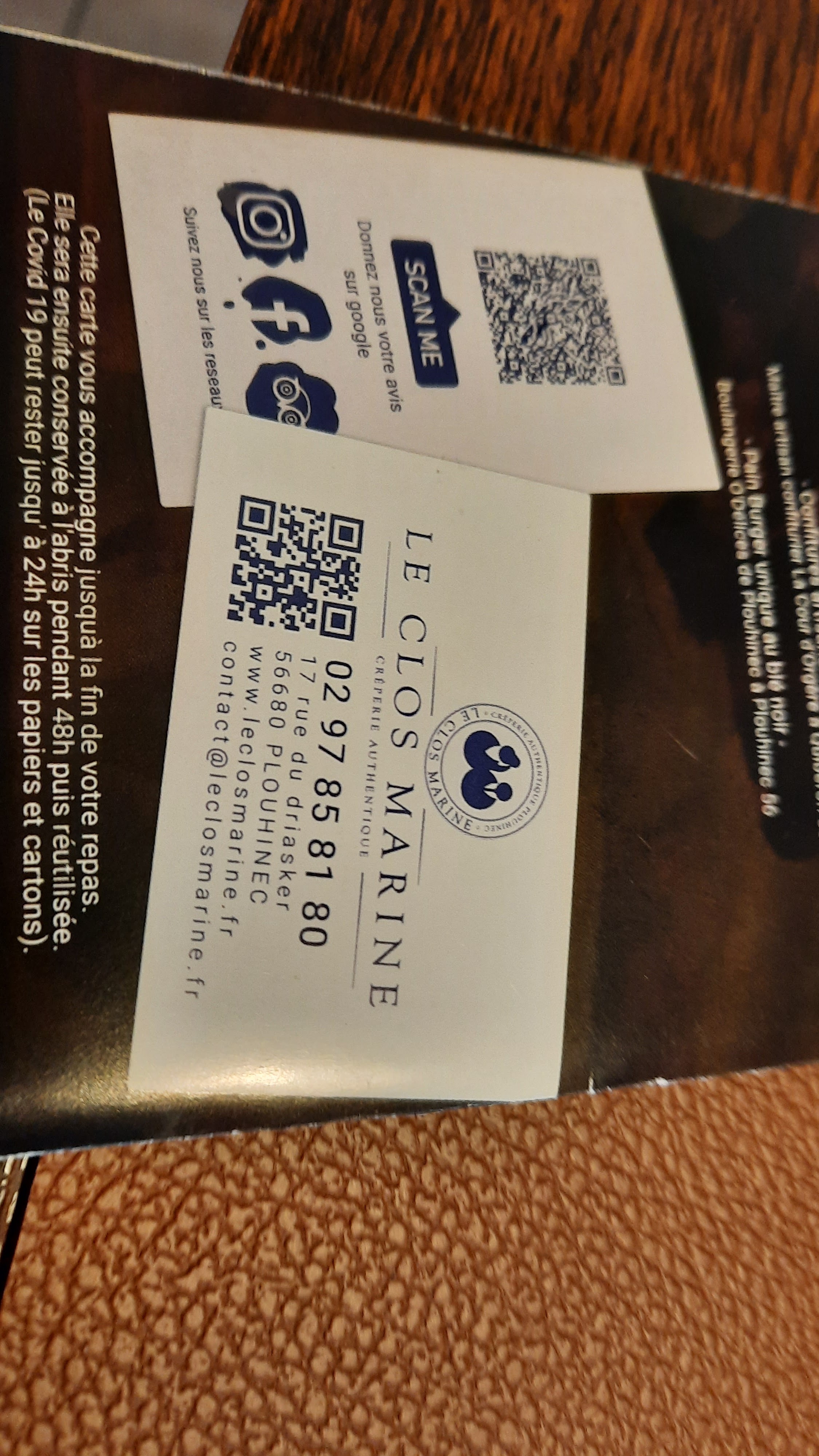 Le clos marine est un lieu superbe on passe un moment fort agréable. Si comme moi vous êtes sensible aux détails, vous adorerez le soin apporté au bien être des clients. Du jardin aux toilettes en passant par la salle, rien n'a été laissé au hasard. Pas de fausse note... Que dire également des galettes et crêpes qu'on y découvre. Elles sont toutes très belles, originales et très bonnes. La carte des boissons est aussi très complète avec un choix de cidres important. Pas de panique pour les budgets modestes, les prix sont raisonnables. J'invite très vivement les patrons de crêperie des environs à venir découvrir ce lieu et cette cuisine qui méritent d'être imités dans toute la Bretagne pour notre plus grand plaisir.