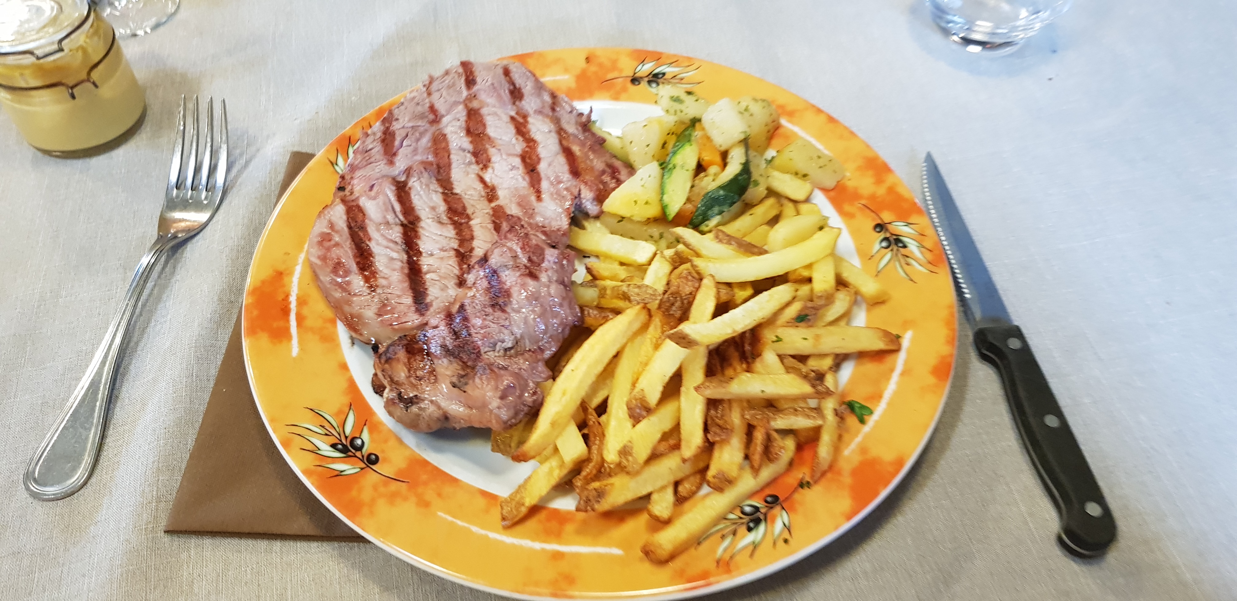 Bonne viande si on aime la viande grillée à la flamme (goût flammé très prononcé) et frites maison. En revanche le poisson en papillote servit dans son plastique est à éviter (goût fort de vieux poisson sans assaisonnement avec riz complet nature sec et trop cuit). Oeufs mayo à éviter également (jaunes entourés de bleu par séjour prolongé au frigo et mayo industrielle sans saveur avec salade amer...) il faut rester dans les spécialités pour ne pas être déçu. Mention spéciale pour la mousse au chocolat. Un peu cher.