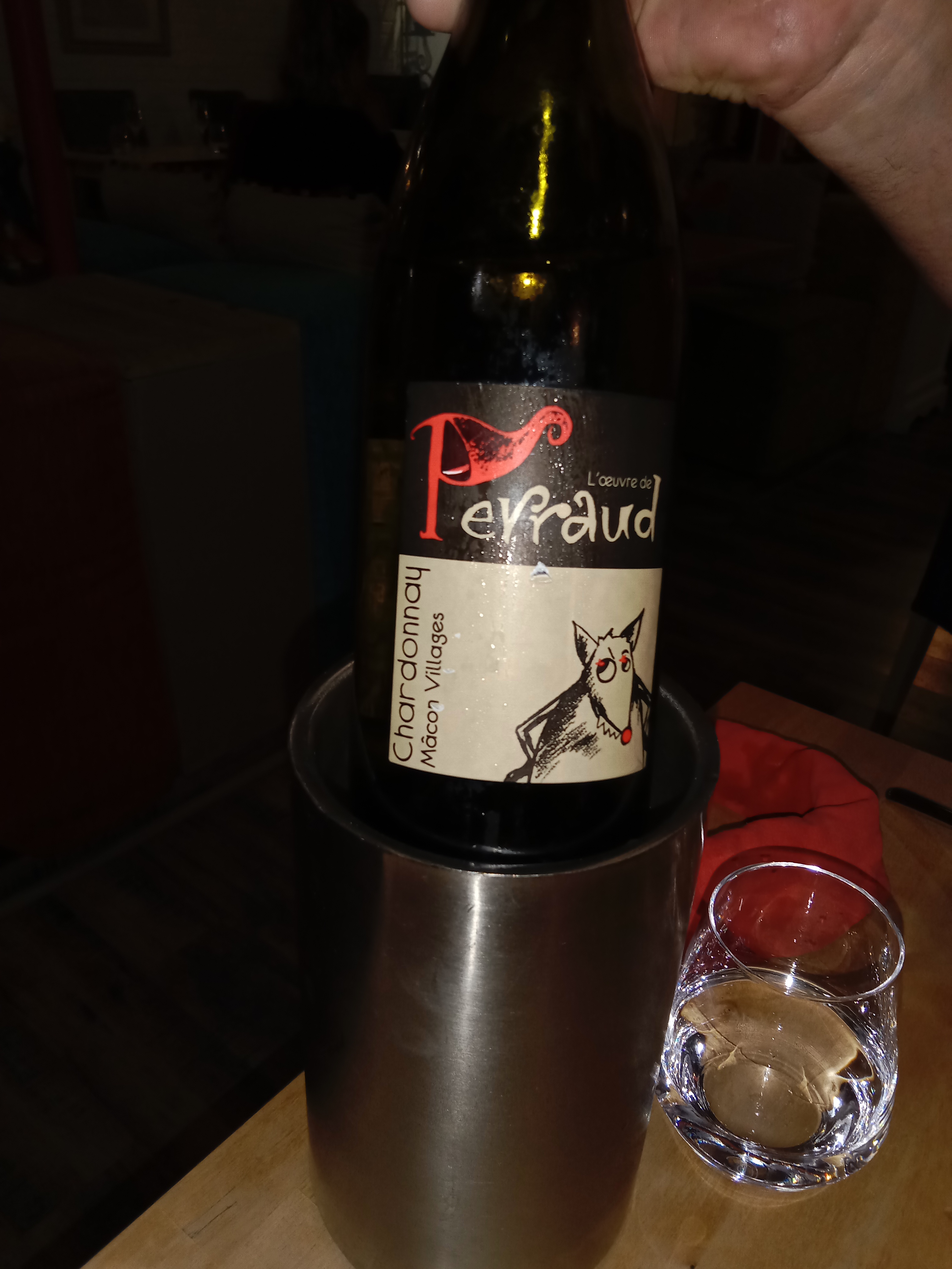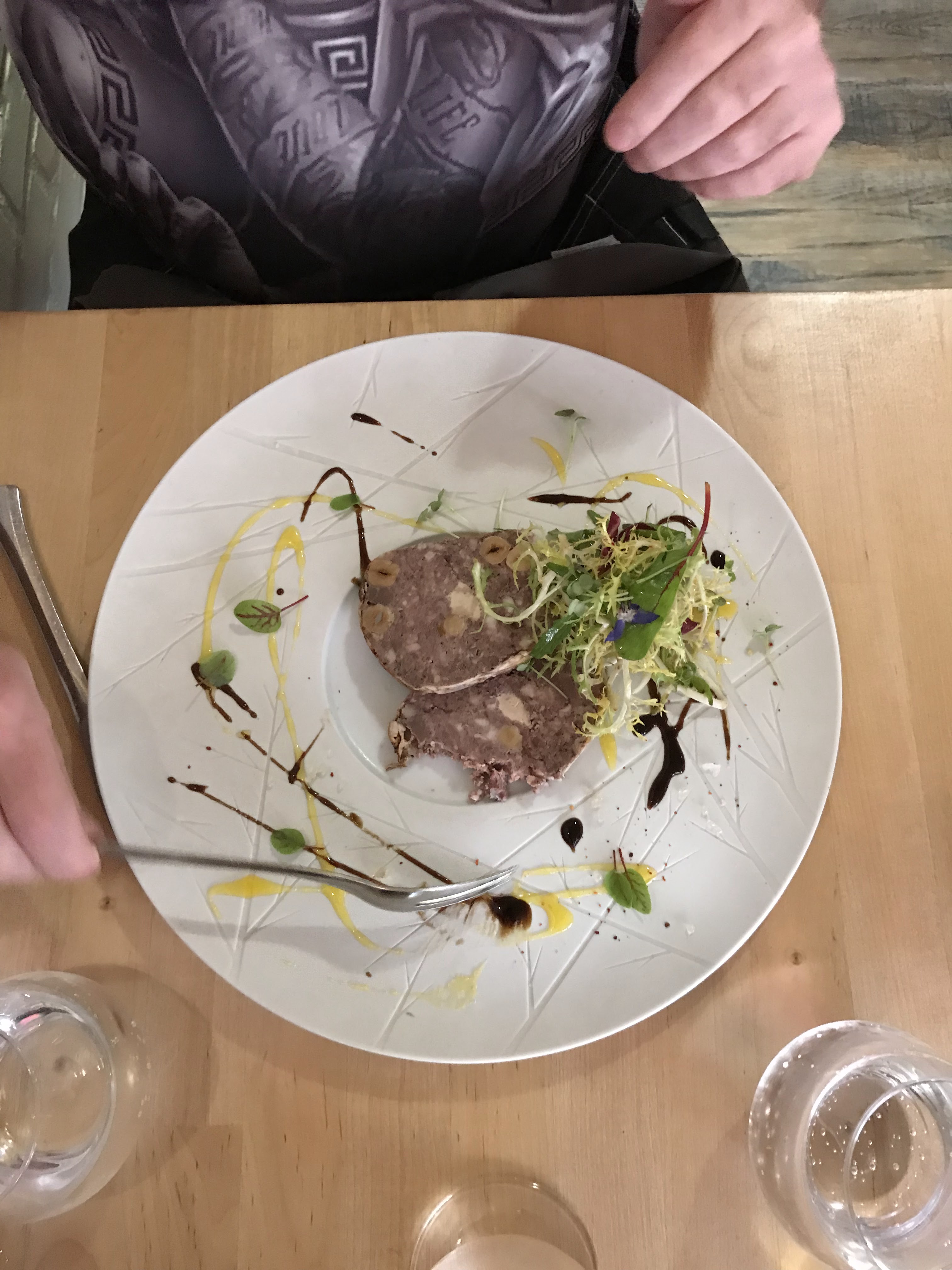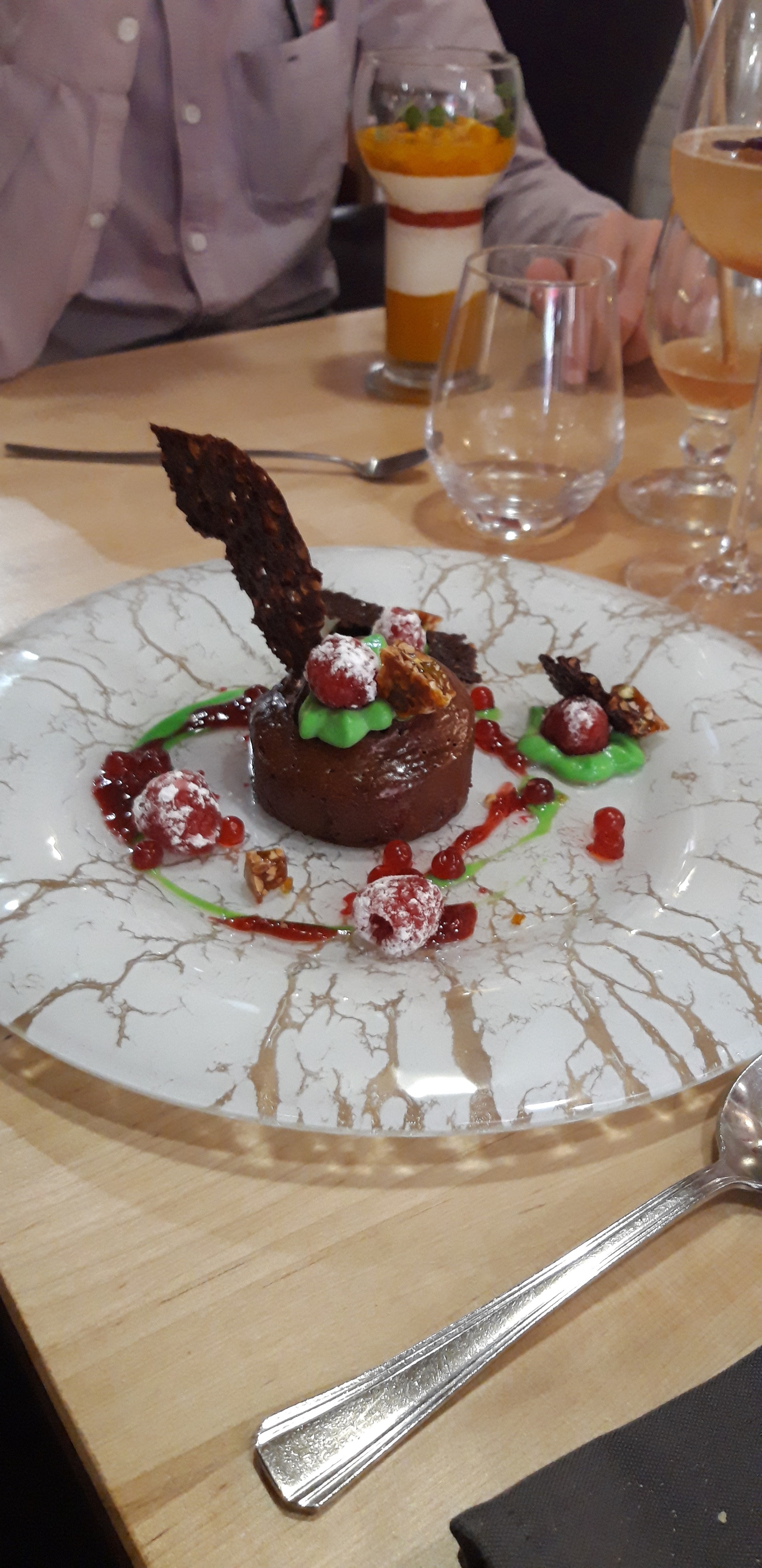 Accueillie par le chef et 2 copains. Choyée par la Dame. Je me suis sentie en famille et j’ai bien senti que ce qui était sur la table était délicieux. Mes maîtres se sont régalés et du coup m’ont un peu oubliée. Je n’ai reçu que des miettes... Le chef est venu faire son tour de piste et a fait rire mes maîtres : quel clown !Moi je suis restée sage, je n’ai pas fait le cirque
