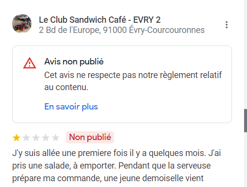 APPARAMENT, CET ETABLISSEMENT EST DERANGE PAR LES AVIS NEGATIFS, CAR MON AVIS A ETE SUSPENDU ! Mais ne vous inquietez pas, je ne vous oublie pas ! ;) . Du coup, le revoici :D J'y suis allée une premiere fois il y a quelques mois. J'ai pris une salade, à emporter. Pendant que la serveuse prépare ma commande, une jeune demoiselle vient demander gentiment et discrètement si elle pouvait avoir une verre d'eau. A ma grande surprise, la serveuse lui a dit que non, que c'était réservé à la clientèle. Face à ce manque cruel d'humanité, je n'ai pas pu rester sans rien faire. J'ai donc demandé à la serveuse un verre d'eau pour moi car j'avais commandé une salade, j'ai rattrapé la demoiselle et je lui ai dis qu'elle pouvait prendre le verre d'eau. Ceci devant les yeux médusés de la serveuse. Il faut croire qu'en 2021, faire preuve de bonté et de gentillesse, ca choque ! Je repasse devant ce lieu, en début de semaine. Et la que vois-je ? Un petit écriteau indiquant que les clients consommant uniquement un café ne peuvent rester sur place que 20 minutes. Qu-est-ce donc ? Maintenant les clients en salle sont chronométrés ? Est ce une blague ? Que nenni. Il y a également écrit sur ce petit panneau que les cafés ne sont pas accompagnés d'un verre d'eau. Je cherche alors la caméra cachée. Je n'ai jamais vu ca de ma vie. Aucun sens du service, aucune sympathie, quel est donc ce lieu ? Qui est le gérant? A t il eu des soucis dans son enfance avec les verres d'eau ? Un traumatisme ? Je cherche à comprendre comment on peut refuser un simple verre d'eau, que ce soit à des clients ou non. Aberrant. Un verre d'eau ne coute rien, que ce soit à l'entreprise ou aux employés! Bref, aller donner votre argent ailleurs !
