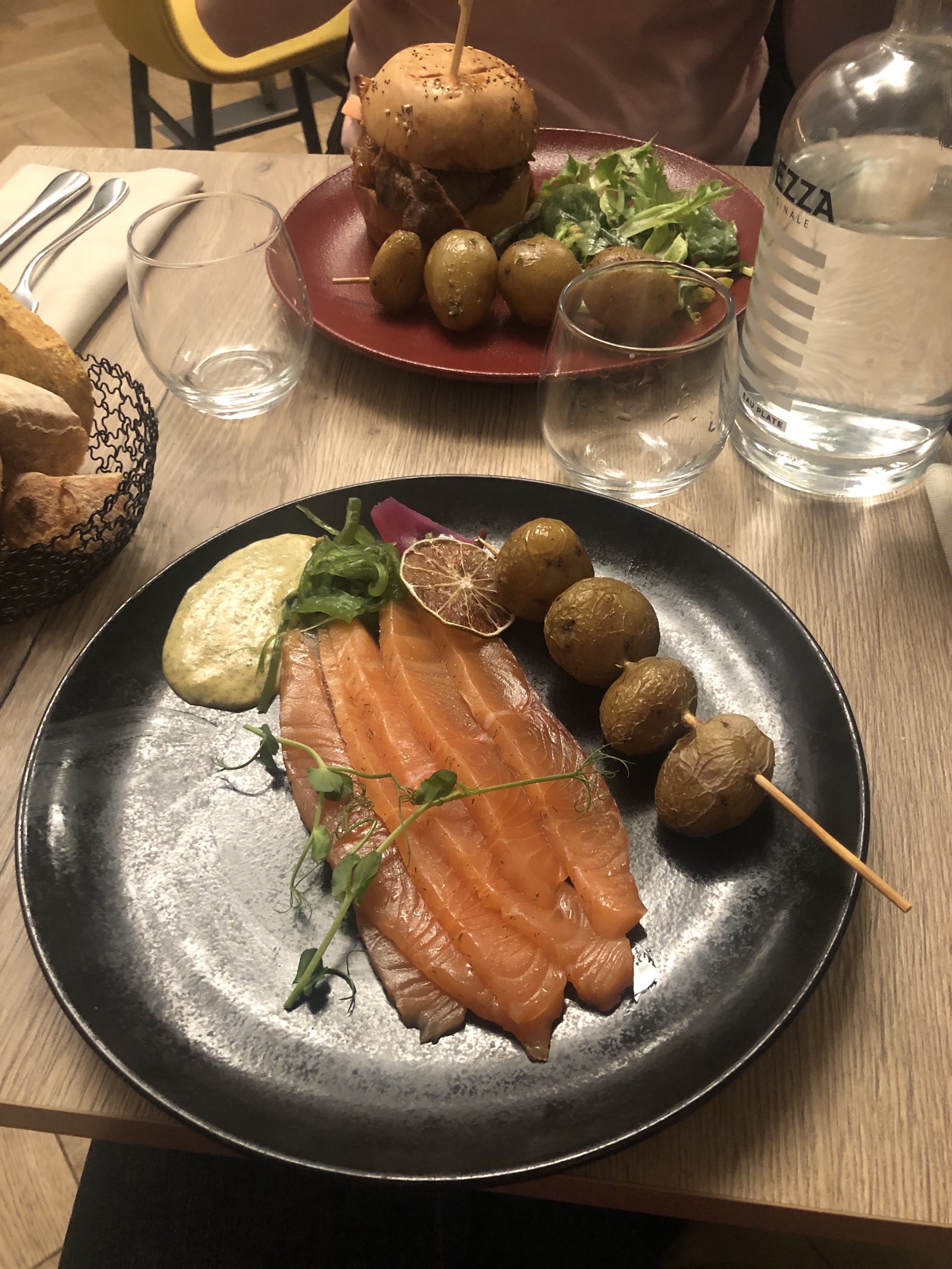 Le rapport qualité prix n’était malheureusement pas bon. Pour un burger à 16€, seulement un steak végétarien, une rondelle de tomate, une fine tranche de fromage, le tout était très sec. En accompagnement, les pommes de terres n’étaient pas cuites. Le dessert n’était pas à mon goût mais pas mauvais. Un plus pour le cadre qui est sympa.