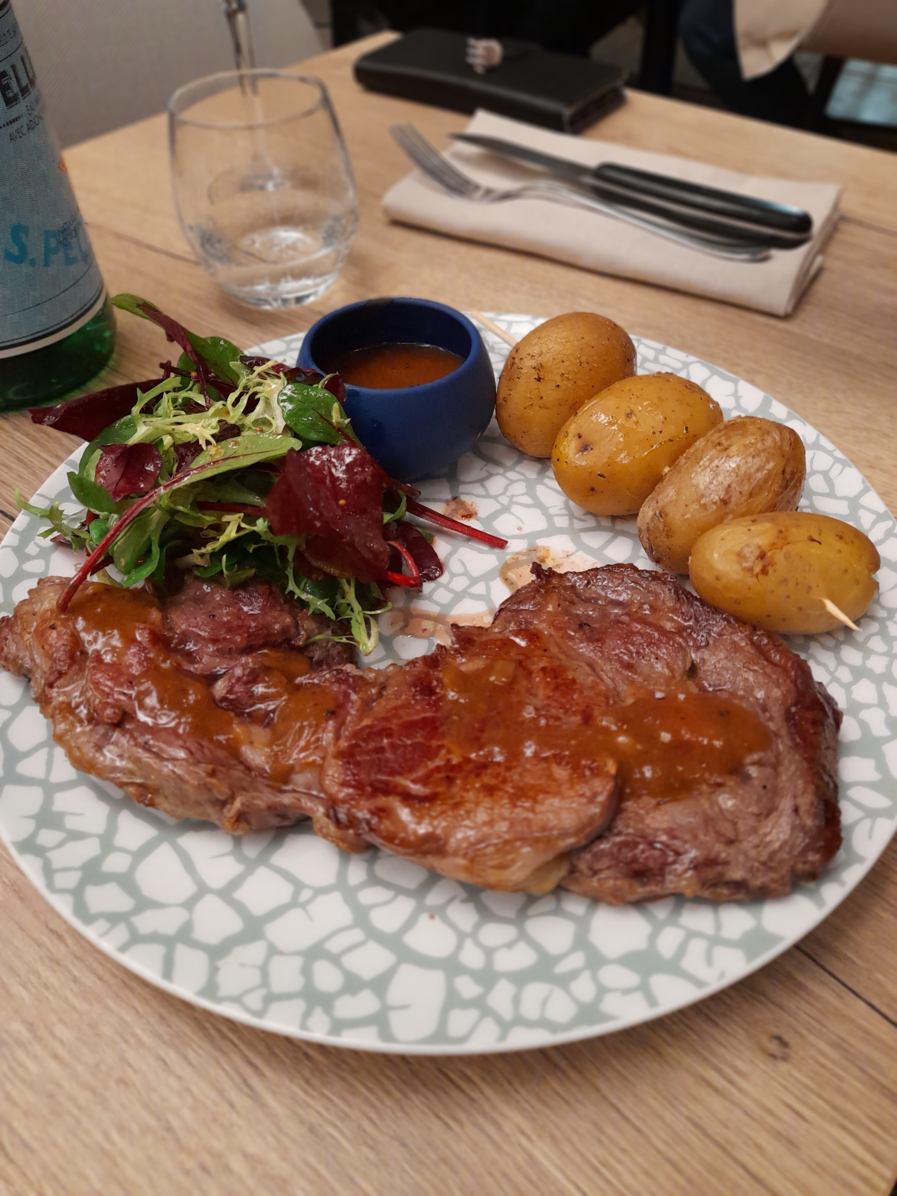 Service agréable, dynamique, avec un maître d'hôtel un peu vieux jeu dans son humour, tmtc. Déception sur l'entrée : la salade est mouillée et glacée, un oeuf poché froid aussi et sans goût 😧 le plat cependant - entrecôte et burger - étaient très bons et le dessert aussi !