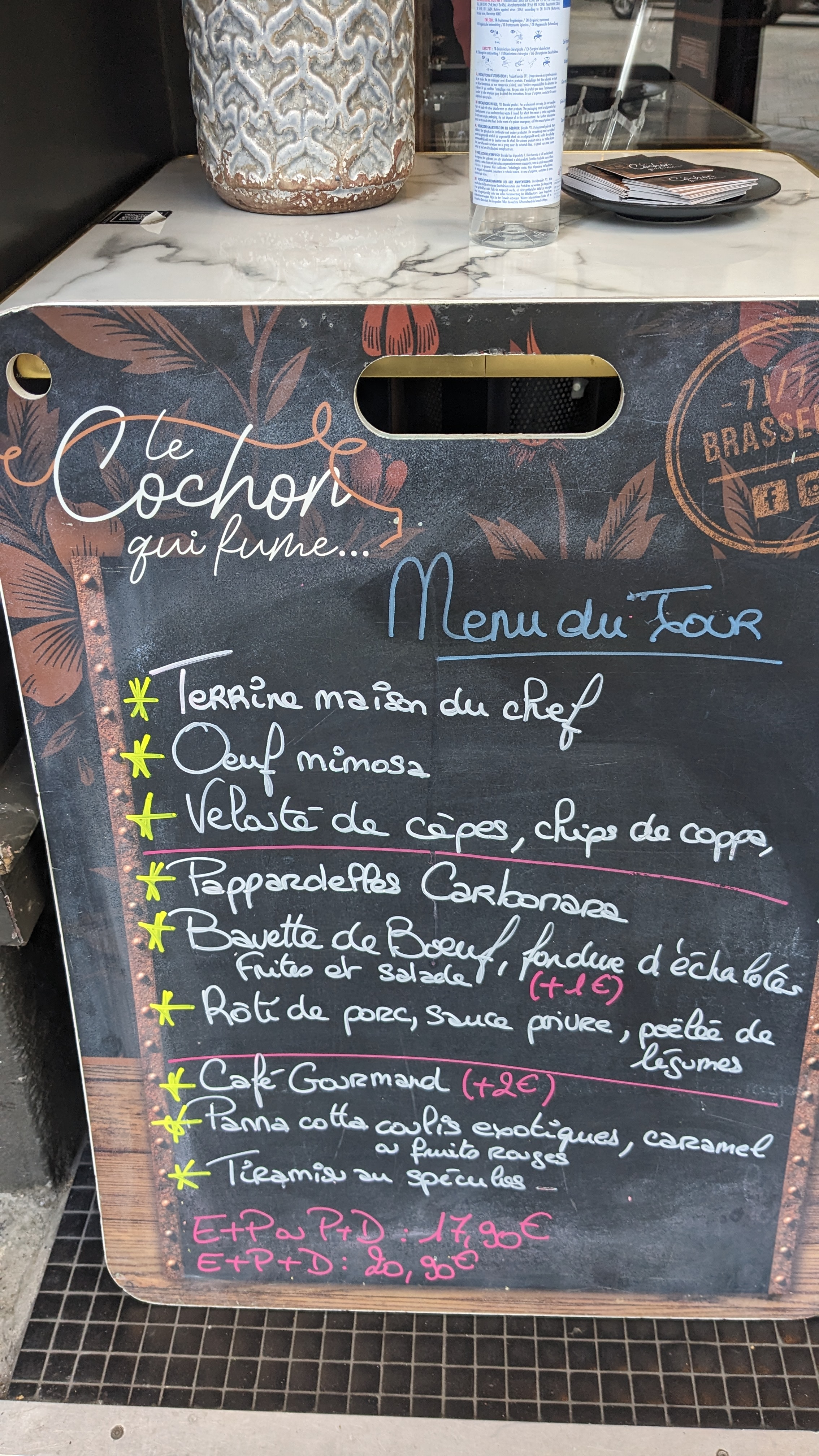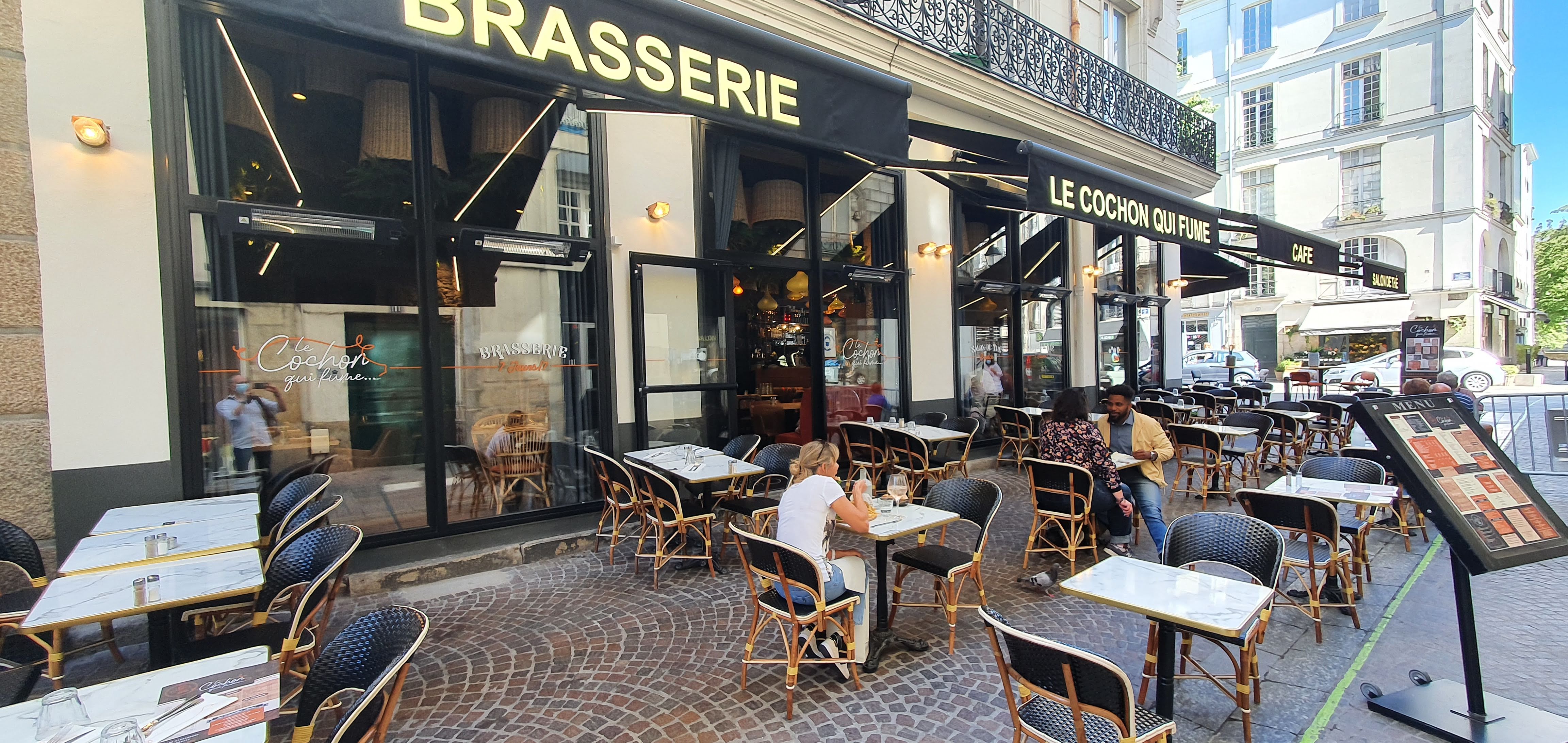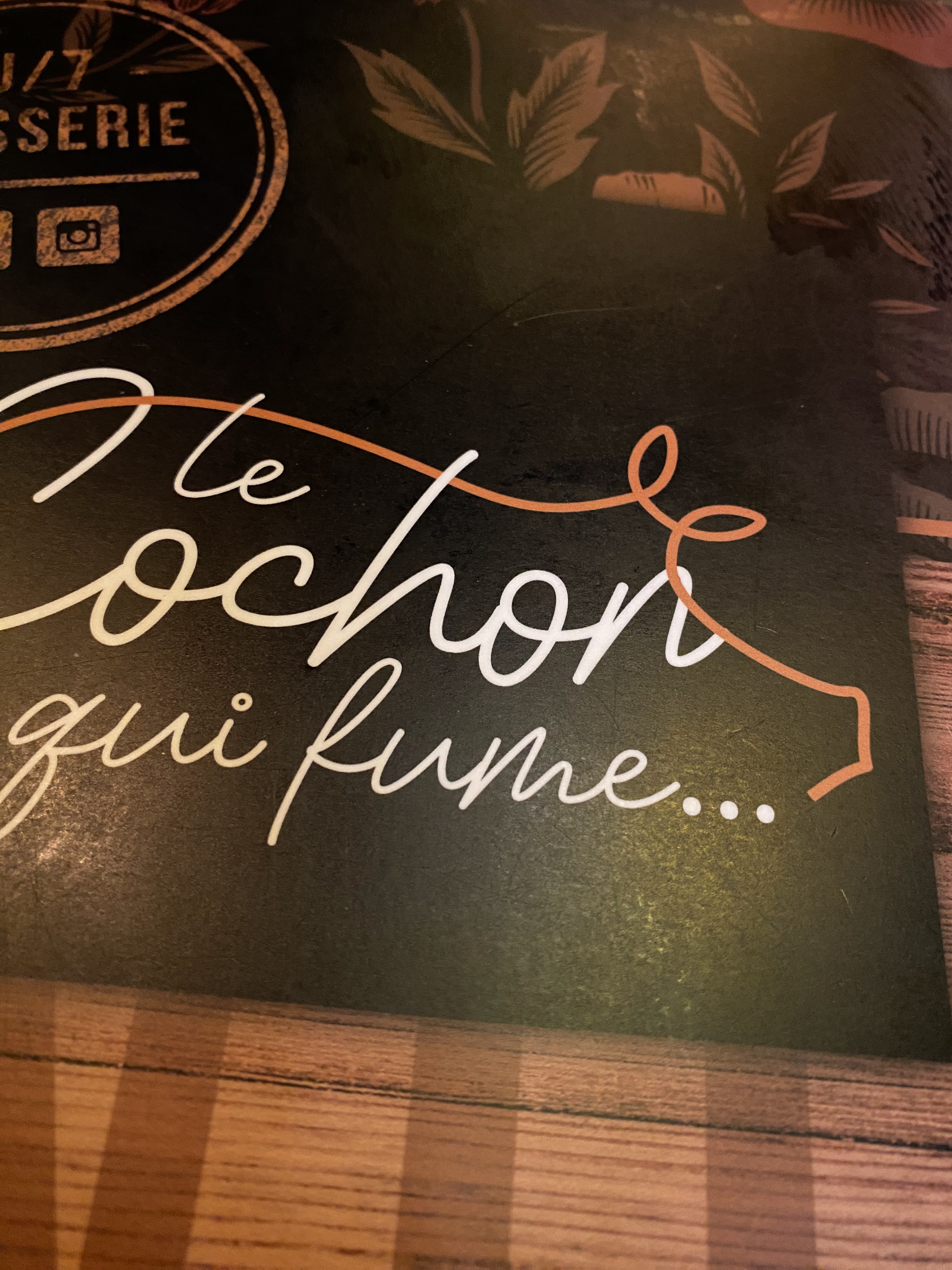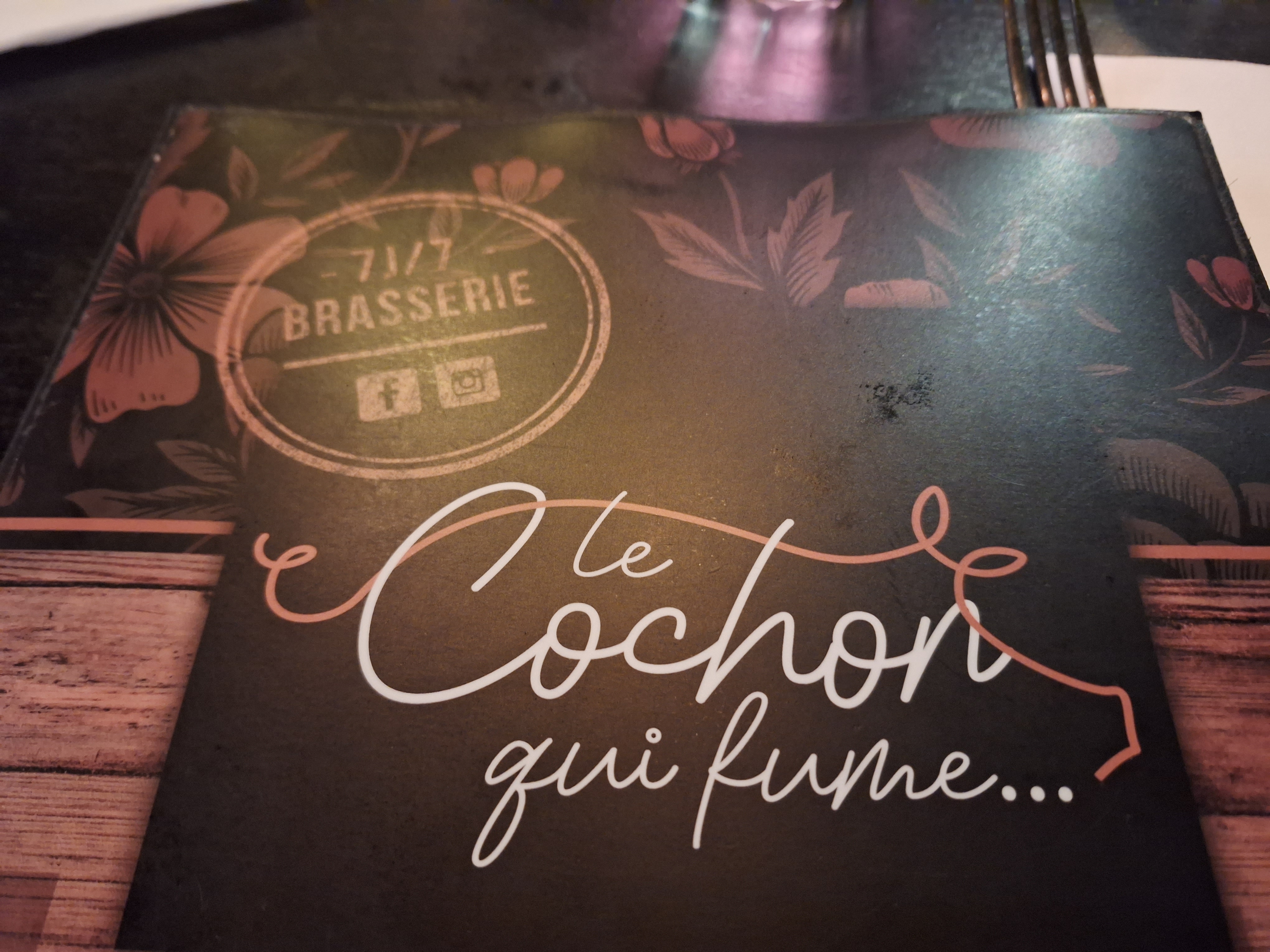 Le cochon qui fume. Belle terrasse à l ombre et belle salle de restaurant. Plusieurs choix se présente viandes, poissons et salades. Mon choix un tartare de saumon il était très généreux en quantité. Bien frais En dessert café gourmand. Simple et bon. En conclusion c est un restaurant où l on mange bien. C'est une bonne brasserie. Je recommande.