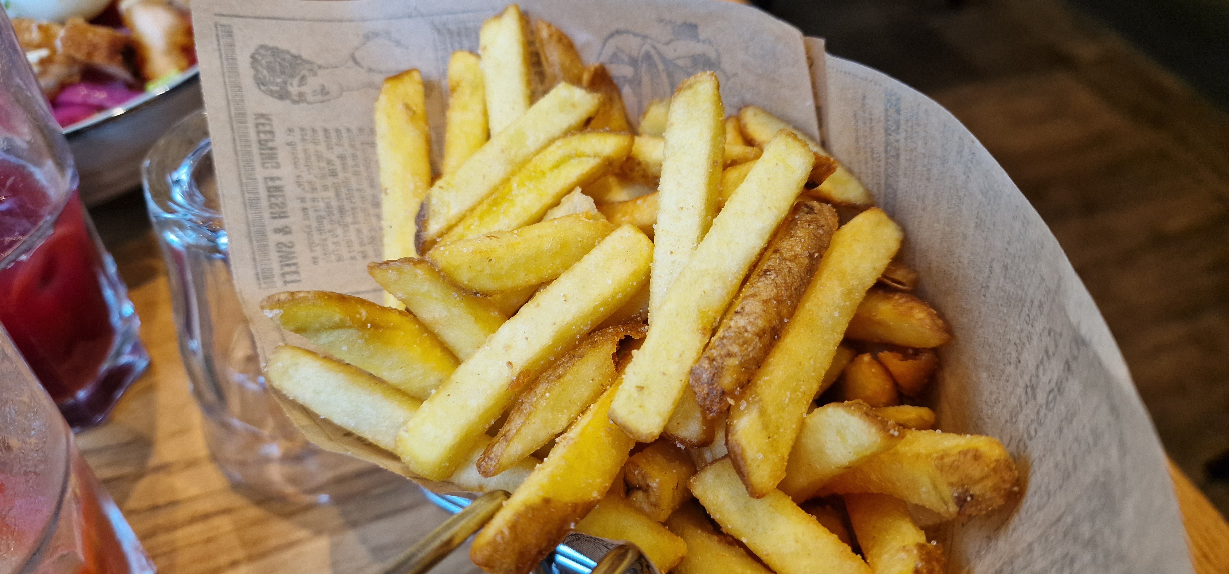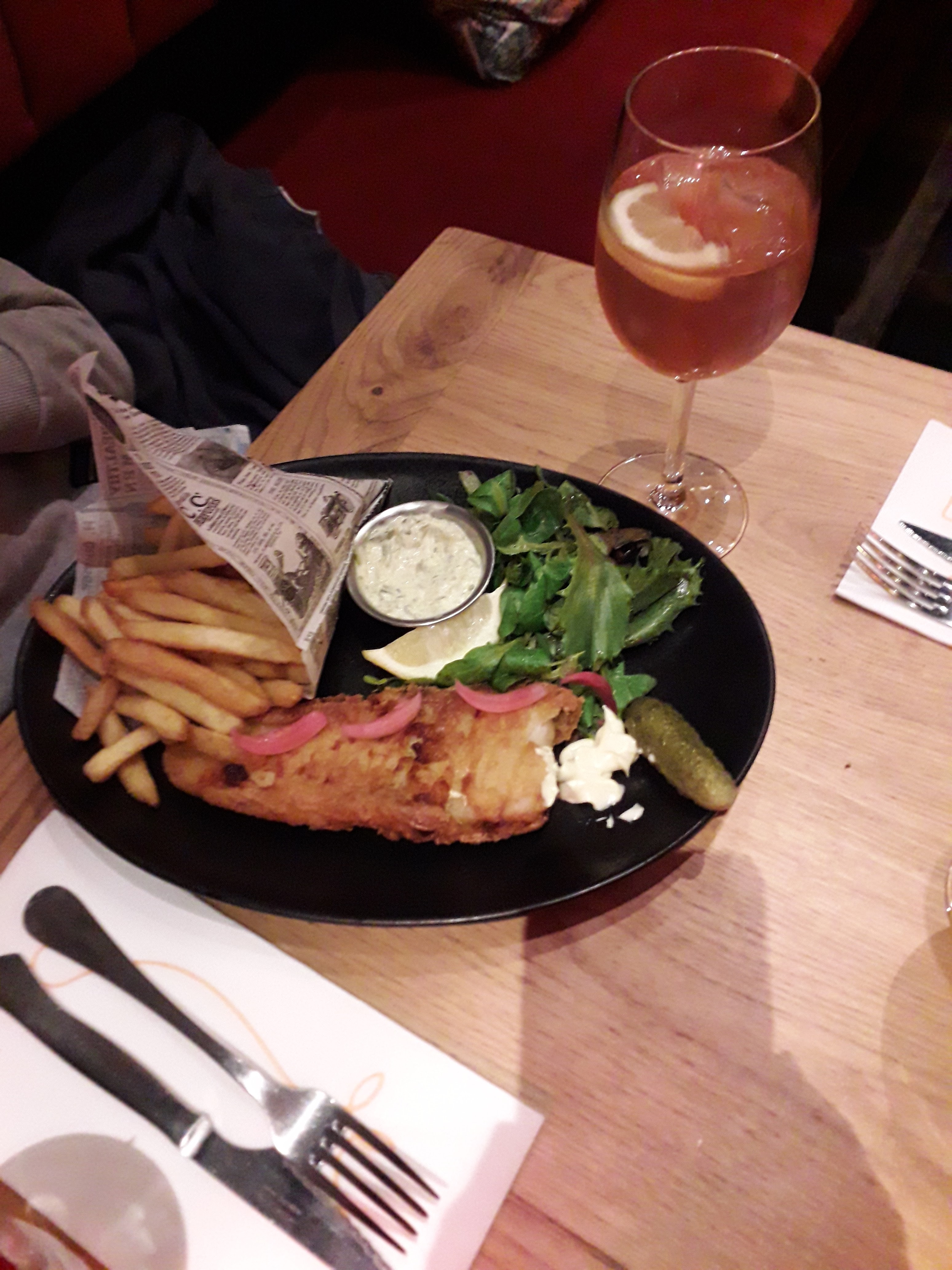 Tres bof deja je veux prendre une côte de boeuf individuelle et il ne savent pas faire la cuisson a point (venez chez moi je vous montrerai), c'est la première fois que ca m'arrive, ça doit etre de la viande précuite et rechauffé. Du coup je me rabat sur un fish and chips tres petit vue les 17 euros. Je commande un rosé servi chaud (enfin temperature ambiante a 24 degrés) sans eau ni glacon. Donc on en ai resté la et on ne retentera pas l'expérience.