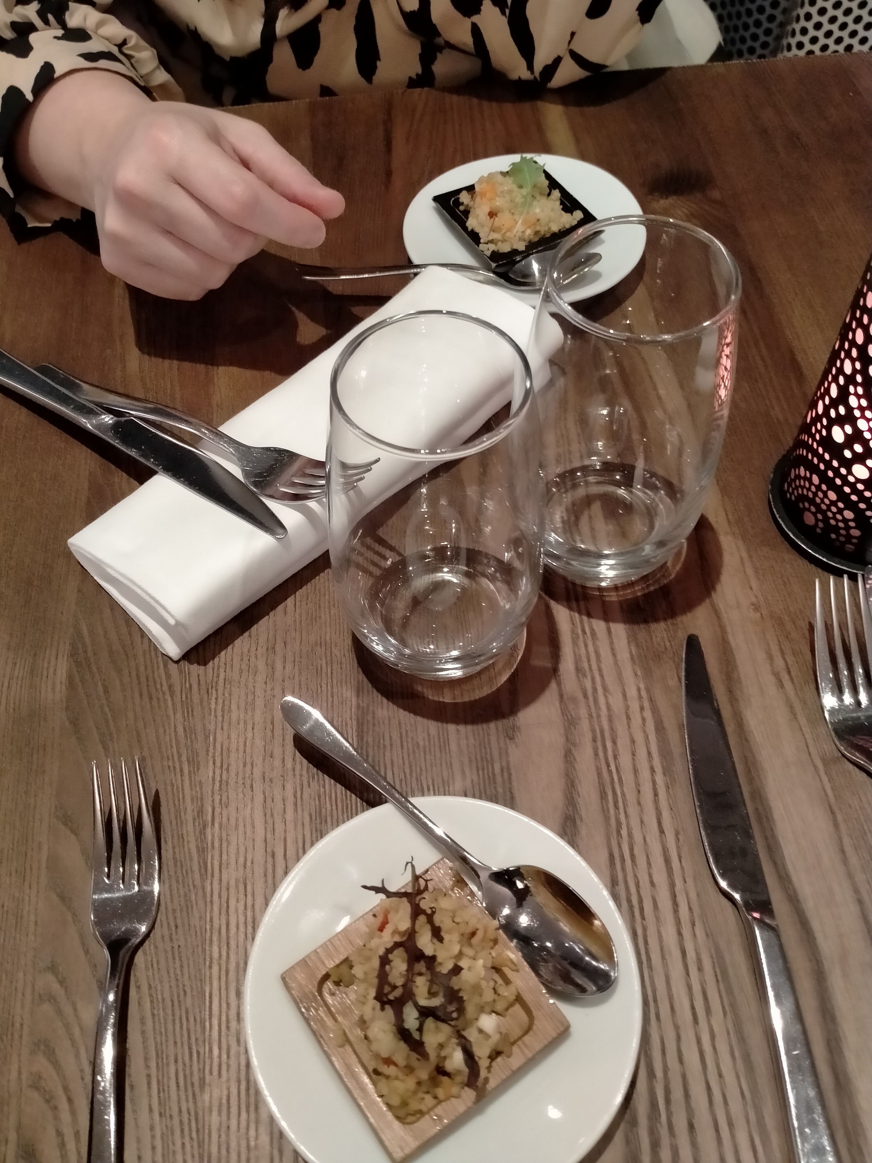 catastrophique ! pas de cocktails possible, pas le droit aux plats sur la carte mais seulement au menu unique (alors que nous venions justement pour la carte), 45 minutes d'attente entre l'entrée et le plat pour se voir servir autre chose que ce que nous avions choisi ! nous n'avons pas prolongé le supplice et sommes partis après avoir avalé notre portion ridiculement petite...le tout servi par 2 serveuses peu aimables, et délestés tout de même de 70e... a fuir absolument!