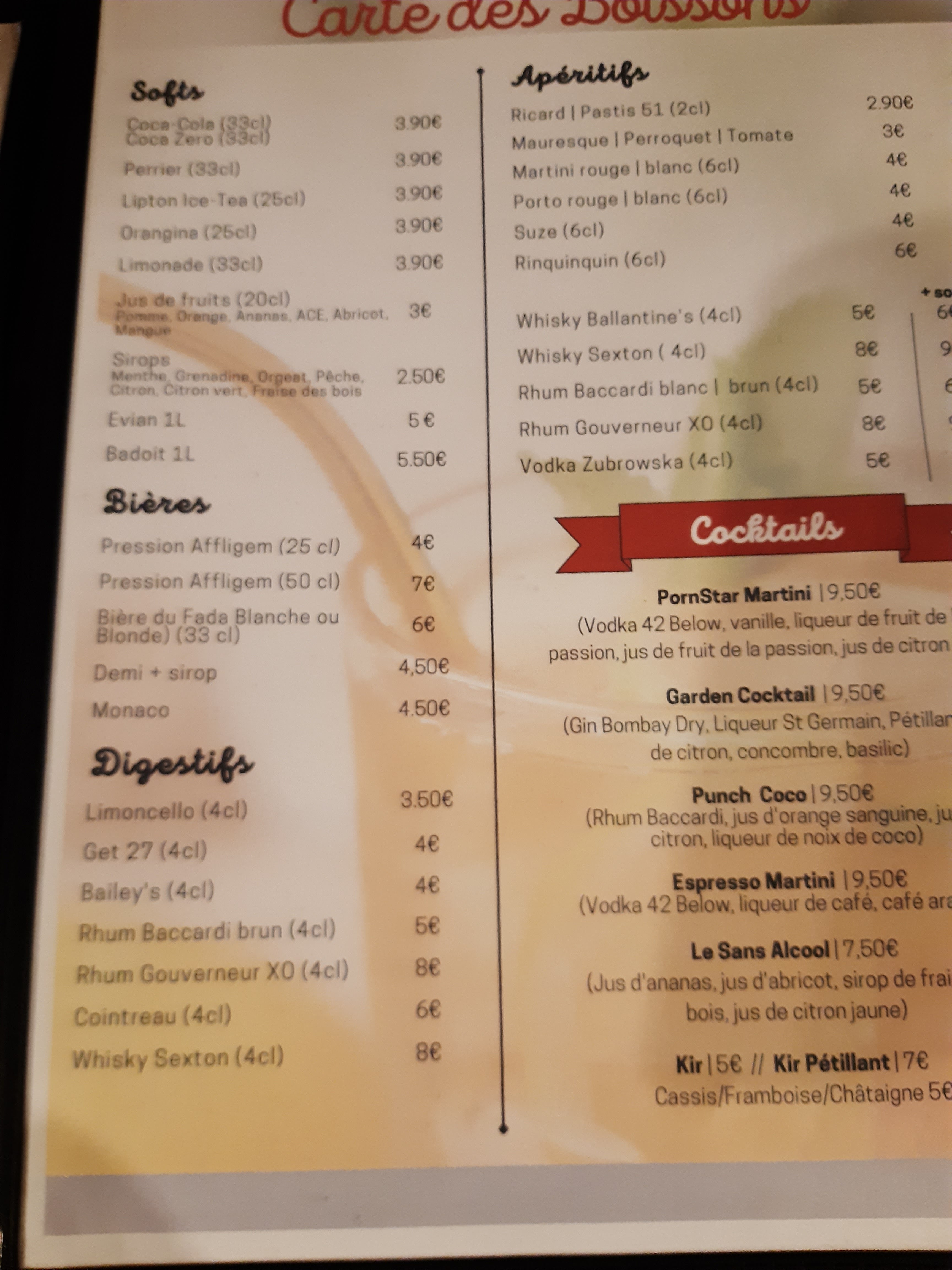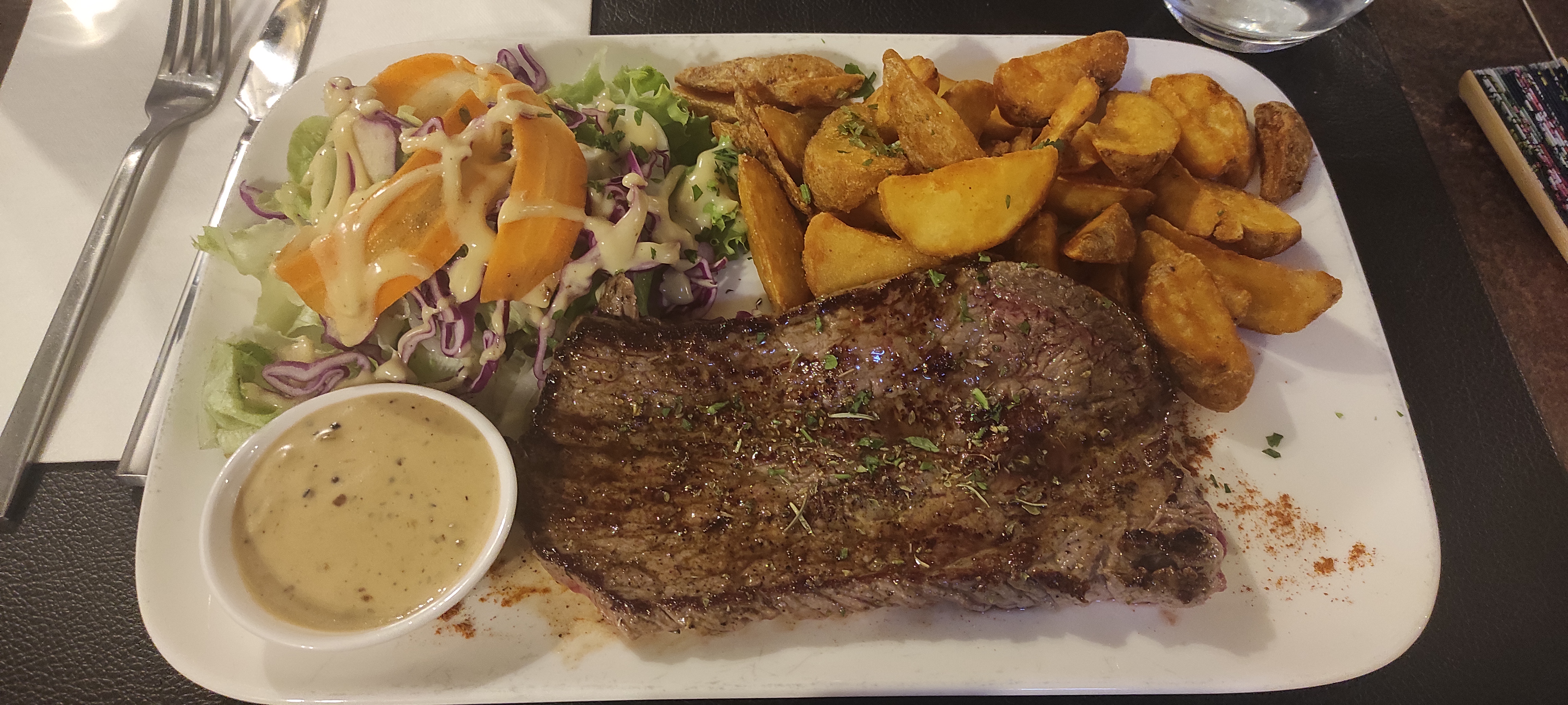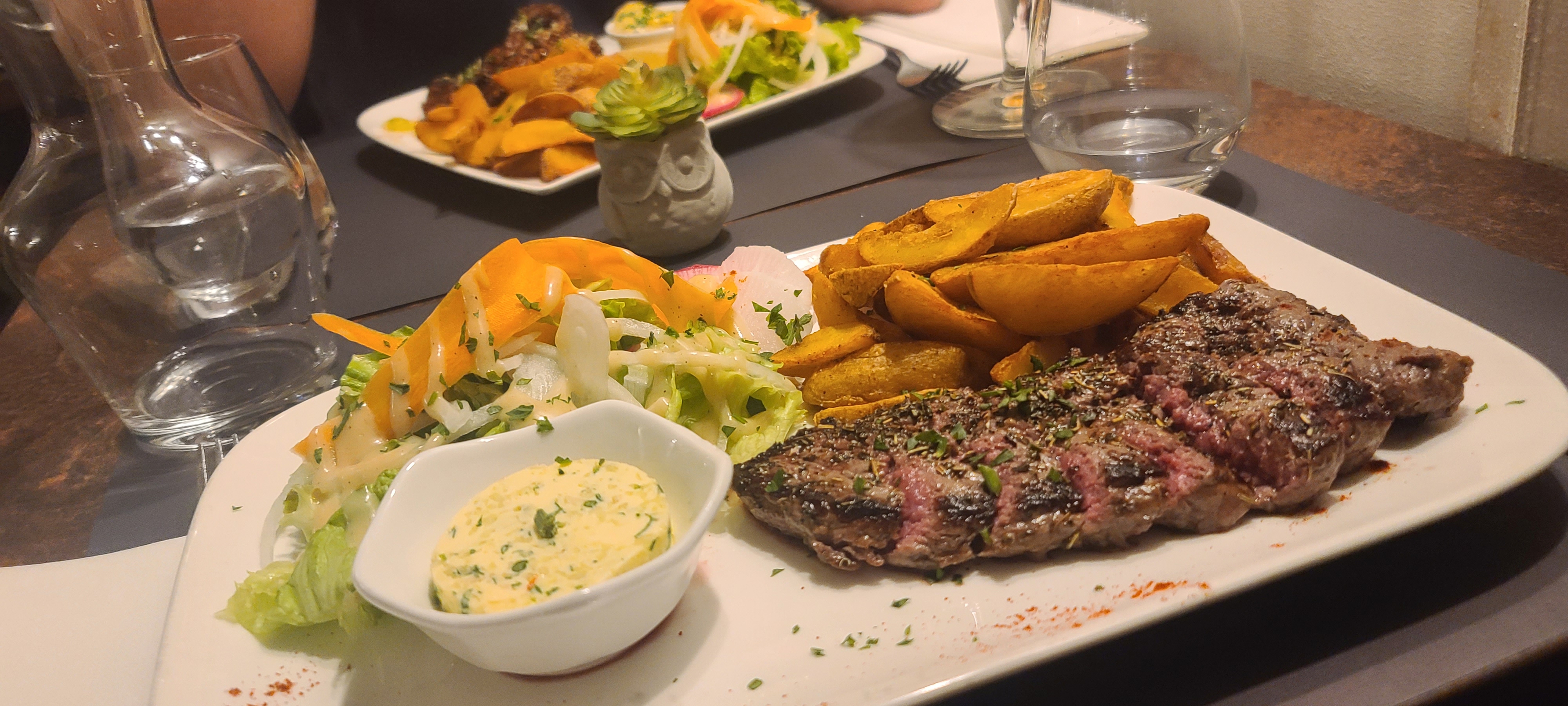Une carte sans une multitude de plats , synonymes d’un resto de qualité , et en effet des côtelettes d’agneau généreuse avec une sauce délicieuse et une purée au chorizo étonnante, un pave de taureau très bon et en dessert des cafés gourmands avec de bonnes petites pâtisseries, je recommande vivement Merci