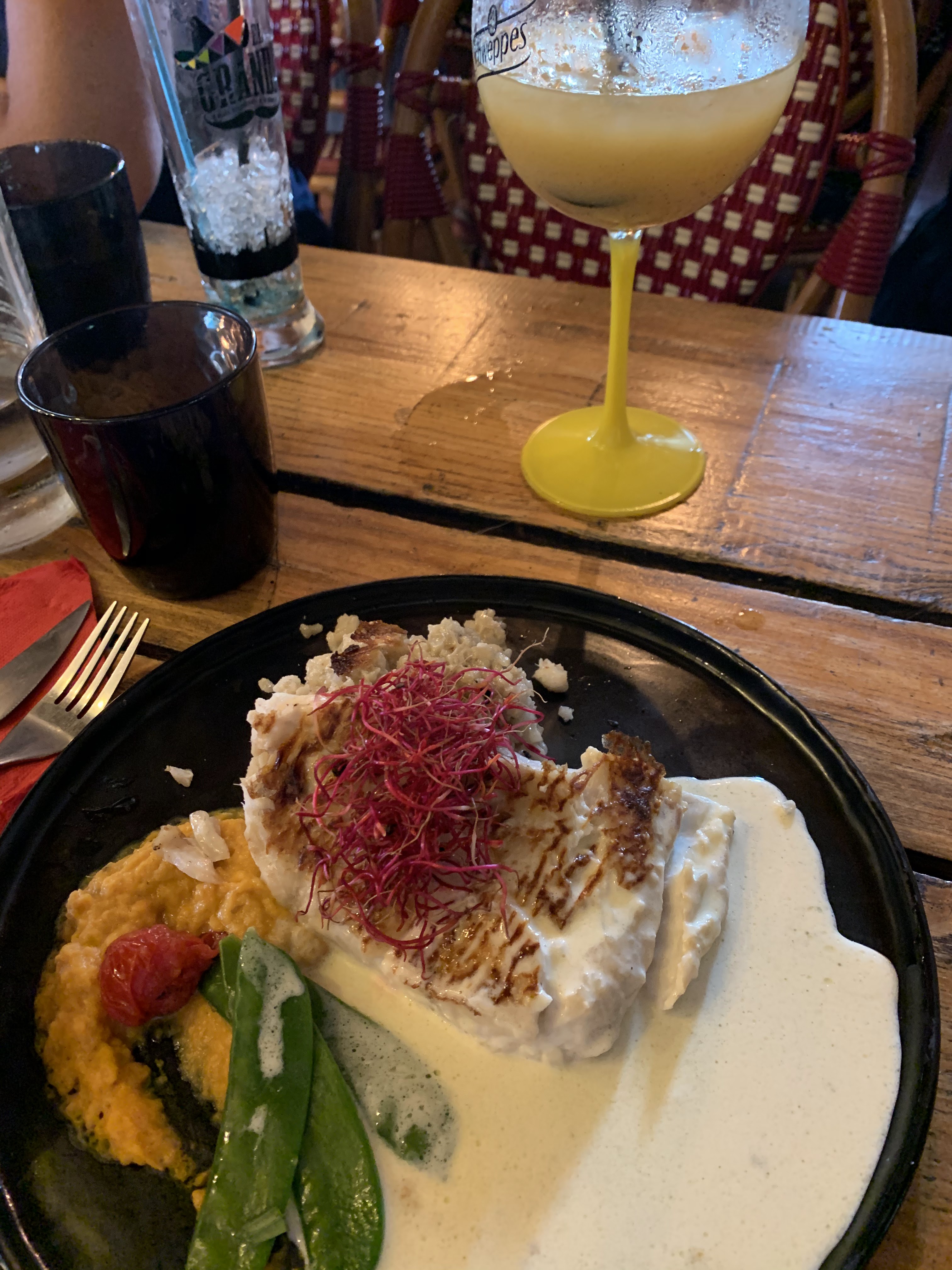 Ce soir je sors de ma zone de confort et j'ai décidé de découvrir un nouveau restaurant qui n'est pas sur le port mais devant lequel je suis déjà passé 100 fois... sans m'arrêter. Coupe de champagne ok mais pas super extraordinaire. La bière licorne Black est pour sa part super bonne. Plat du jour Burger au lieu jaune pané. Super bon avec un léger goût de citron. Dessert... glace mais au yaourt bulgare , caramel beurre salé... et gingembre... une explosion en bouche. Cela m'a rappelé de bons souvenirs de mes 3 années à Tahiti pour le dernier parfum ! A découvrir sans hésitation... A la prochaine mais en famille cette fois ci.