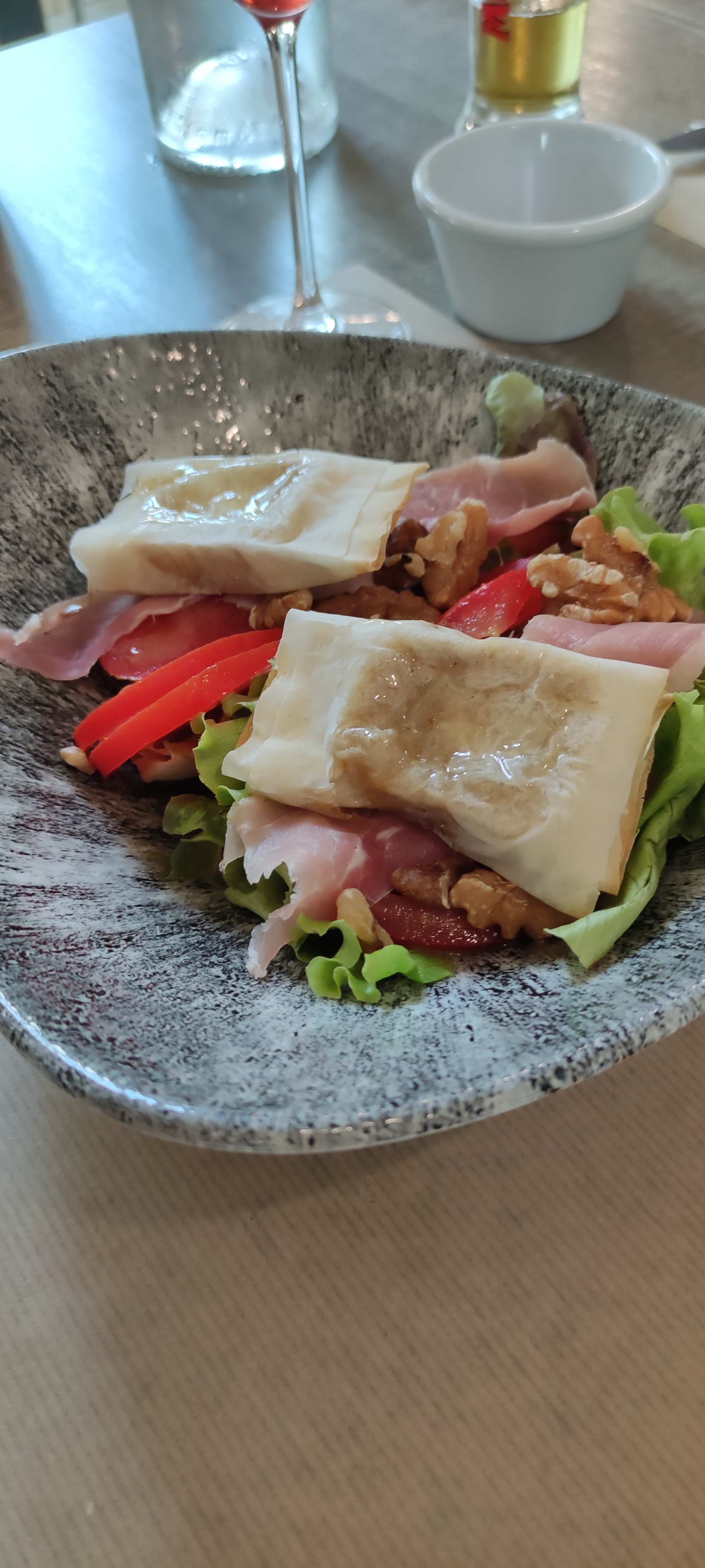 Salades copieuse fraîche et gourmande (chèvre) et pizza fine et croustillante. Avec produit du terroir (jambon vendéen). Très bon, service agréable et efficace. Tout près de la maison de Cognac Courvoisier ;) très bien pour un déjeuner rapide, frais et gourmand