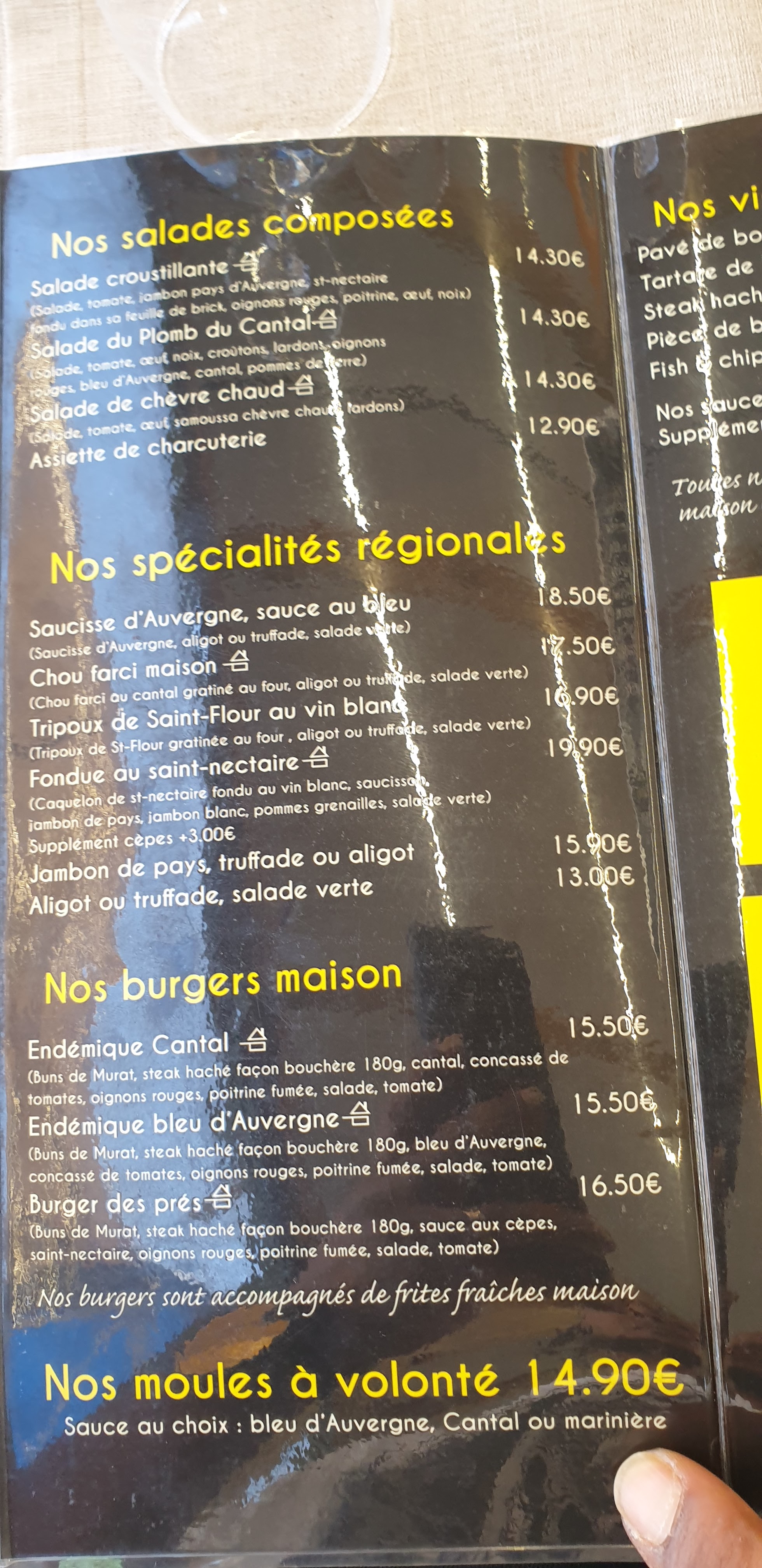 Bonne expérience serveur agréable avec le sourire Plats copieux spécialités de pays Perit bémol pour la pièce de bœuf viande origine UE on est dans le pays de la Salers quand même Mais tout le reste fait maison et de qualité