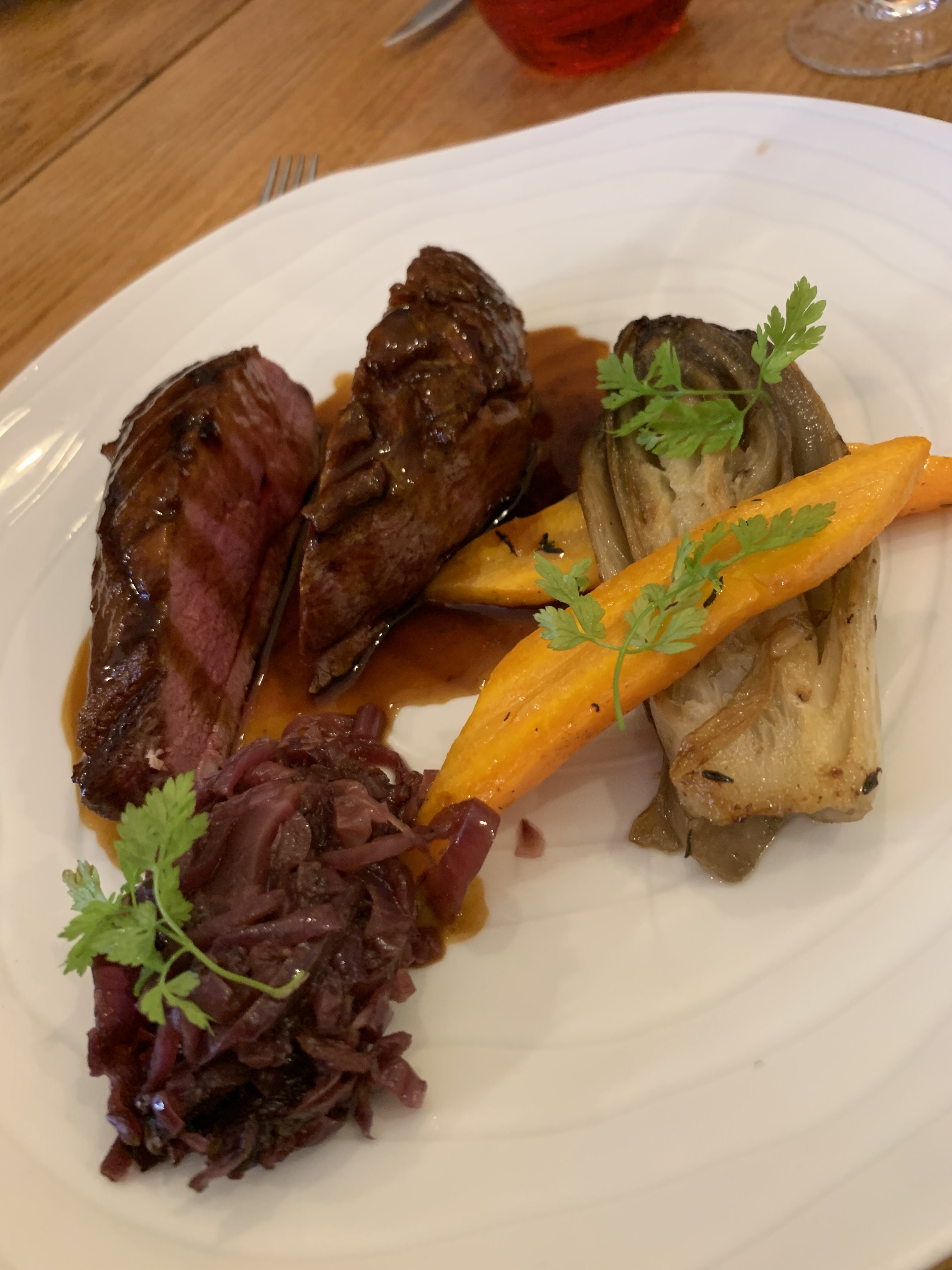 très bon accueil, on a très bien manger. Caneloni en entrée, frais et original, une pintade tendre et fondante, un agneau rosé excellent, et le dessert et à venir. Accompagné d’un St Julien a bonne température. Rien a redire , ou juste, allez y!!!