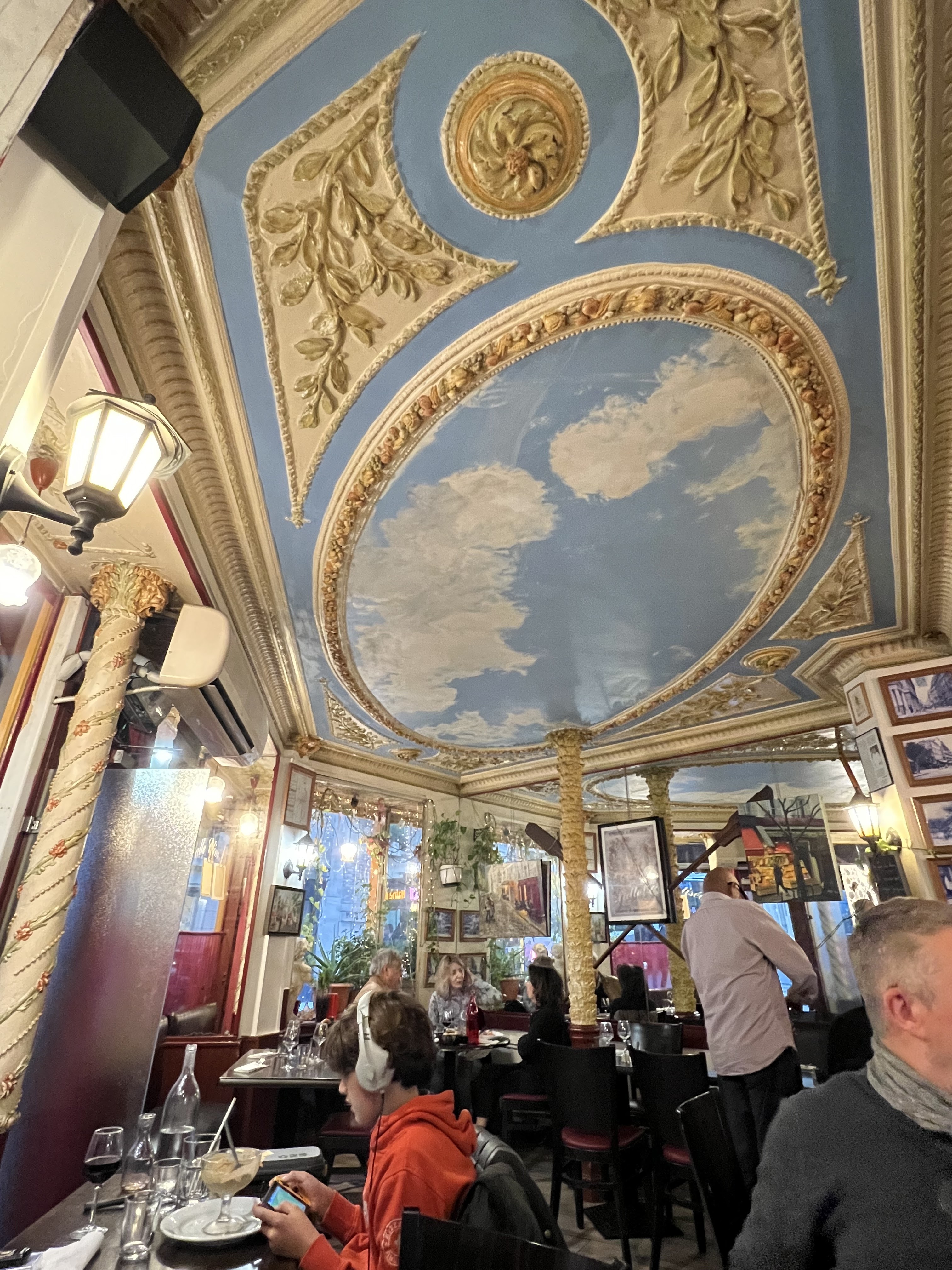 ❝ Restaurant d'angle pittoresque avec fresque au plafond, servant plats classiques de brasserie tels que steak-frites et escargots. ❞