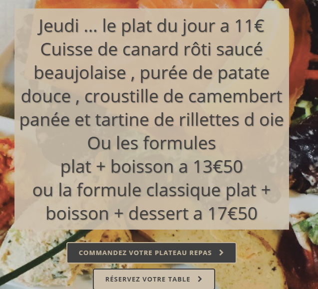 Bistrot français adapté aux travailleurs en pause déjeuner. Menu express le midi : plat du jour + boisson à 13,50 €