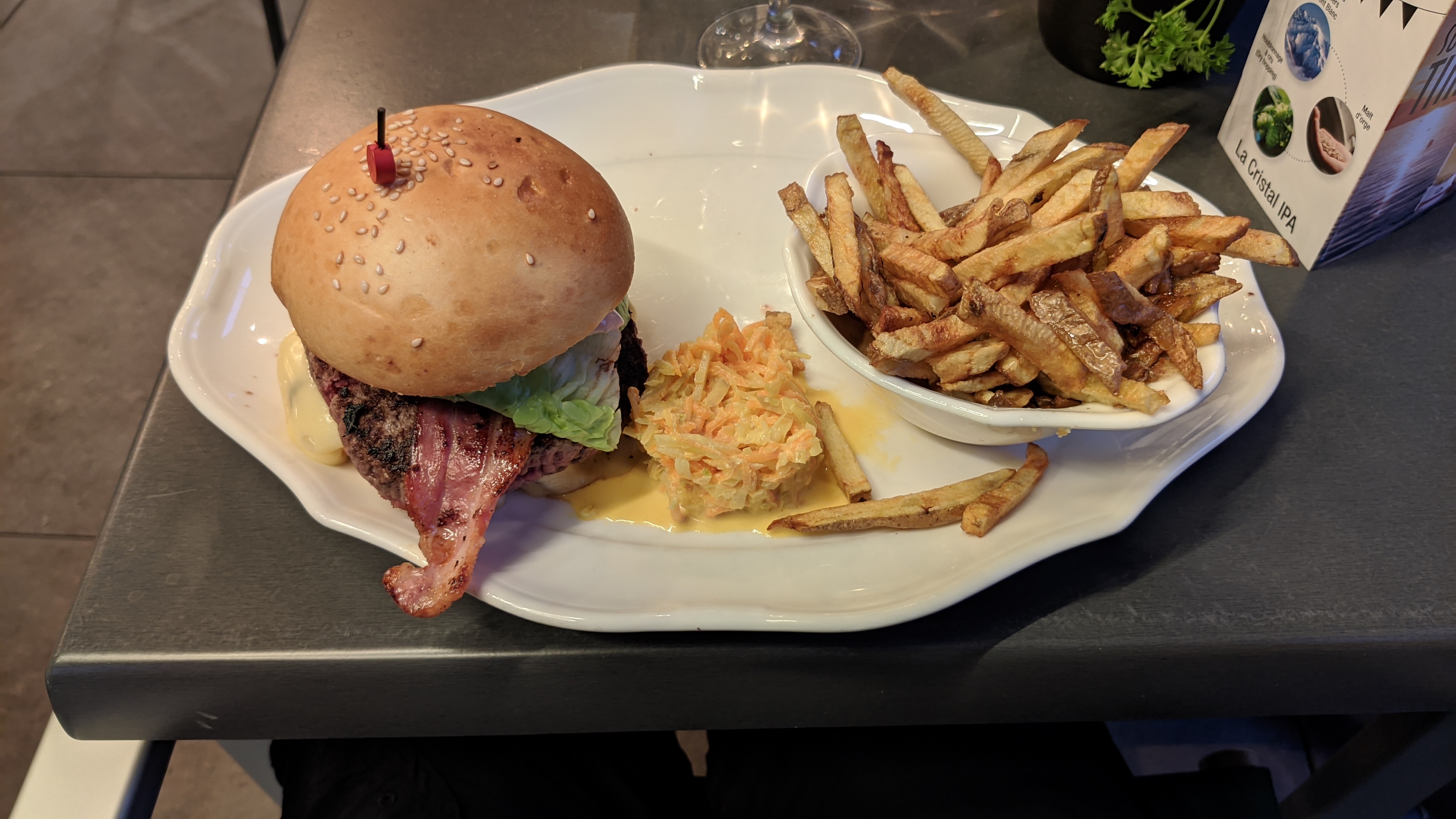 Nous sommes venus avec mon conjoint manger pour notre pause. Mon chéri a pris un Burger babe avec supplément steak et moi un nirvana avec poulet. Tout était incroyablement bon. Une cuisine maison de qualité avec des produits frais. Nous sommes encore surpris de la quantité des assiettes qui sont idéale pour des grand mangeurs. La bière du moment à la myrtille sensationnel. Un intérieur remarquable et chaleureux. Un service impeccable pour un pris plus qu’abordable. Nous reviendrons avec grand plaisir ! Nous vous recommandons à 1000%