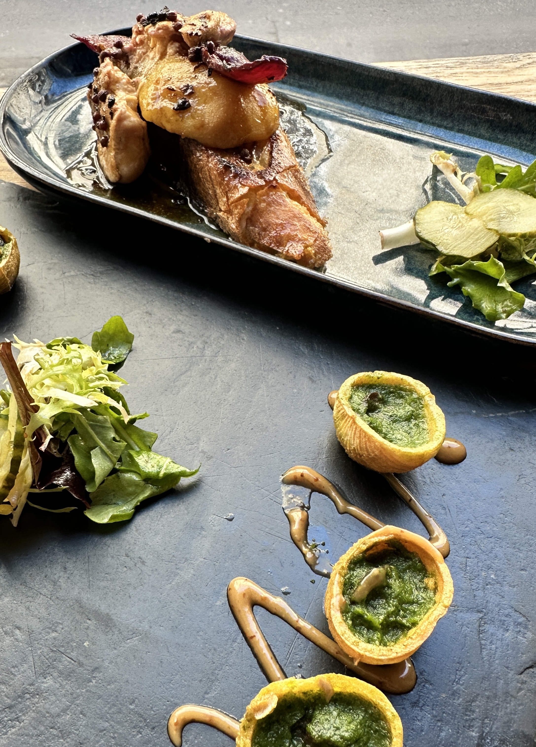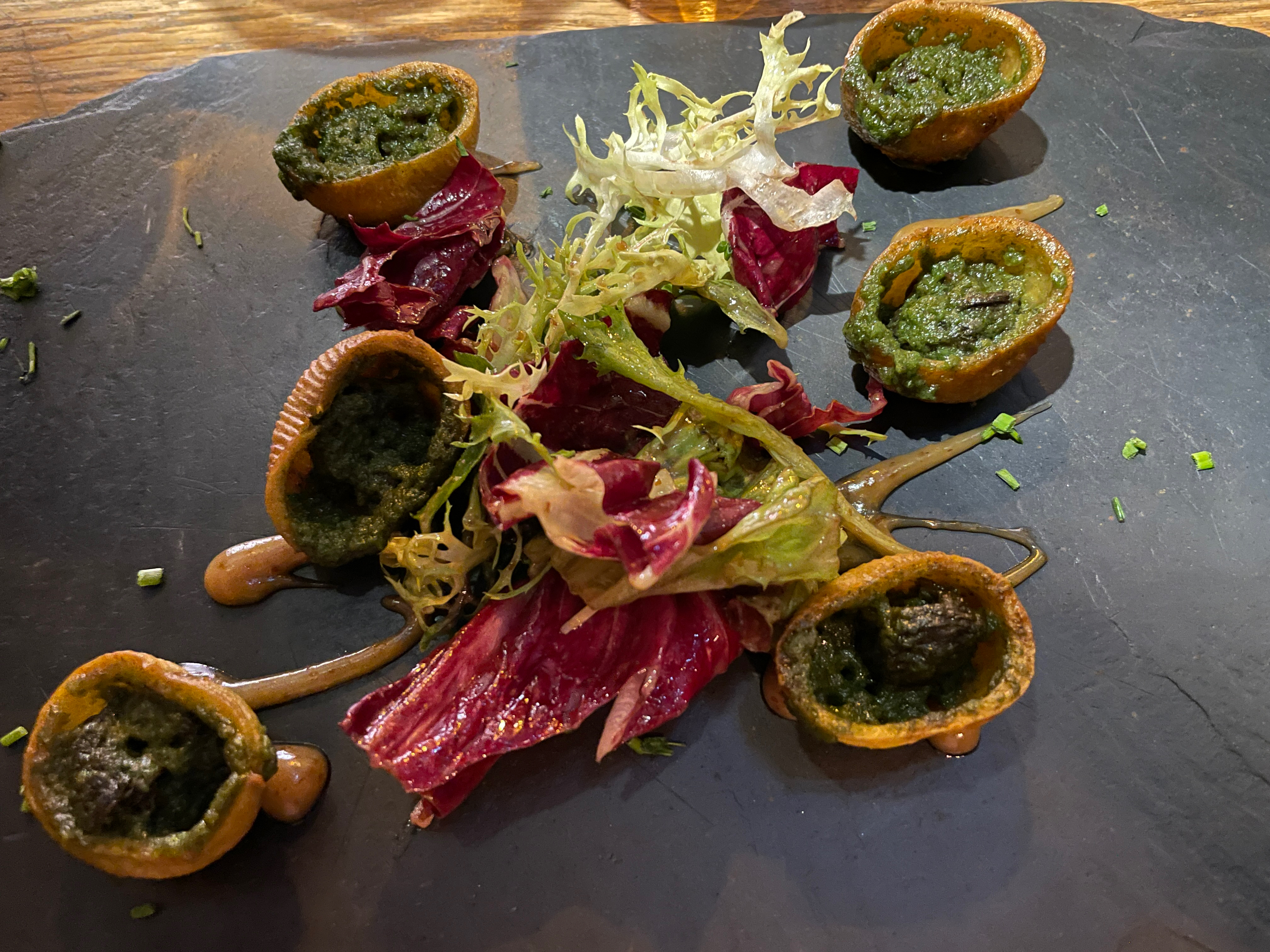 Excellente nourriture et service merveilleux. C'est un petit endroit donc mieux vaut réserver. Nous avons mangé des chips d'escargots - très délicieuses et uniques - du lapin et du canard - tous deux fondants dans la bouche avec des sauces incroyables !