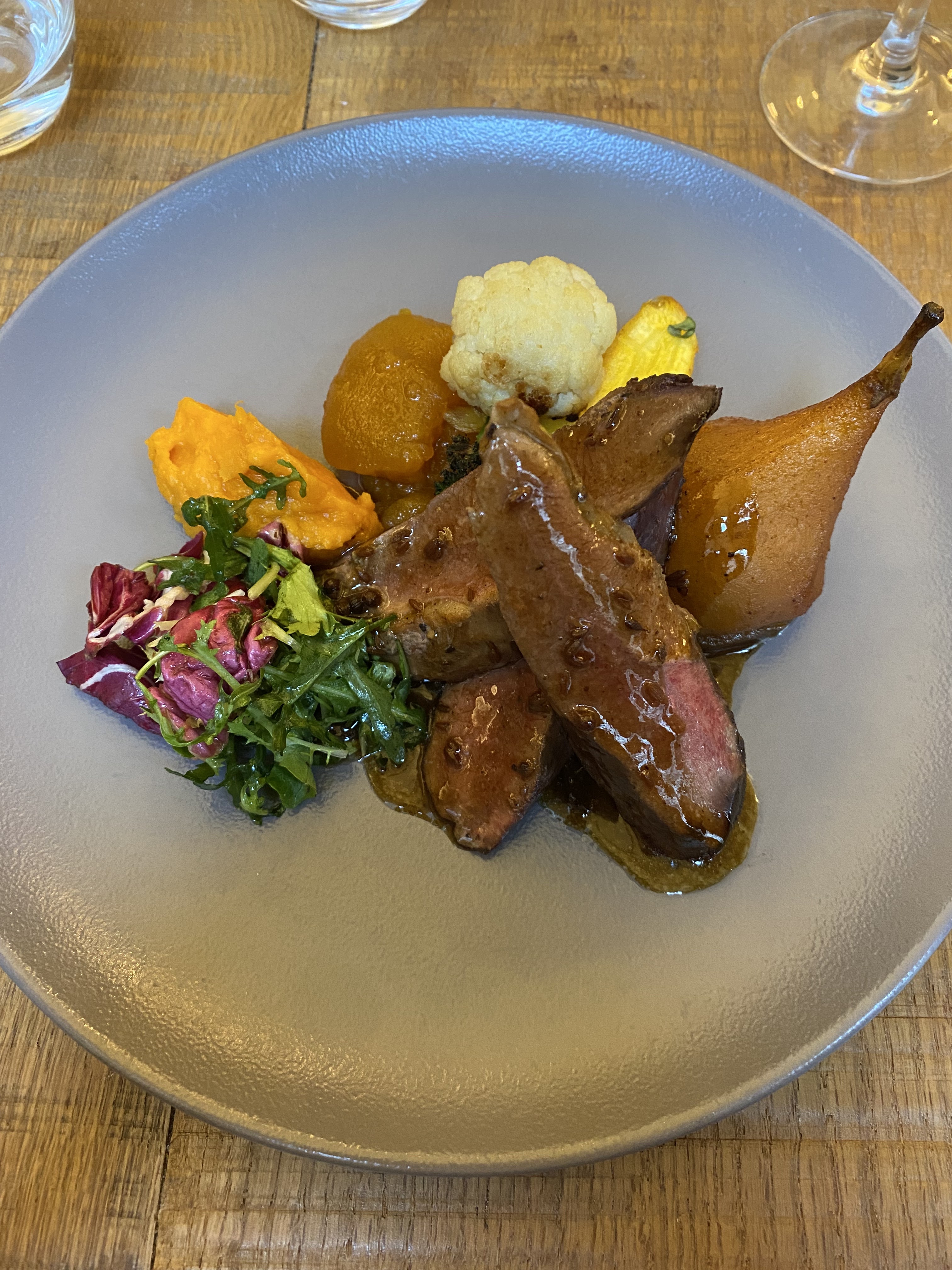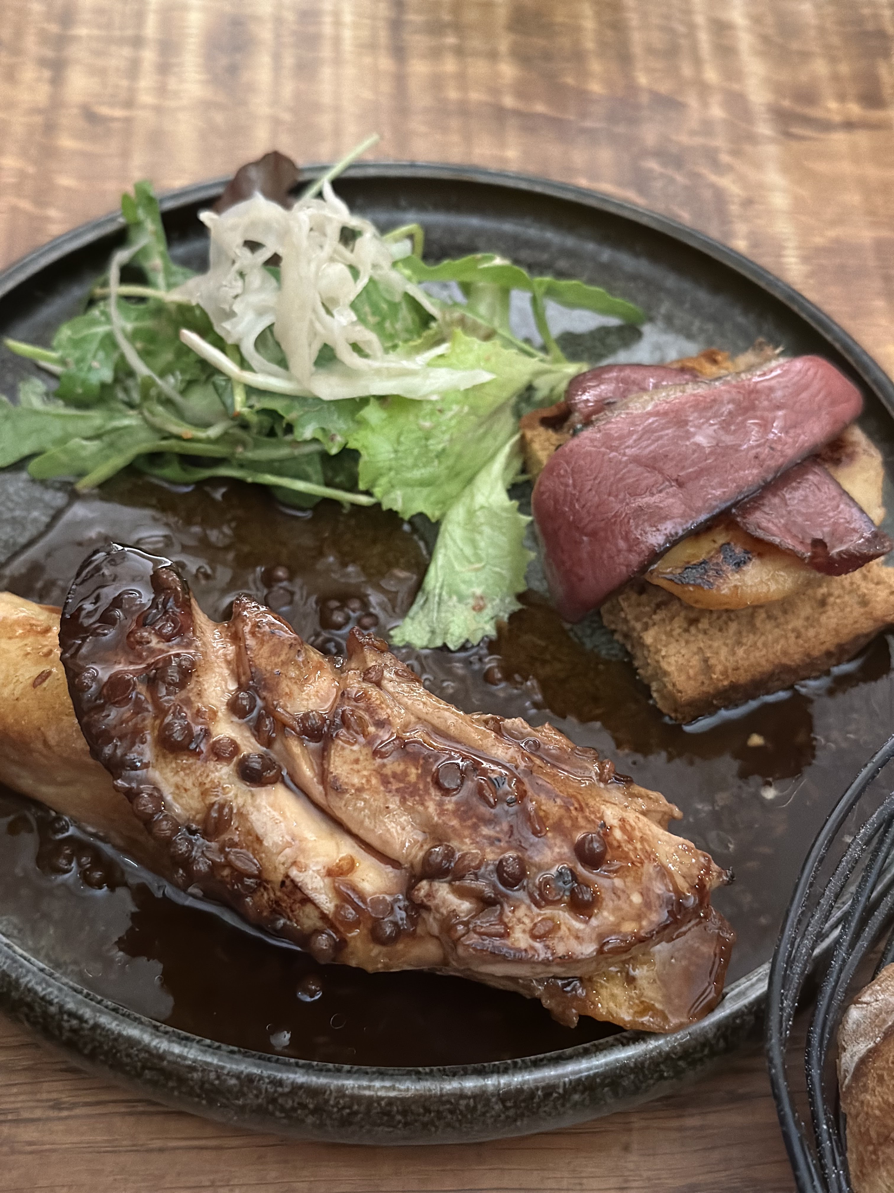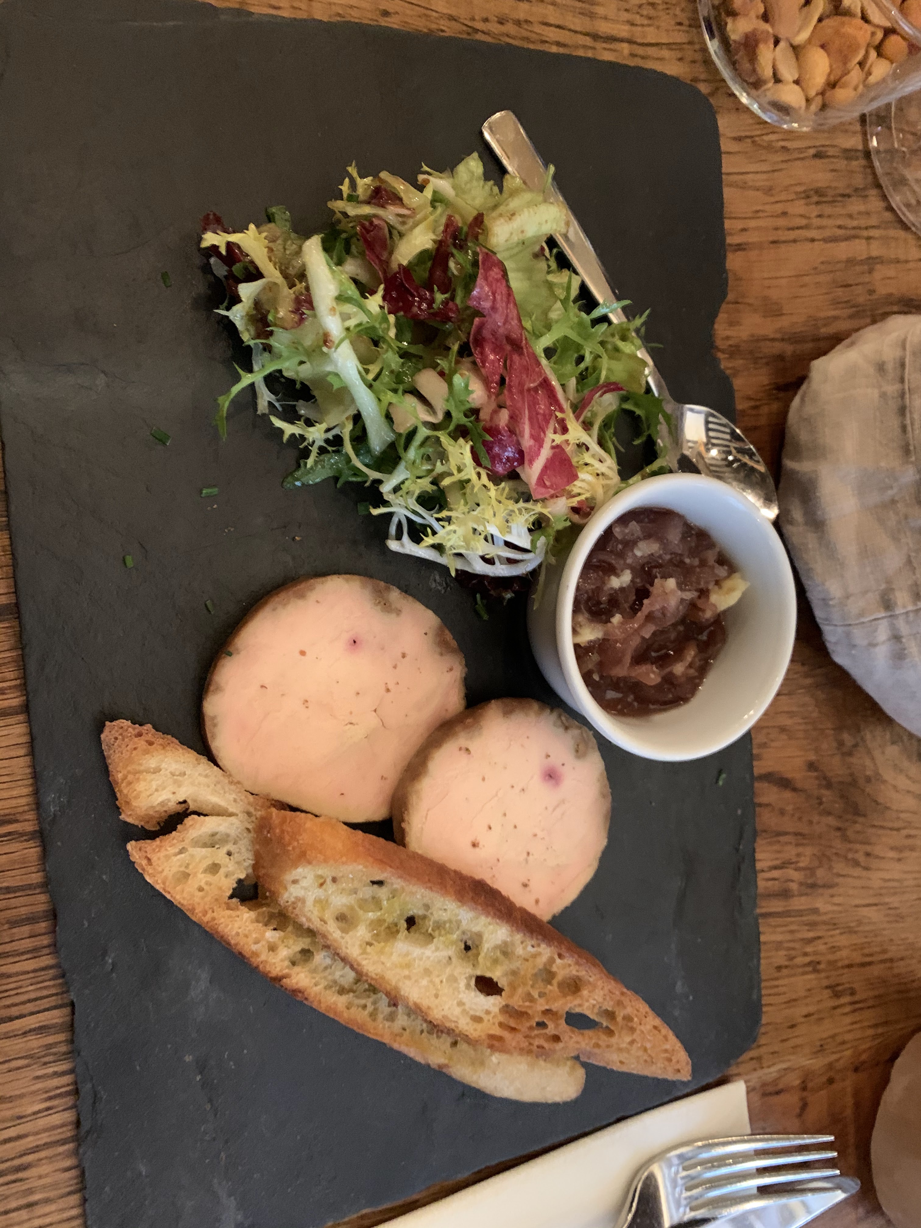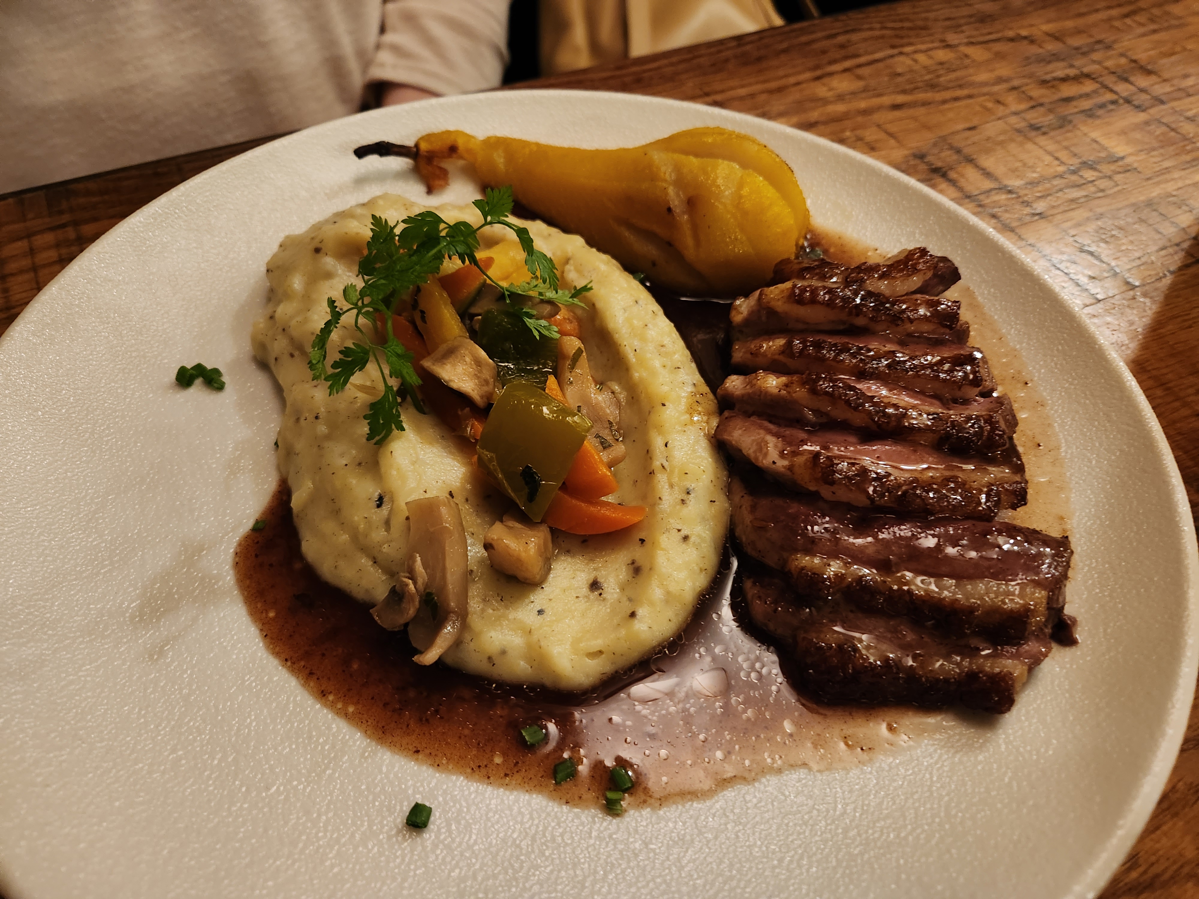 Pain perdu au foie gras, le magret de canard était bon, le magret de canard était trop salé et dur, même s'il était charcutier. La cuisse de lapin et le canard étaient tous deux trop cuits. La cuisse de lapin était presque une pâte sans le wrap au bacon qui la maintenait en forme. Le canard ressemblait à du saccadé en termes de ténacité. Très déçu, surtout compte tenu des excellentes critiques. Pour être honnête, c’était un peu un piège à touristes.