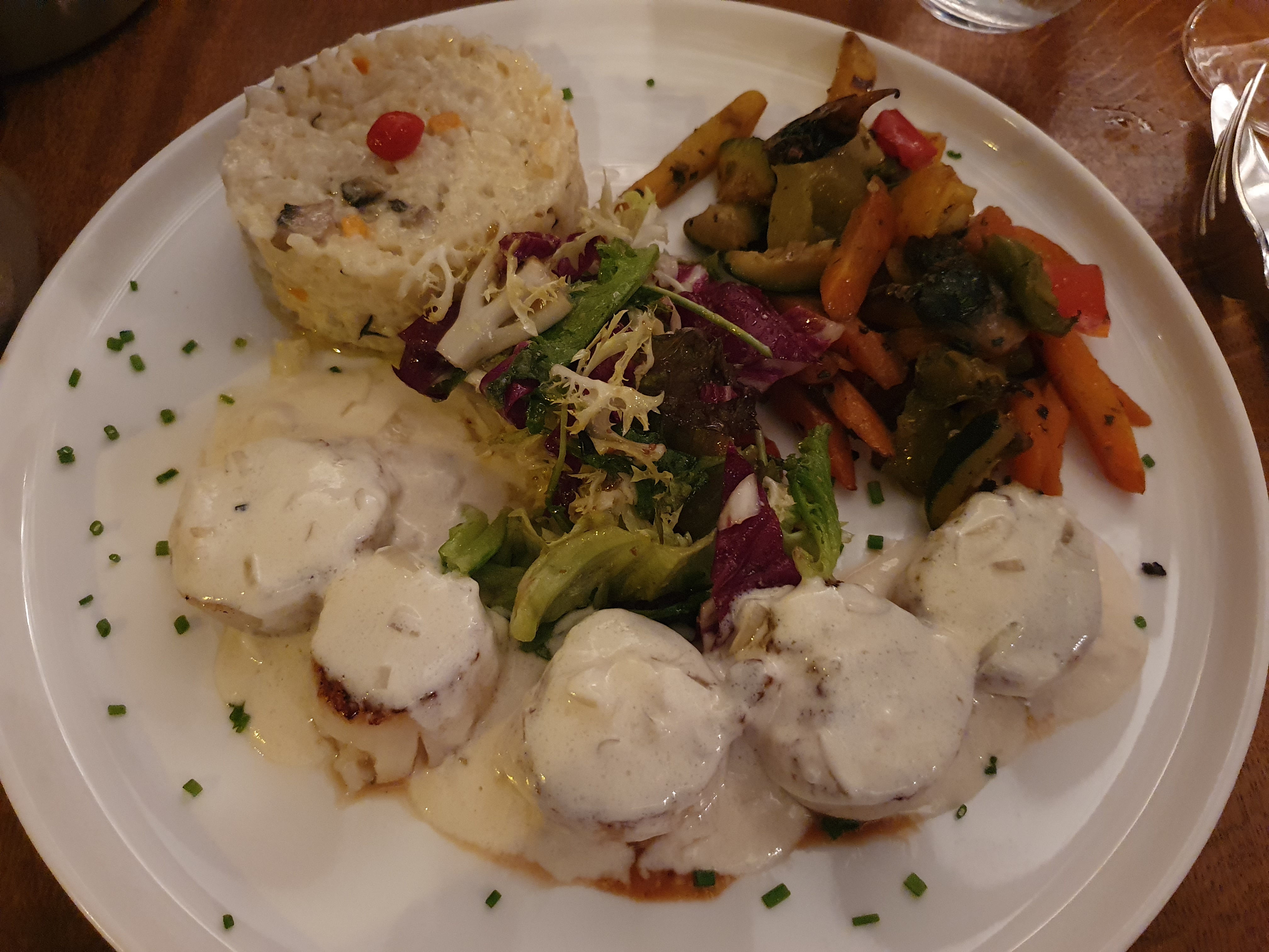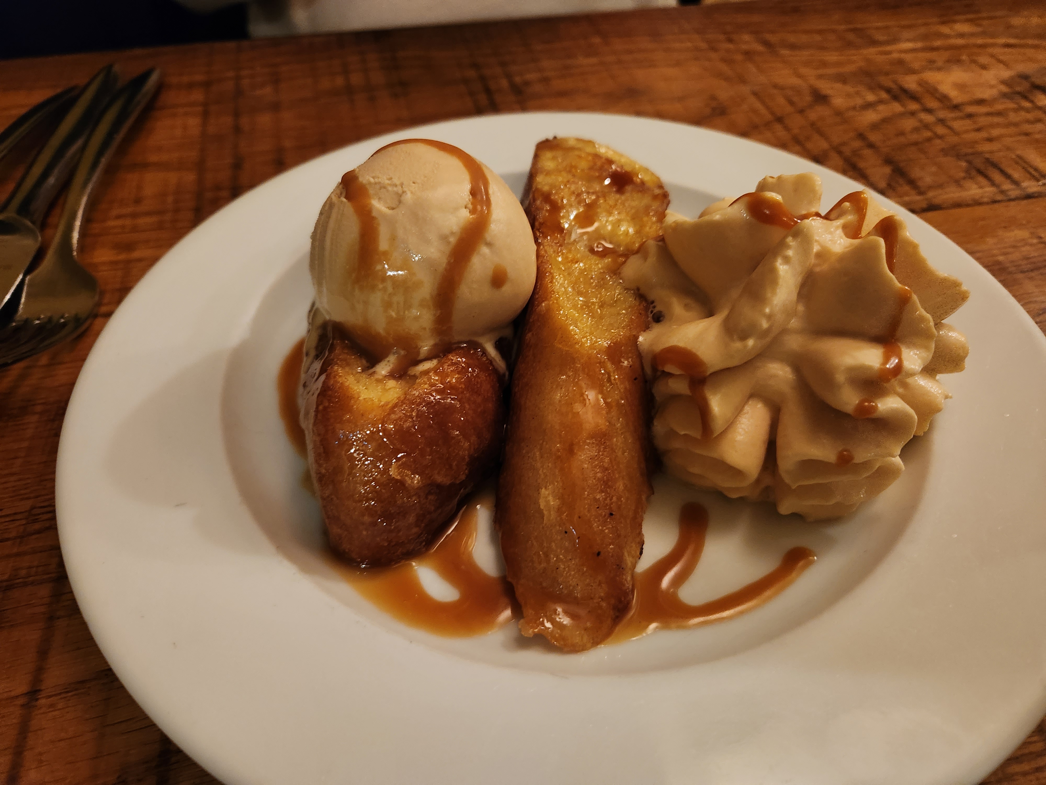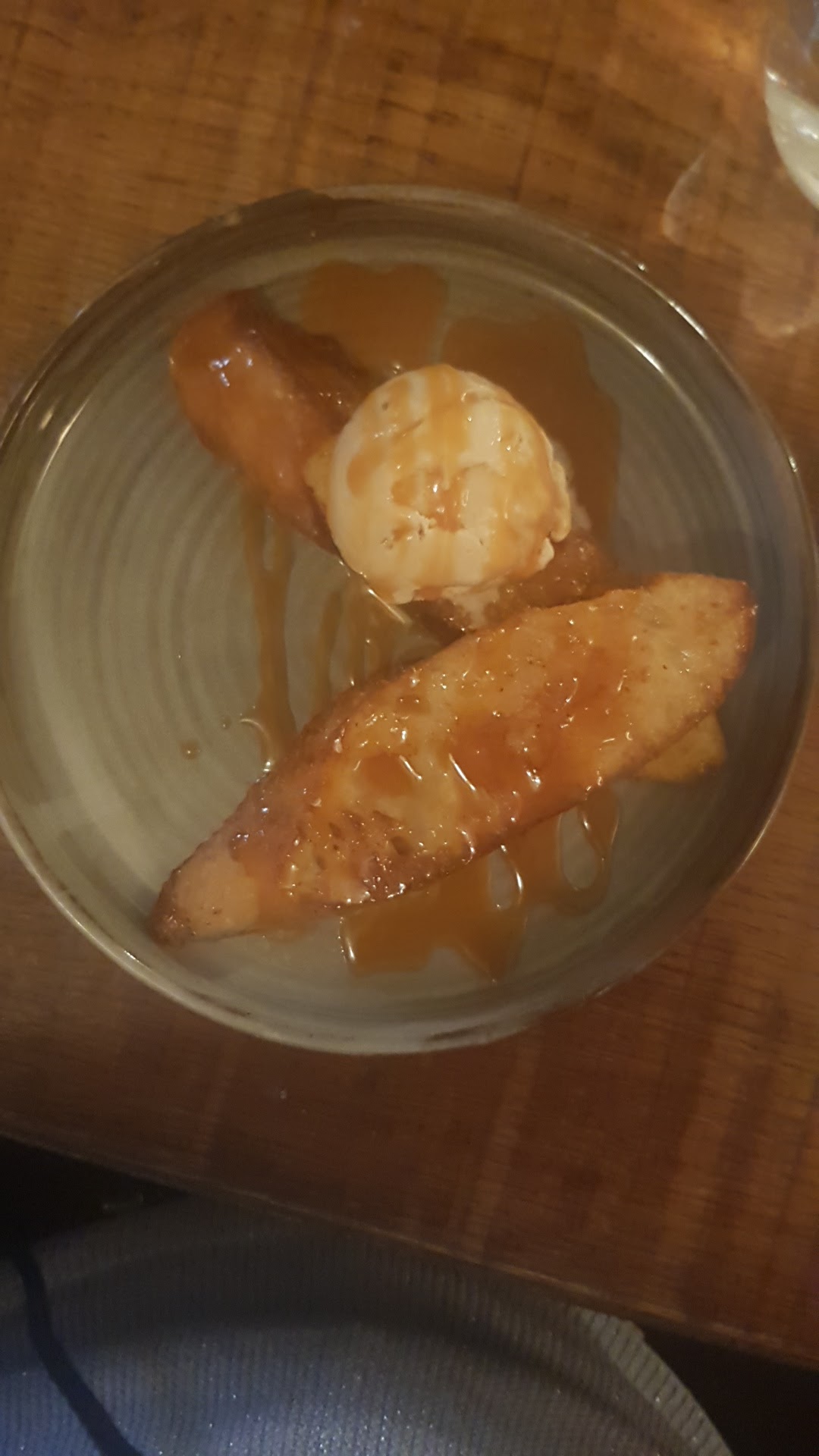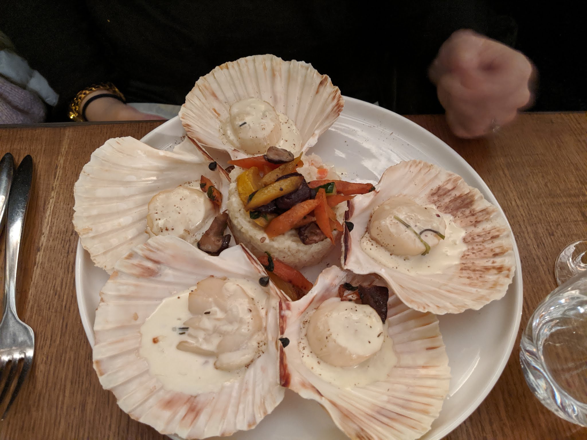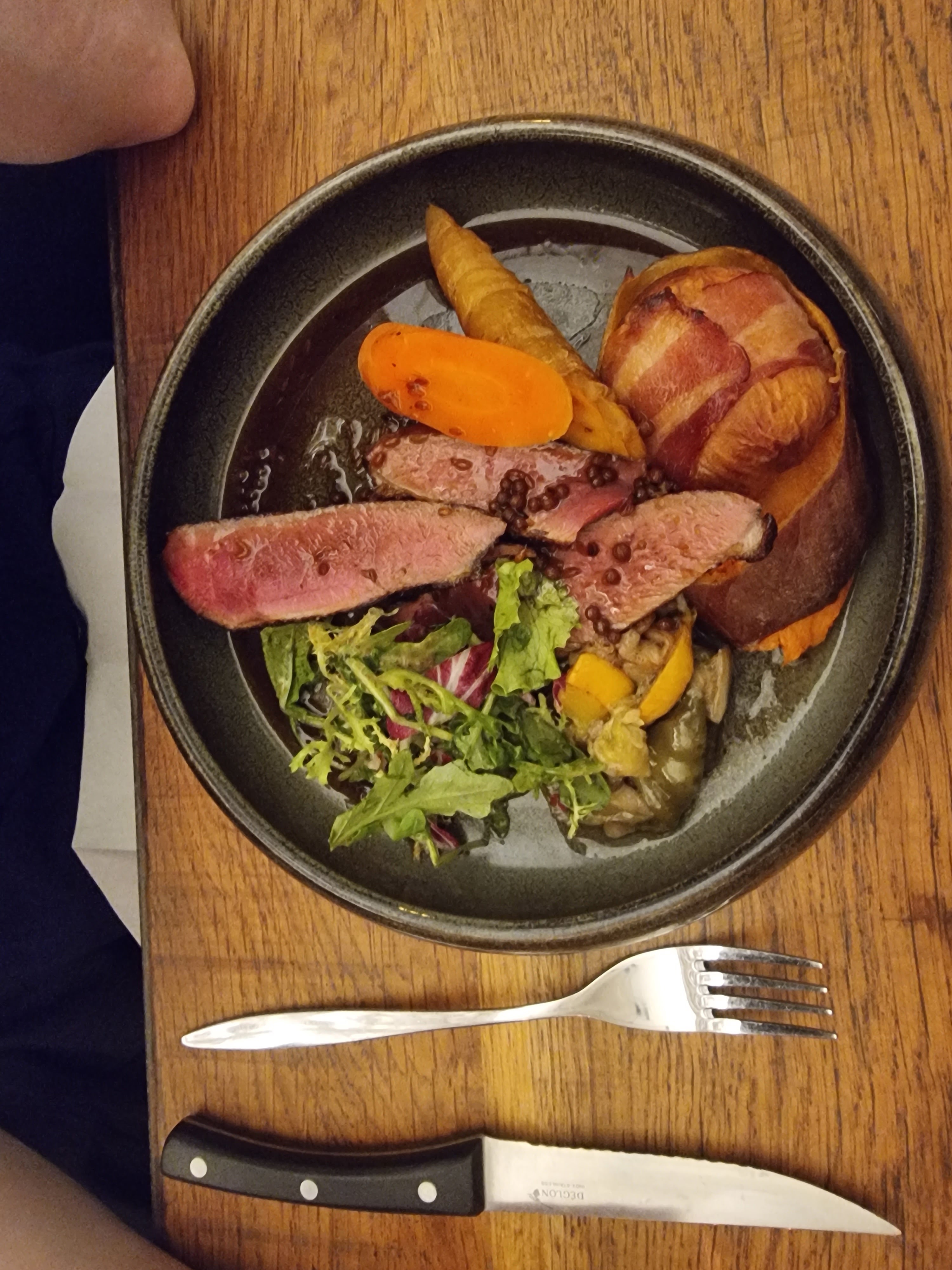 Nos entrées étaient très bonnes. Plat principal de lapin le plat était bon, mais les 3 autres plats que nous avions étaient corrects, avec de bonnes sauces. Les pétoncles étaient cuits de manière incohérente (deux des quatre étaient cuits correctement et deux trop cuits), le filet de bœuf était commandé à point - saignant mais servi à point sur la moitié et bien cuit de l'autre côté, et le canard était bien cuit (TRÈS trop cuit). Voir le canard pas assez cuit à la table voisine était préoccupant. Par contre les desserts étaient excellents, notamment le pan perdu !!!