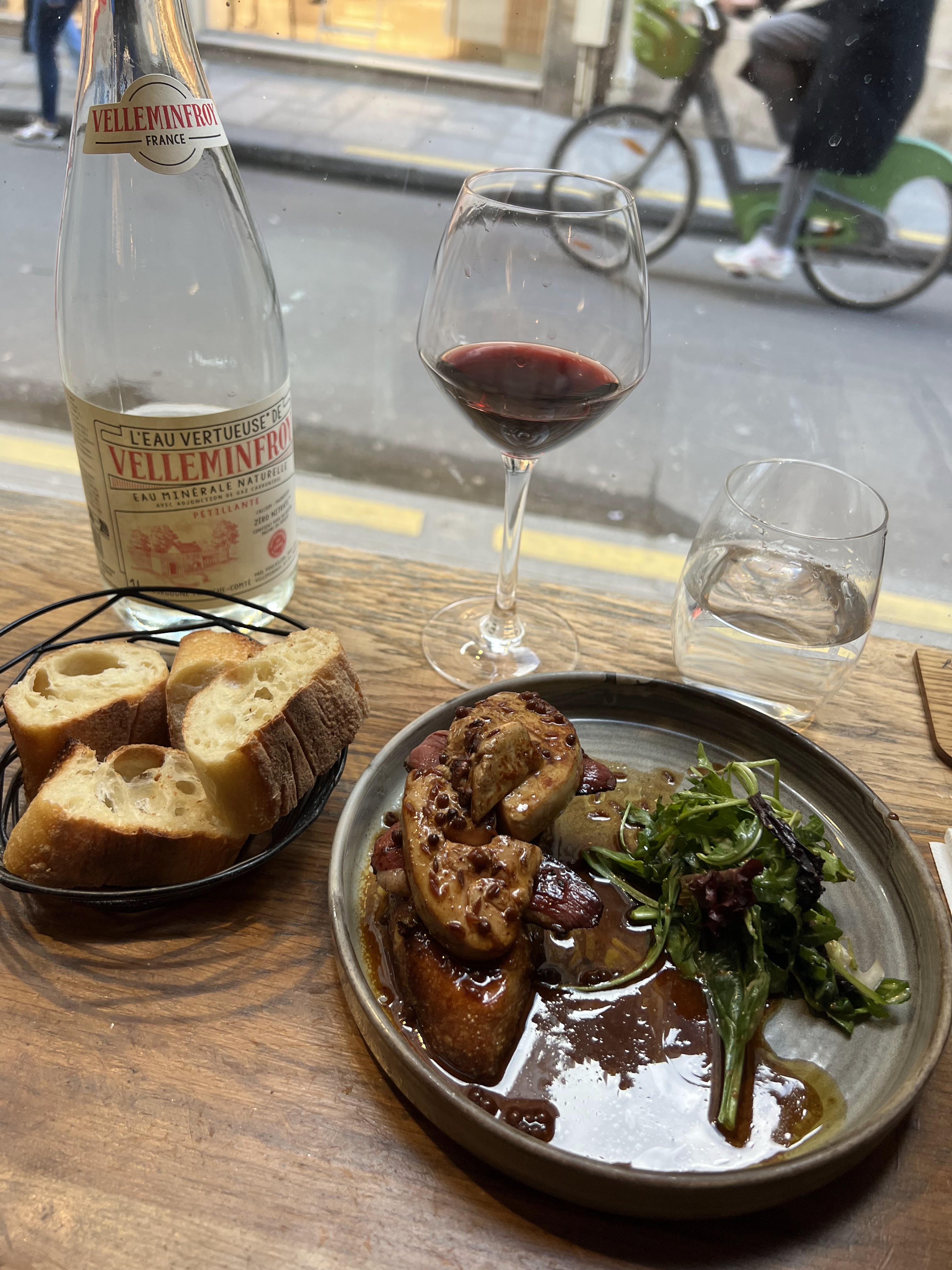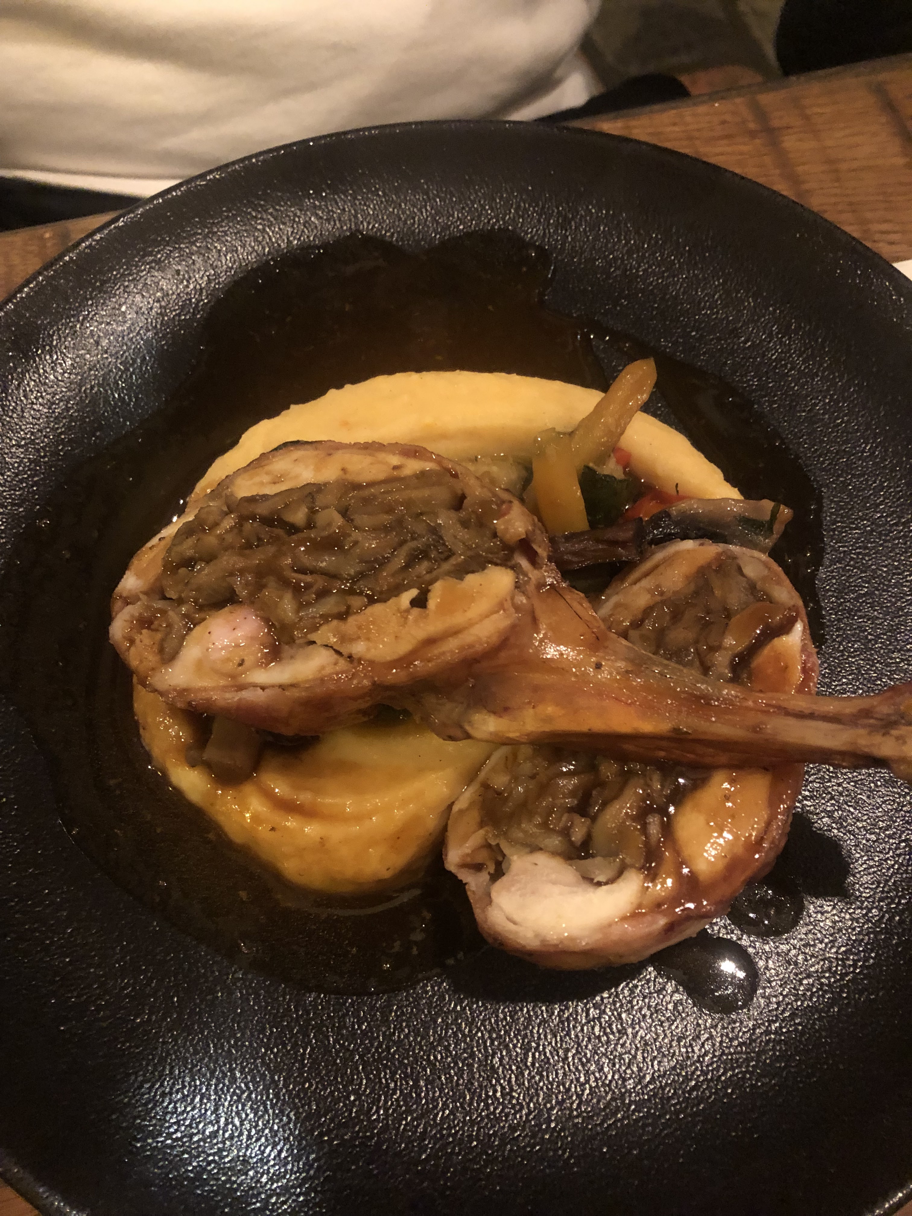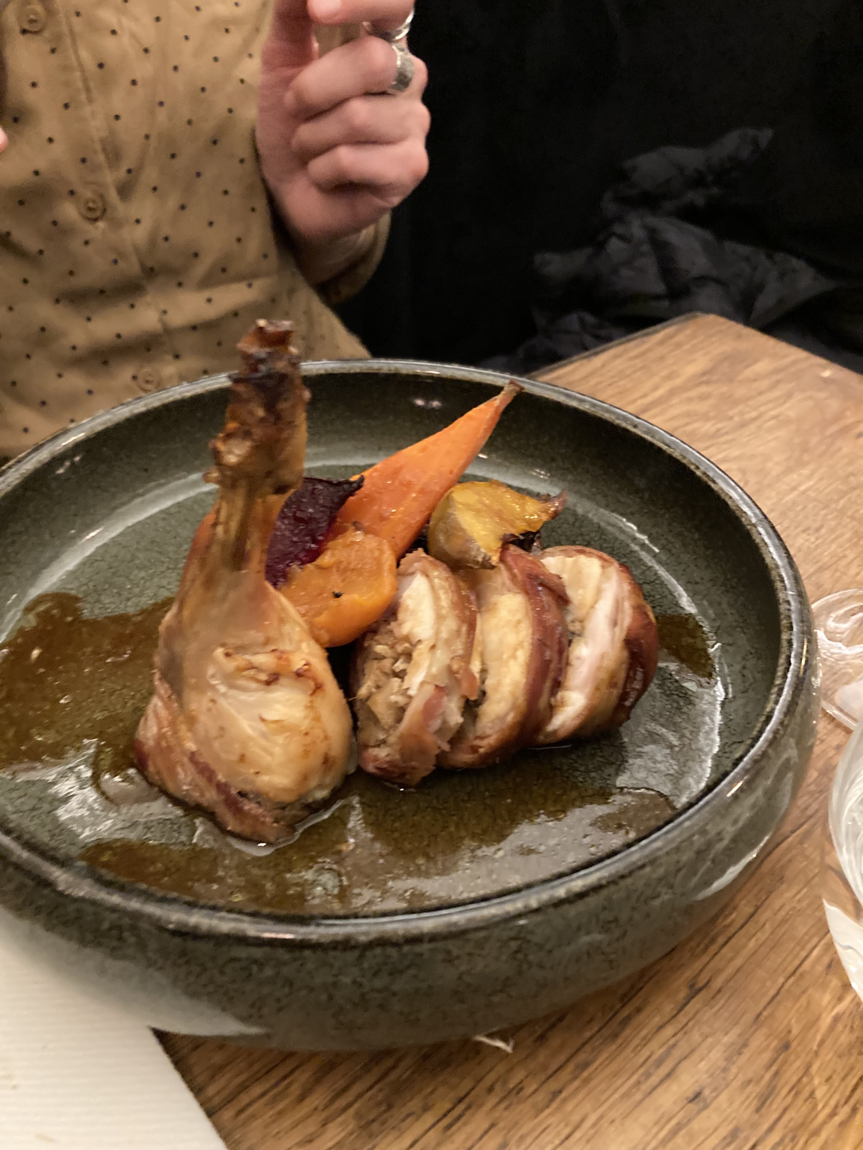 Très content de mon expérience. Je pense vraiment que vous ne pouvez pas vous tromper avec aucun des plats qu’ils proposent. J'ai eu un simple vin rouge maison avec la cuisse de lapin farcie aux pleurotes et enveloppée de bacon. C'était un accord parfait. La nourriture était formidable ! Tellement frais et savoureux. Je recommande également le pain perdu en dessert, c'était incroyable. Rien de négatif à dire, je reviendrai à chaque fois que je serai à Paris :)