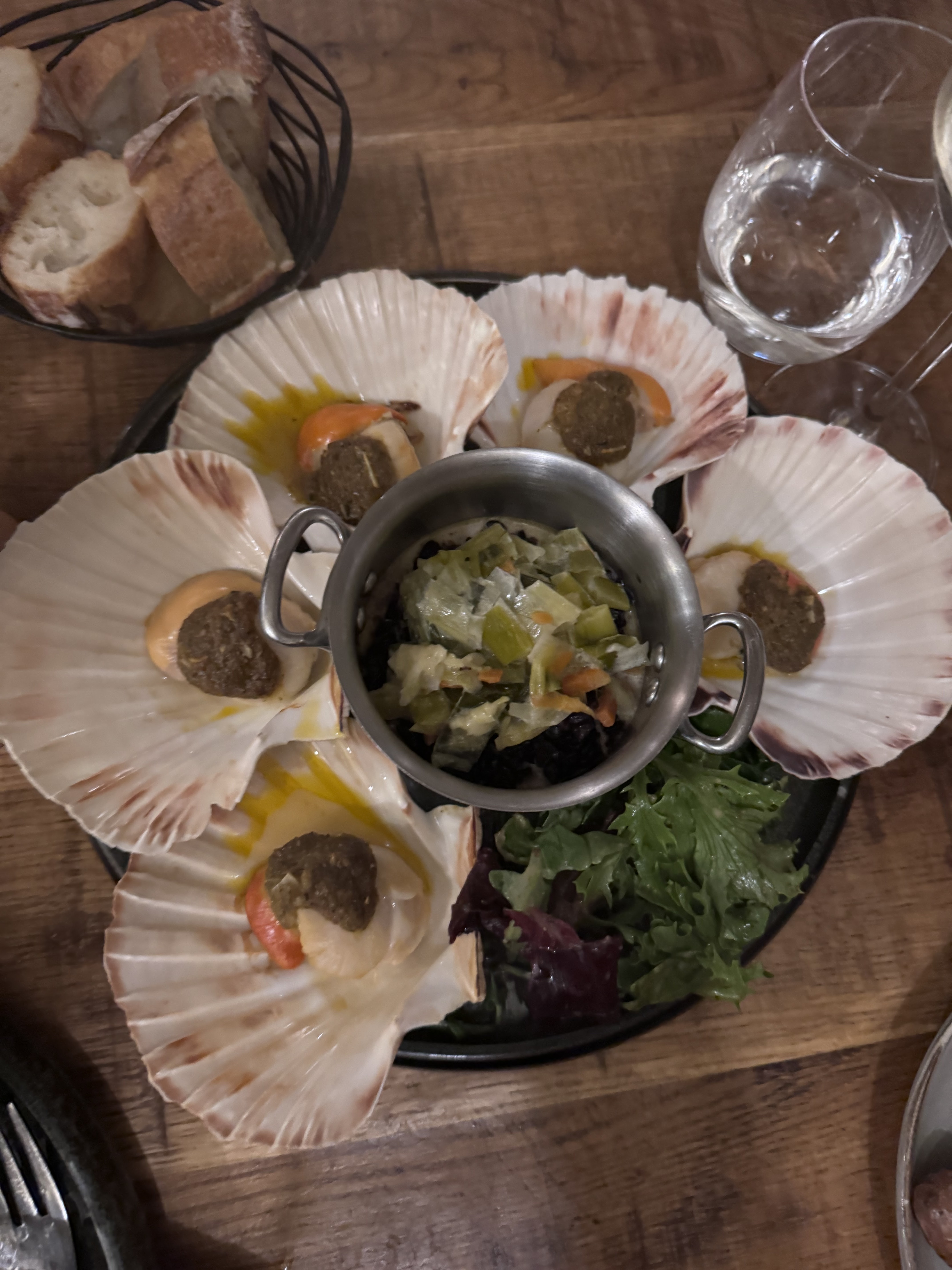 Bistrot français chaleureux au cœur du Marais. De petites tables seraient donc recommandées pour les couples ou les petits groupes. Présentation créative des escargots car ils doivent être consommés entiers plutôt que dans leur coquille. Le magret de canard était délicieux et juteux. Les pétoncles étaient une petite portion mais très savoureuse aussi. Les prix sont assez élevés par rapport aux portions. Le menu n'était pas très détaillé, donc les attentes étaient un peu mal alignées. Dans l’ensemble, c’est une belle expérience.