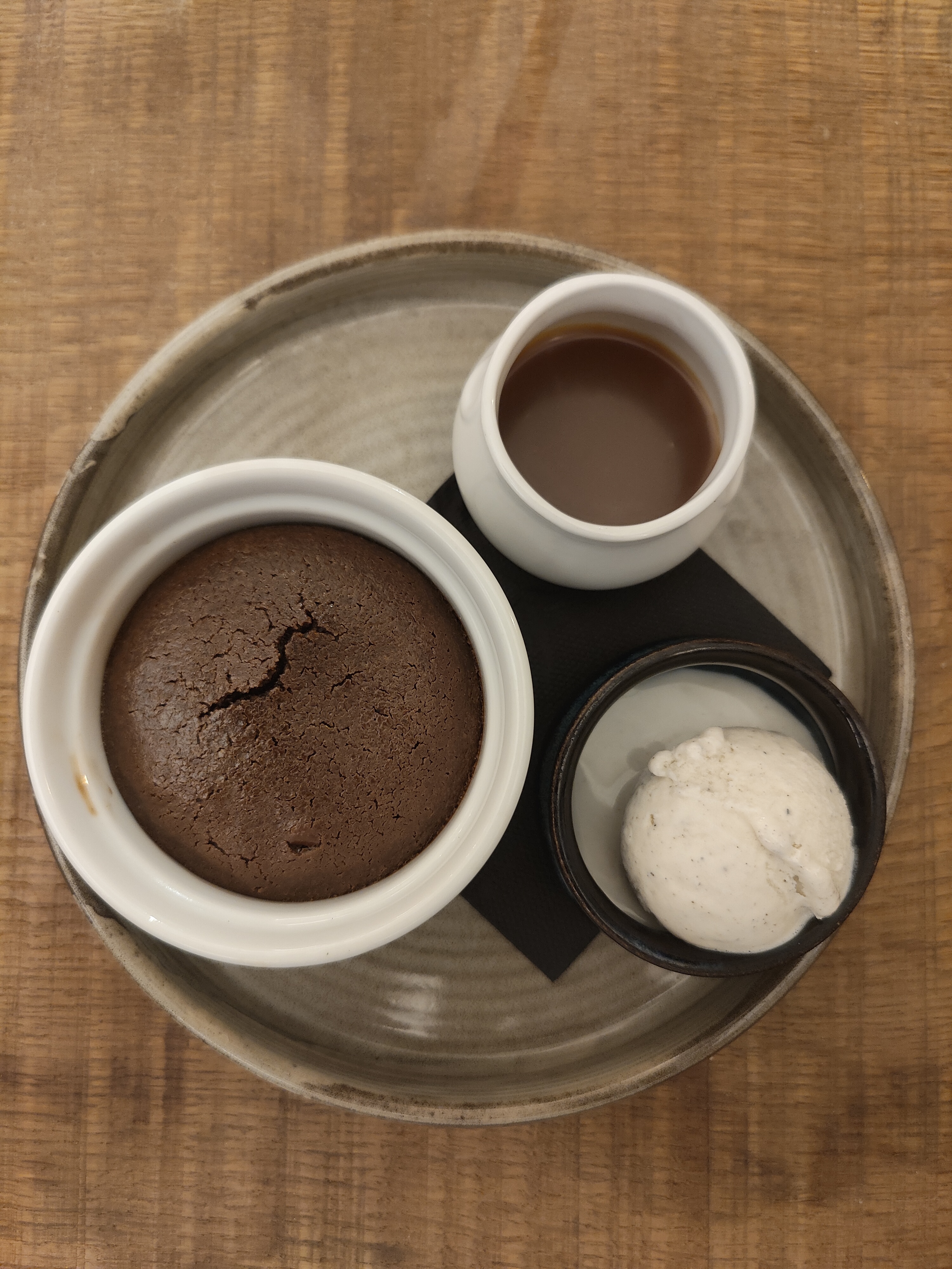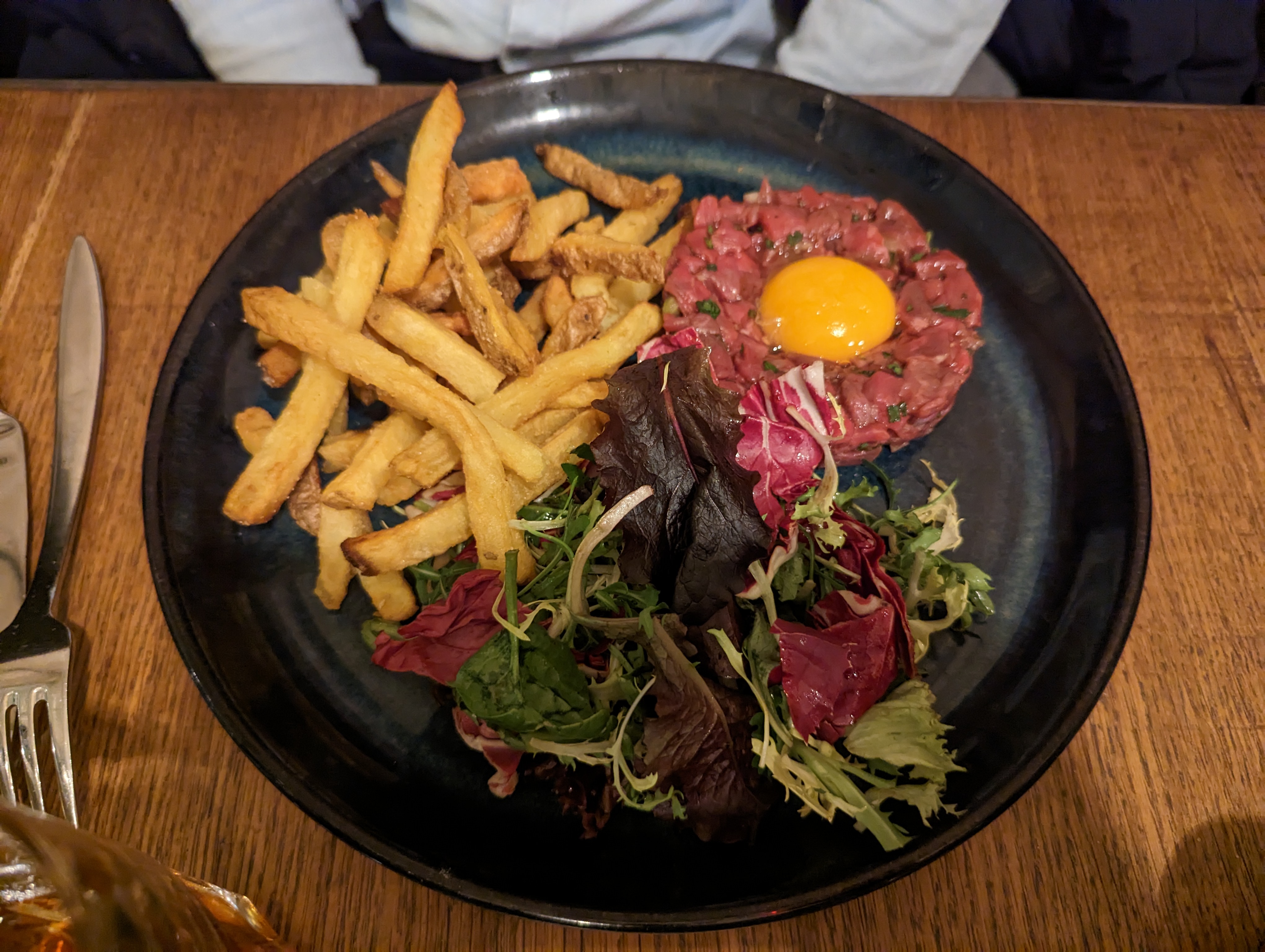 Très bon dîner, où tout était bien exécuté et délicieux. Le soir où nous y sommes allés, il semblait que tout le restaurant était rempli de clients de l’extérieur de la ville, mais cela ne semblait pas « touristique ». En entrée, nous avons partagé le fromage de chèvre au four avec pomme et miel. C'était savoureux, sucré et beurré. La croûte avait également une bonne texture. Mon plat principal était le steak tartare, qui avait une belle saveur de bœuf et était moelleux en quantité suffisante. Mon mari a eu le lapin, qui était tendre et savoureux ; la farce était également bonne. Les accompagnements étaient également excellents, notamment le champignon en croûte de sésame. En dessert, nous avons eu le mi cuit de chocolat, simple mais excellent. Le vin était également bon. Le service était très sympathique.