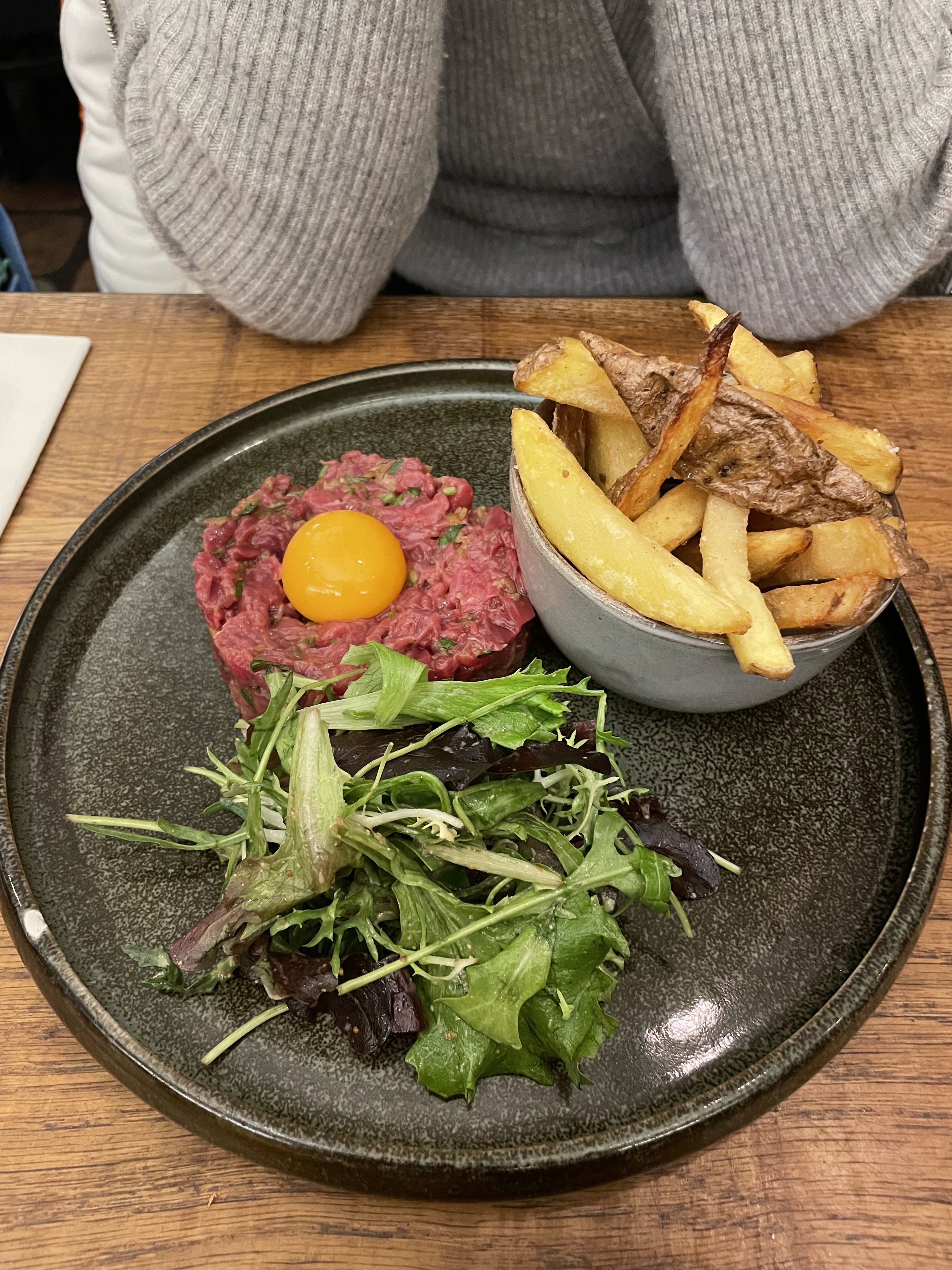 Extrêmement bien situé dans le Marais, c’est le meilleur steak tartare que j’ai jamais mangé. L'escargot en entrée est le paradis. Je ne peux pas exprimer à quel point le service est excellent, spécialement Tom, qui sert à l'étage.