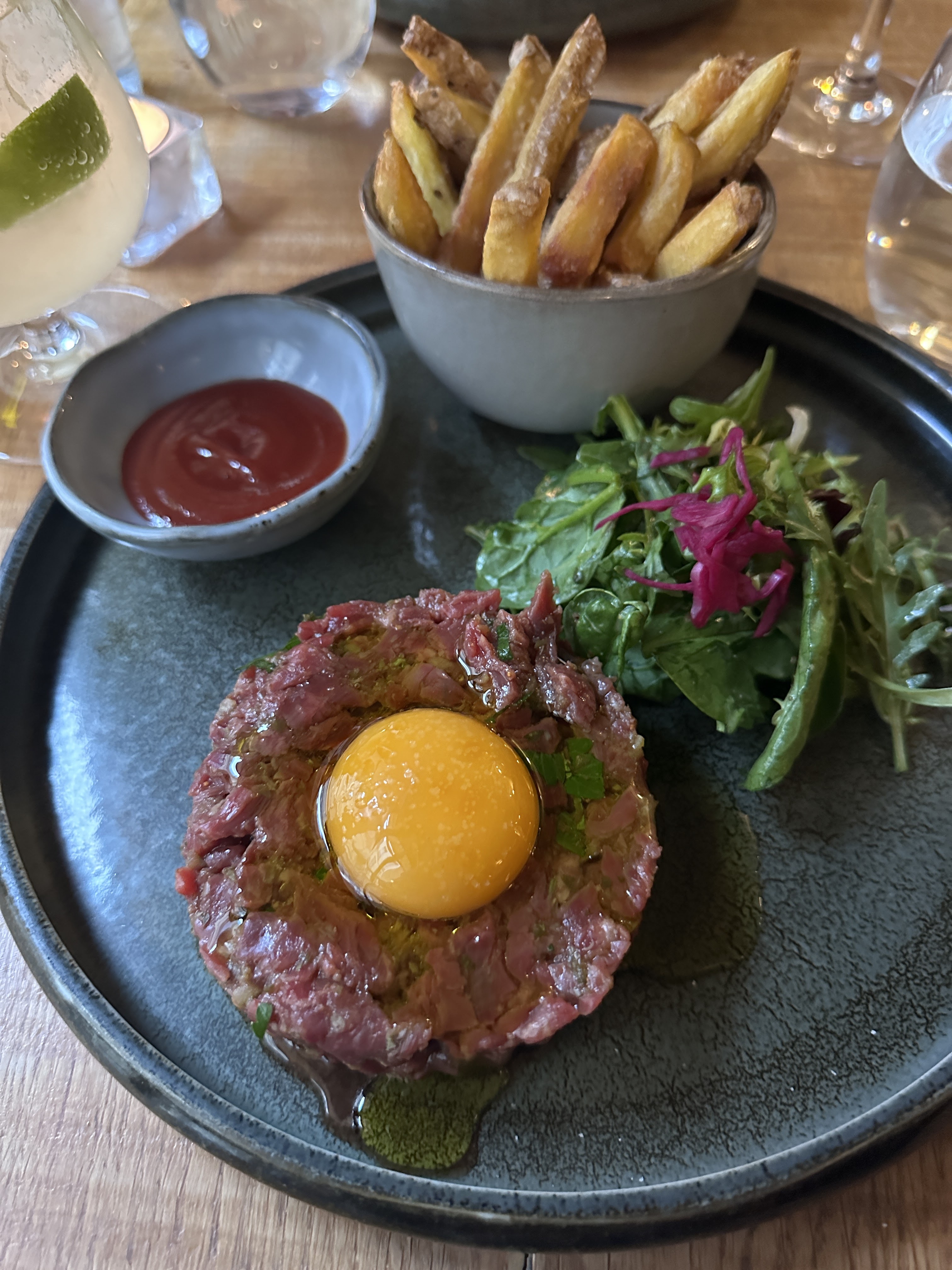 Nous sommes venus ici avec de grandes attentes car cela avait été recommandé par d'autres et à en juger par le prix, la nourriture devrait être de haute qualité. Mais c’était plutôt décevant. J'ai commandé du foie gras en entrée, il faisait froid au milieu et j'en sentais à peine l'arôme. Cela nous a fait nous demander si c'était peut-être préparé et congelé. C'était un plat à 29 euros, ce n'est pas ce qu'il devrait être. Le tartare de bœuf que j'ai commandé n'avait absolument aucun goût de bœuf. Cela avait légèrement le goût des épices avec la texture du bœuf. Très étrange et pas agréable. J'ai dû demander à mon partenaire de le terminer pour moi.