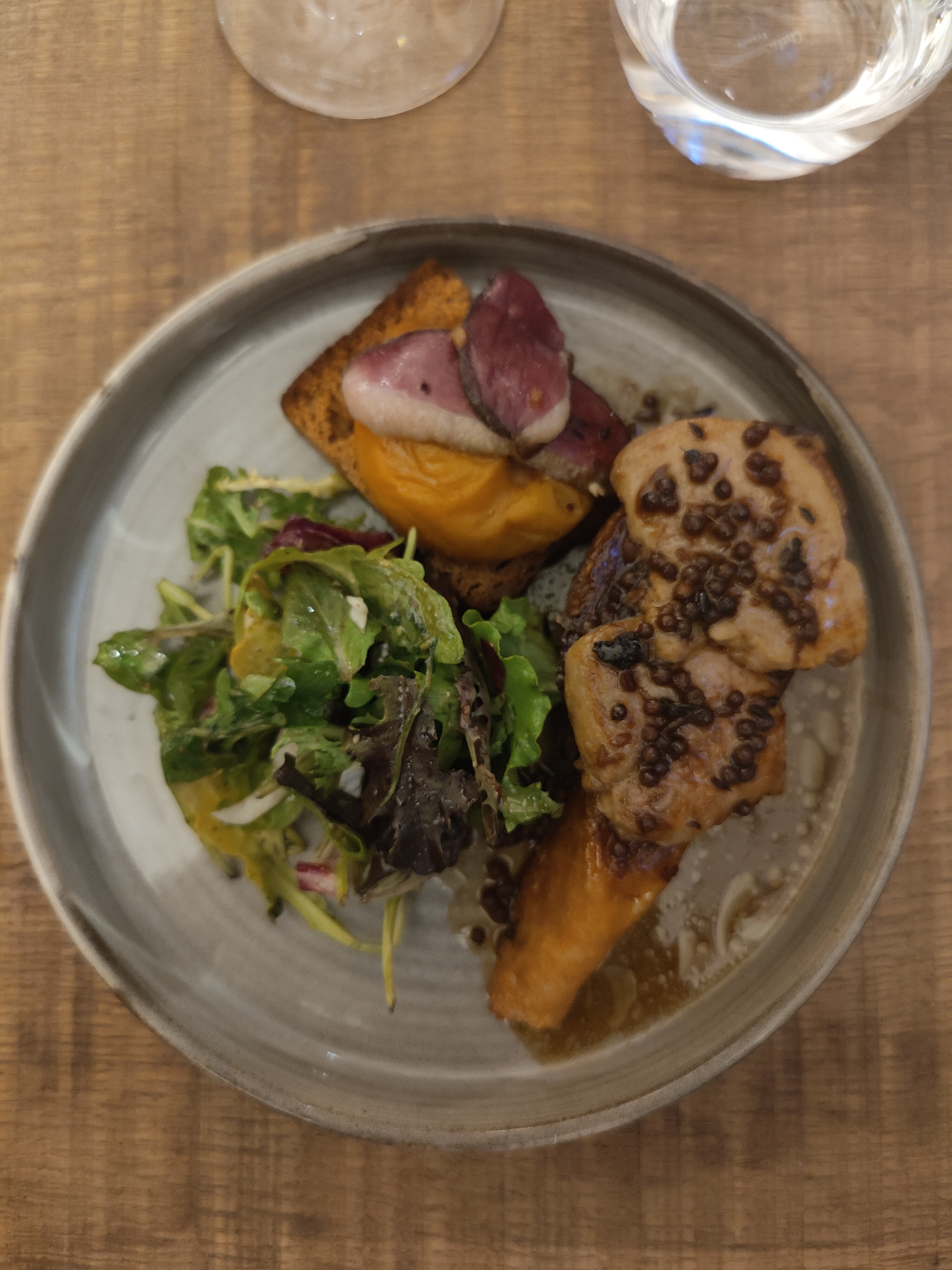 Je suis revenu après 2 ans, avec les attentes élevées que j'avais de la dernière fois. La nourriture est incroyable et le service est très sympathique. En plat, le canard, le lapin et le tartare sont toujours étonnants et fortement suggérés ! Je reviendrai certainement, mais j'ai été un peu déçu par l'augmentation des prix. La portion de foie gras est minuscule et très beurrée (moins de saveur que d'habitude) et elle coûte 22€ alors qu'elle ne vaut pas plus de 16€. Mettez au moins quelques flocons de sel pour que ce soit plus raisonnable. Je suggérerais également de proposer davantage de vin au verre avec une fourchette de prix proportionnelle.