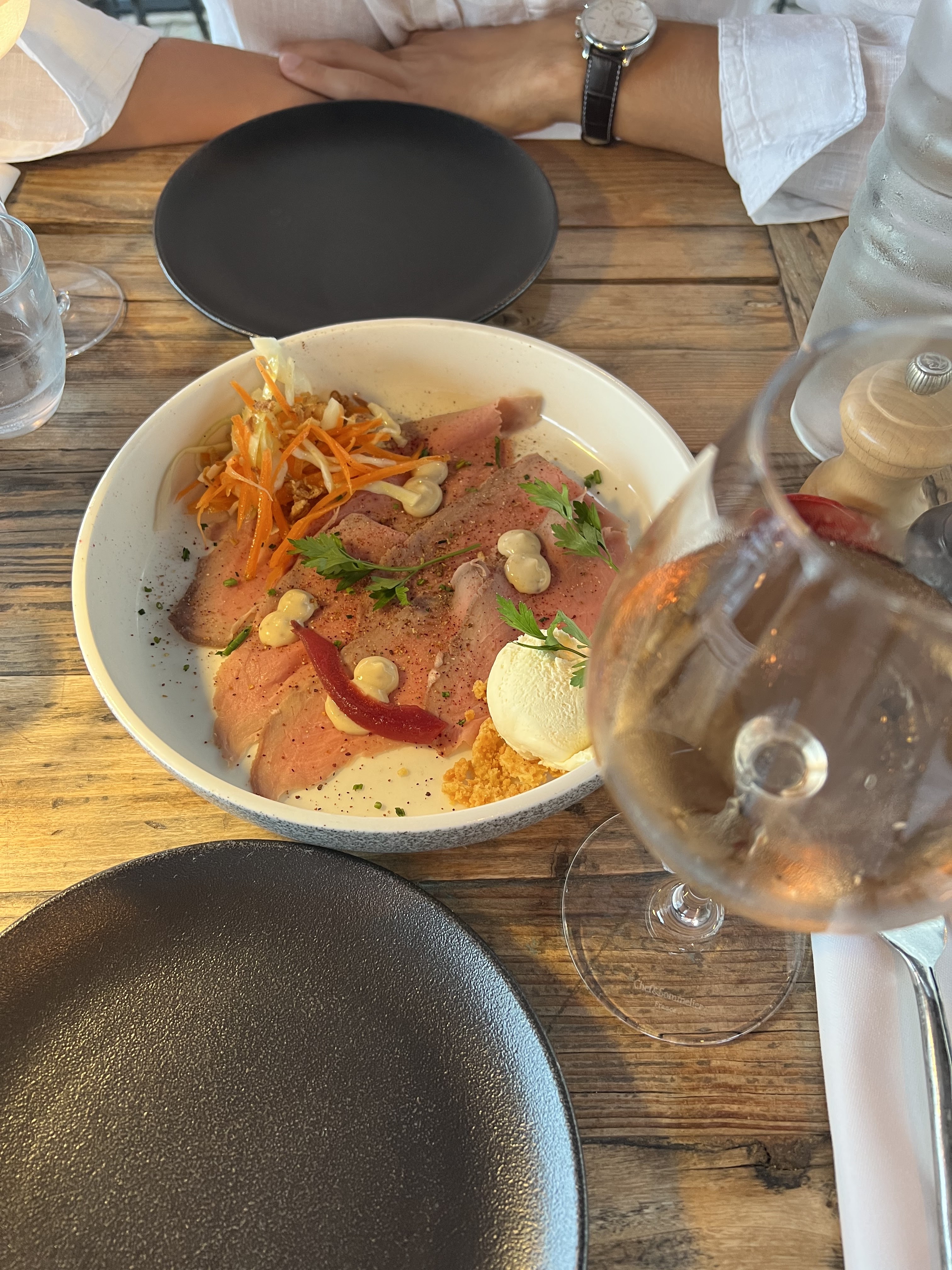 La nourriture est très bonne, la suggestion du vin par la sommelière était excellent. Les serveurs sont très gentils. Le seul bémol, nous avons reçu nos plats nous n’étions même pas à la moitié de notre apéritif.
