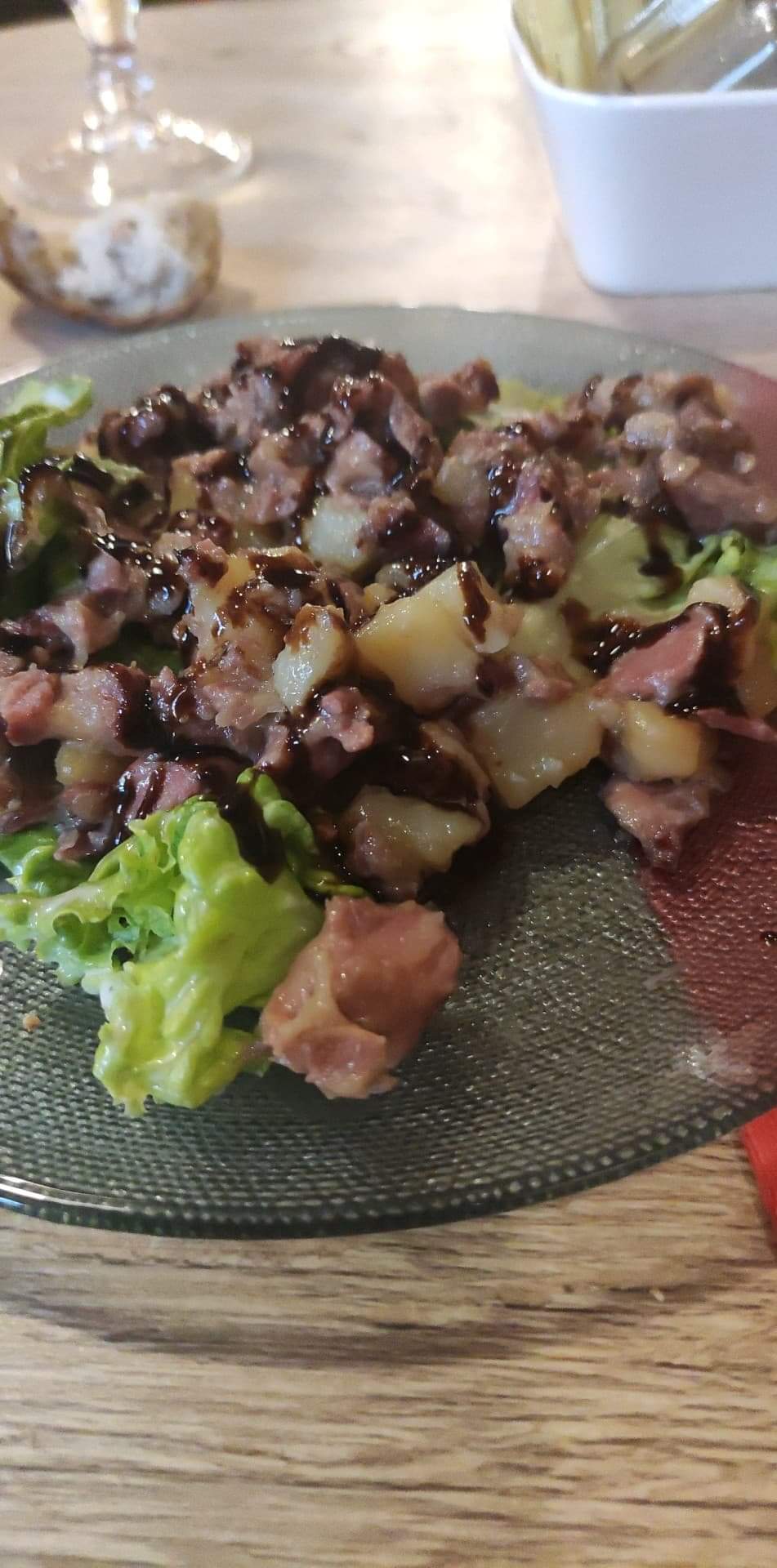 repas en famille copieux établi avec des produits frais tres bon rapport qualite/prix.petite remarque certes pas facile cuire le steak au feu de bois mais à la table 4 steaks saignant tous à point seul bemol