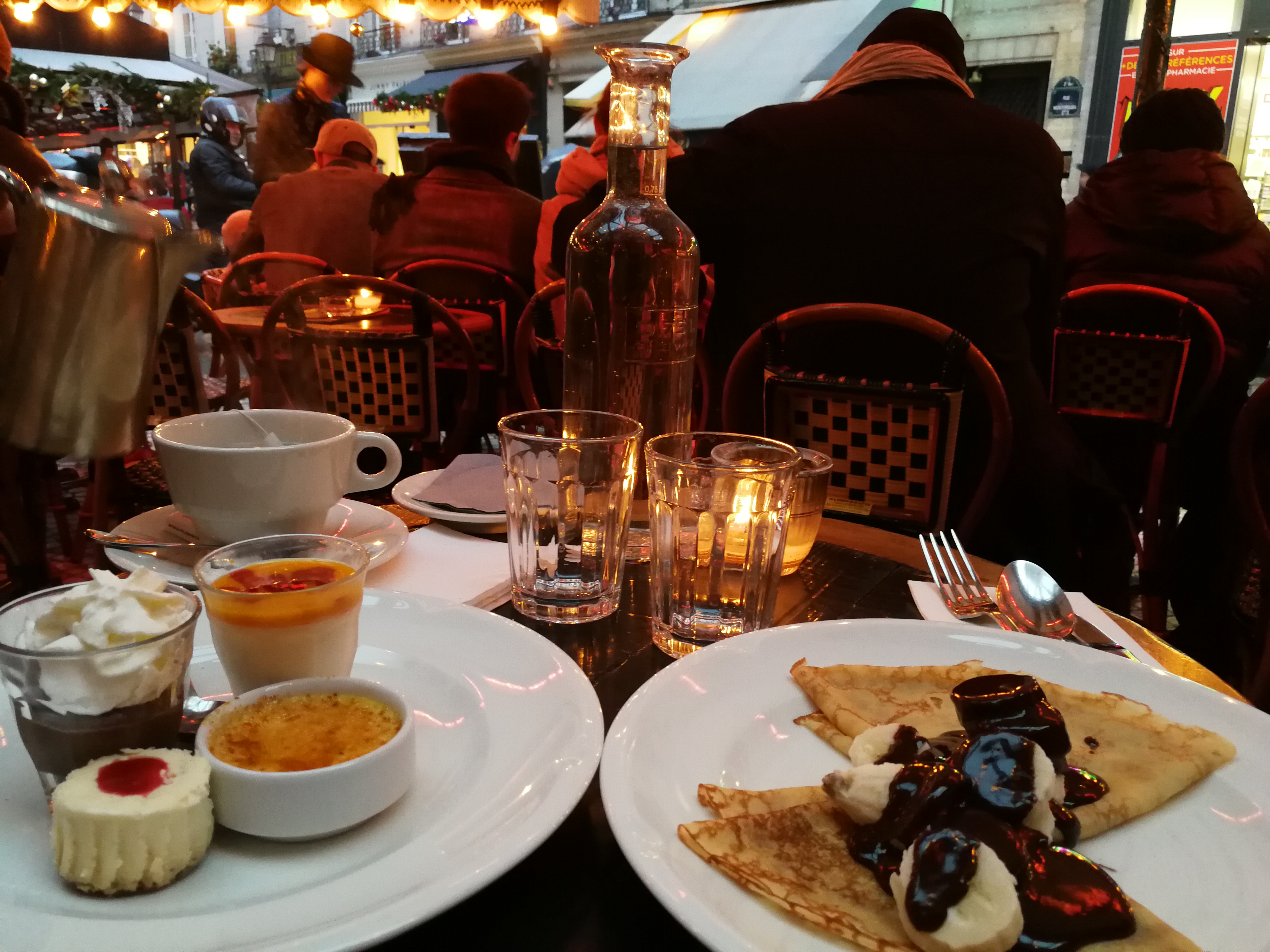 Si vous voulez vivre un moment parisien c est the place to be ! Riverains et touristes se côtoient en toute sérénité ! Les petites lampes à pétrole sur les tables bistrot un bonheur ! Les serveurs sont très agréables et disponibles à tous nos caprices !! Vraiment un pur instant où le temps s arrête ! Et pendant les fêtes la rue montorgueuil s est habillée de ballons jaunes et blancs !