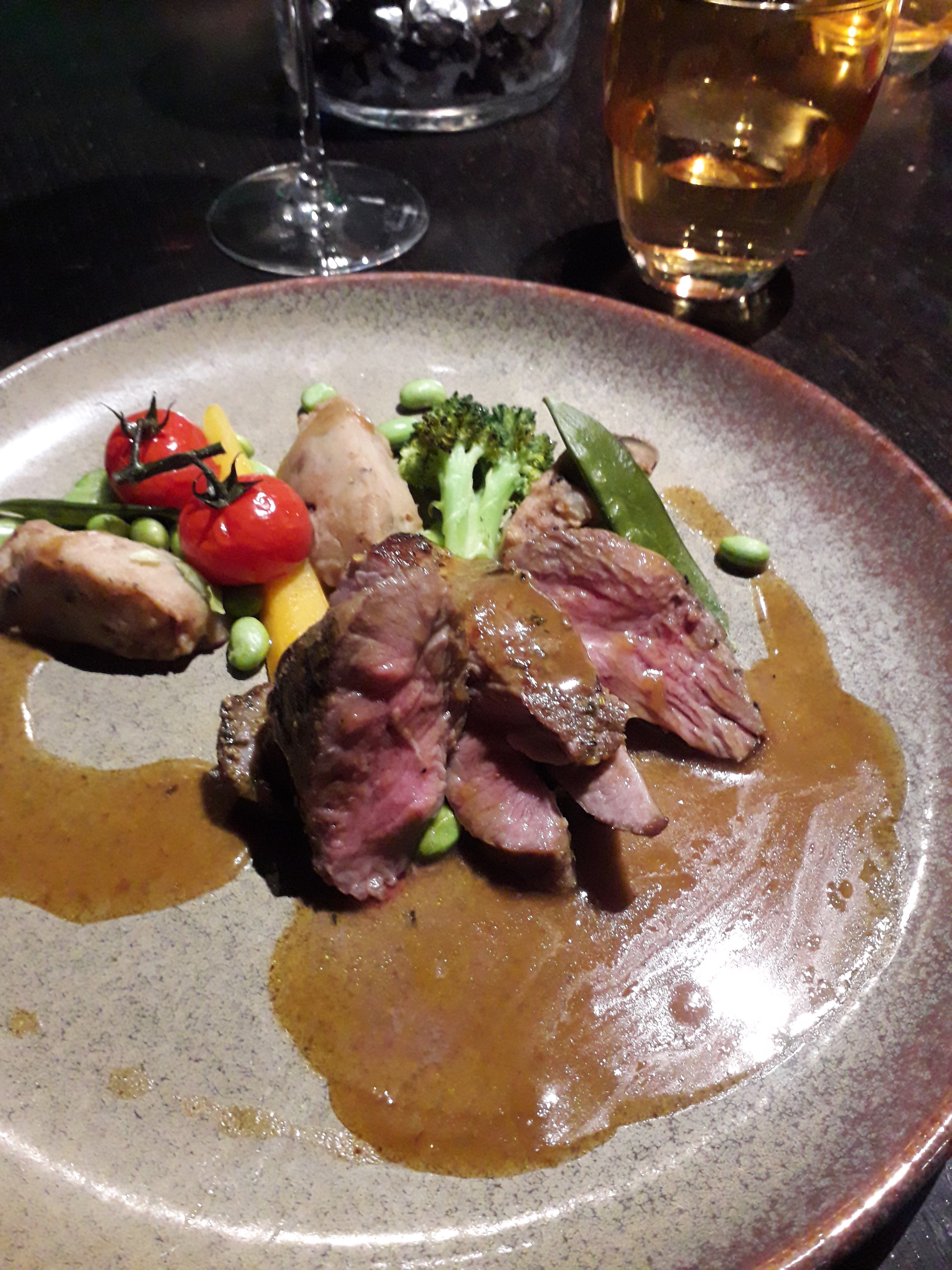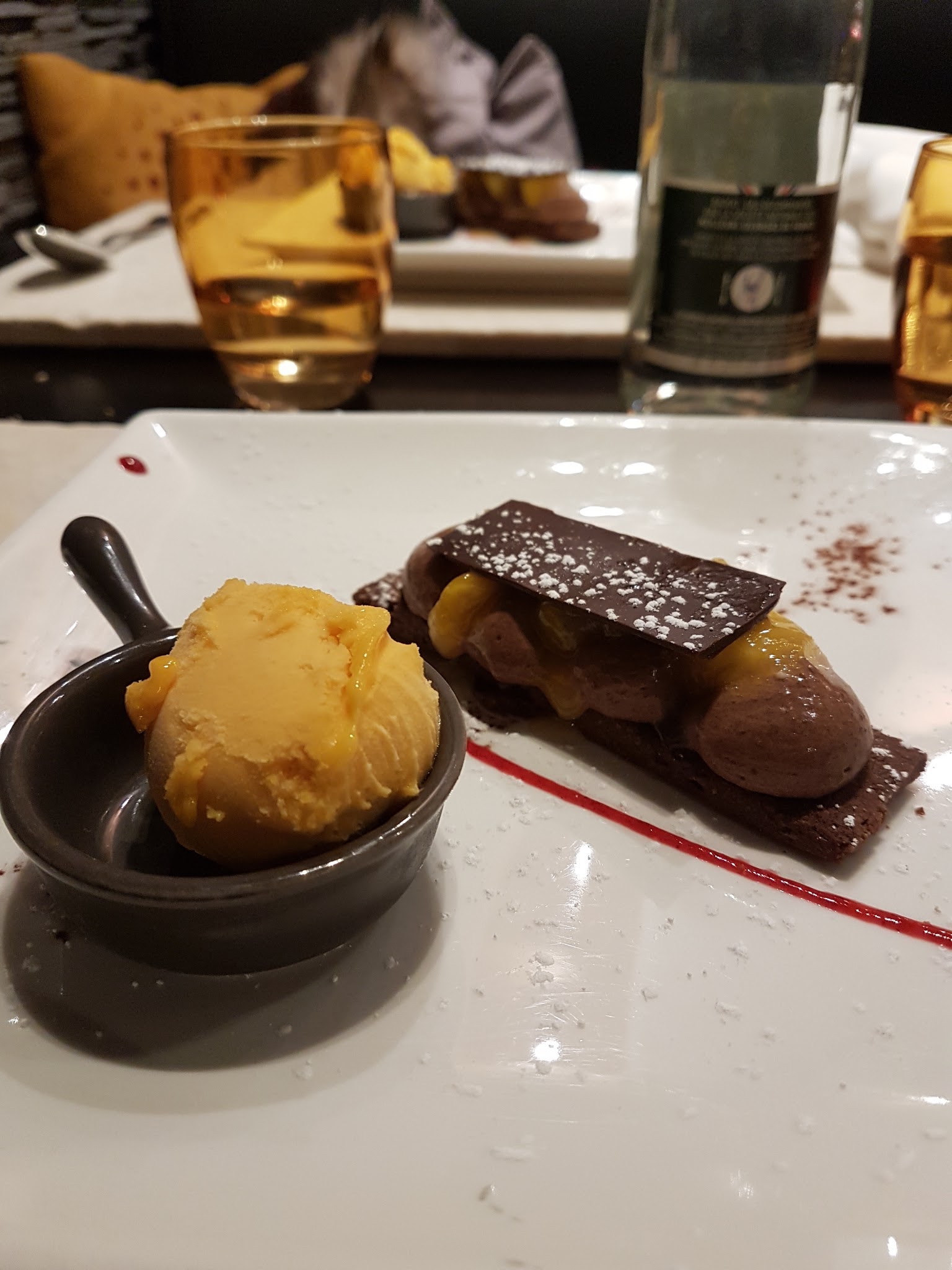 Excellent, les Gambas en entrée et les côtes d'agneaux en plat, un régal ! Je n'ai jamais mangé d'aussi bonne côtes d'agneau...! Le tout est servi sur une planche de marbre servant de set de table, très bonne idée et super originale !