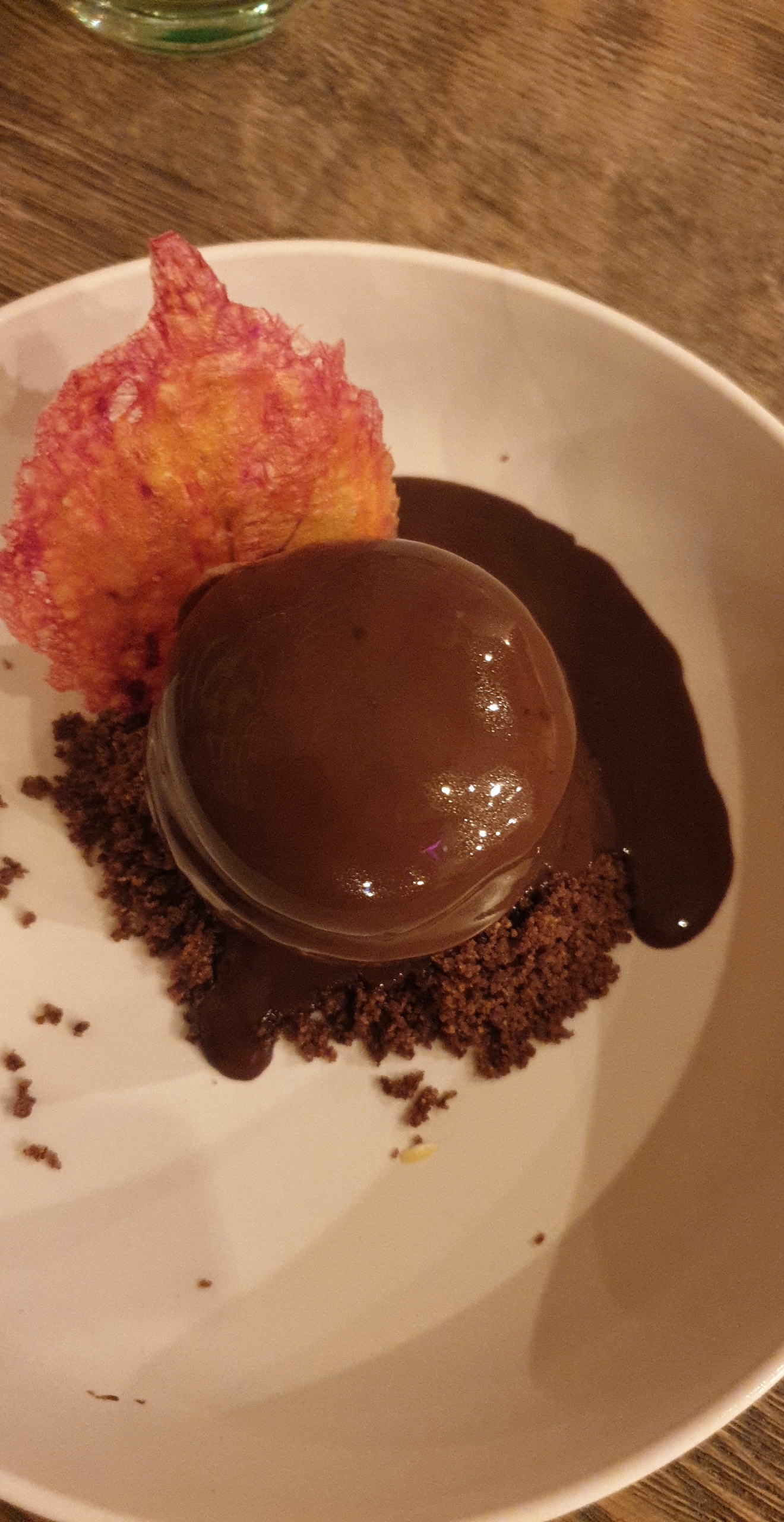 Un joli cadre qui faisait envie mais une musique de fond peu intéressante. Des plats qui sont au minimum pour le prix: pas une arnaque, pas une réussite (une chips aux crevettes à la mayonnaise en amuse bouche, une herbe du jardin présente par grands brins sans gros apport gustatif de l'amuse bouche au dessert, des plats plutôt classiques, sans inspiration...) On aurait mieux fait d'aller dans le petit restaurant juste à côté