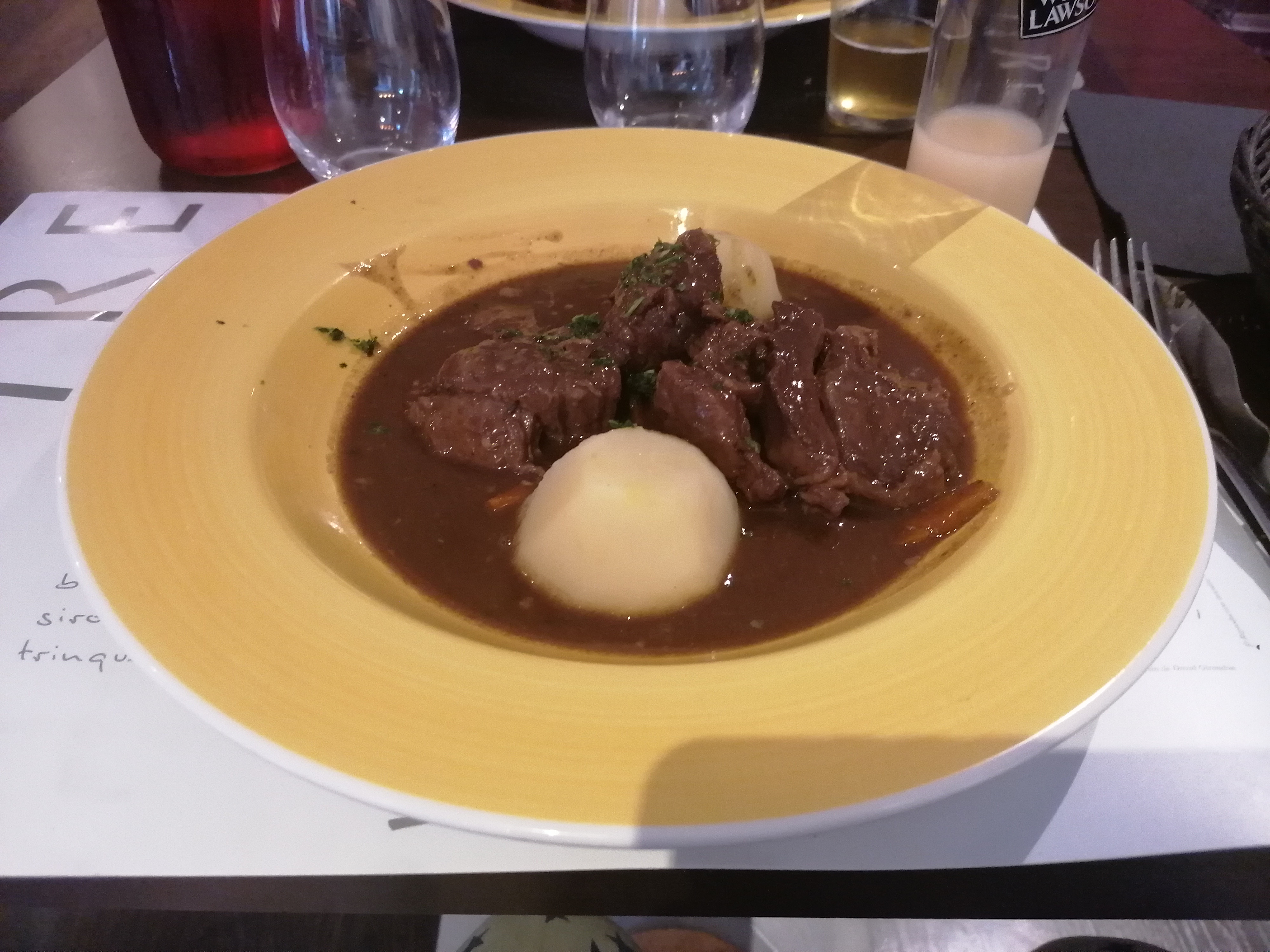 Menu boeuf Bourguignon. Trois plats pour un petit prix. Boeuf de qualité raisonnable. La viande pourrait être un peu plus molle.
