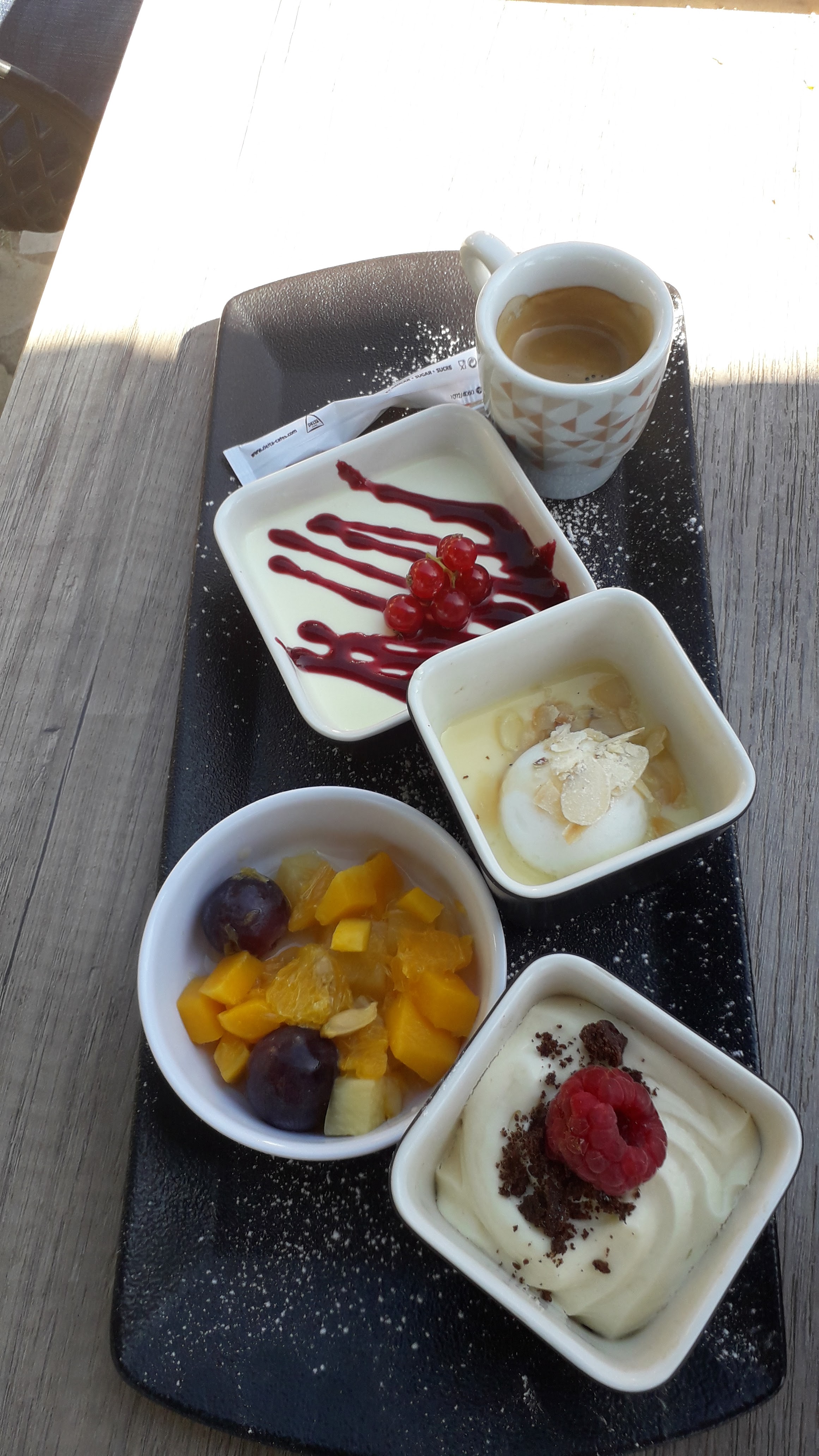 Cadre toujours aussi sympa ; un service au top ; bémol affirmé pour la quantité de sel trop importante dans les tartinablrs et une seule sorte de pain ( blanc toasté) accompagné de tortillas… trop épicées . Dommage ; un peu de couleur légumes crus serait parfait ;)