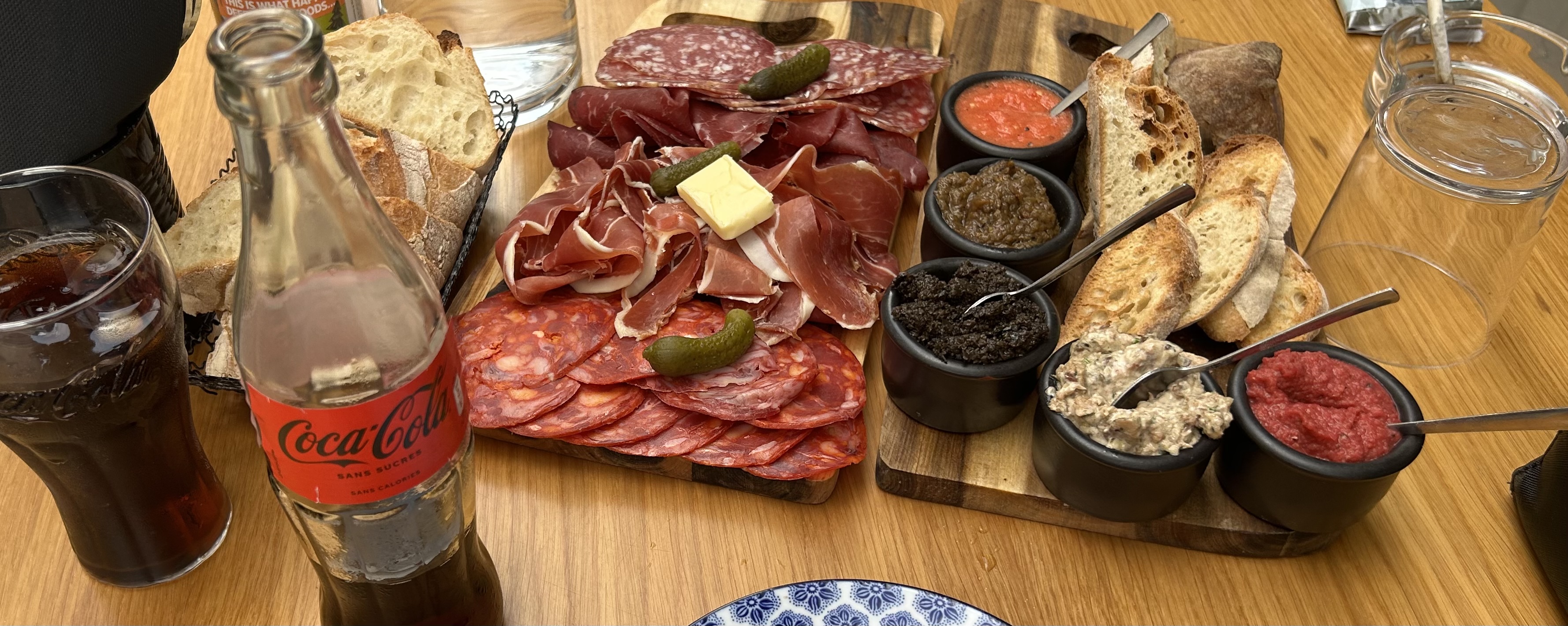 Ambiance sympa autour d'une planche charcuterie et de fromages accompagnée d'un verre de vin. Excellent.