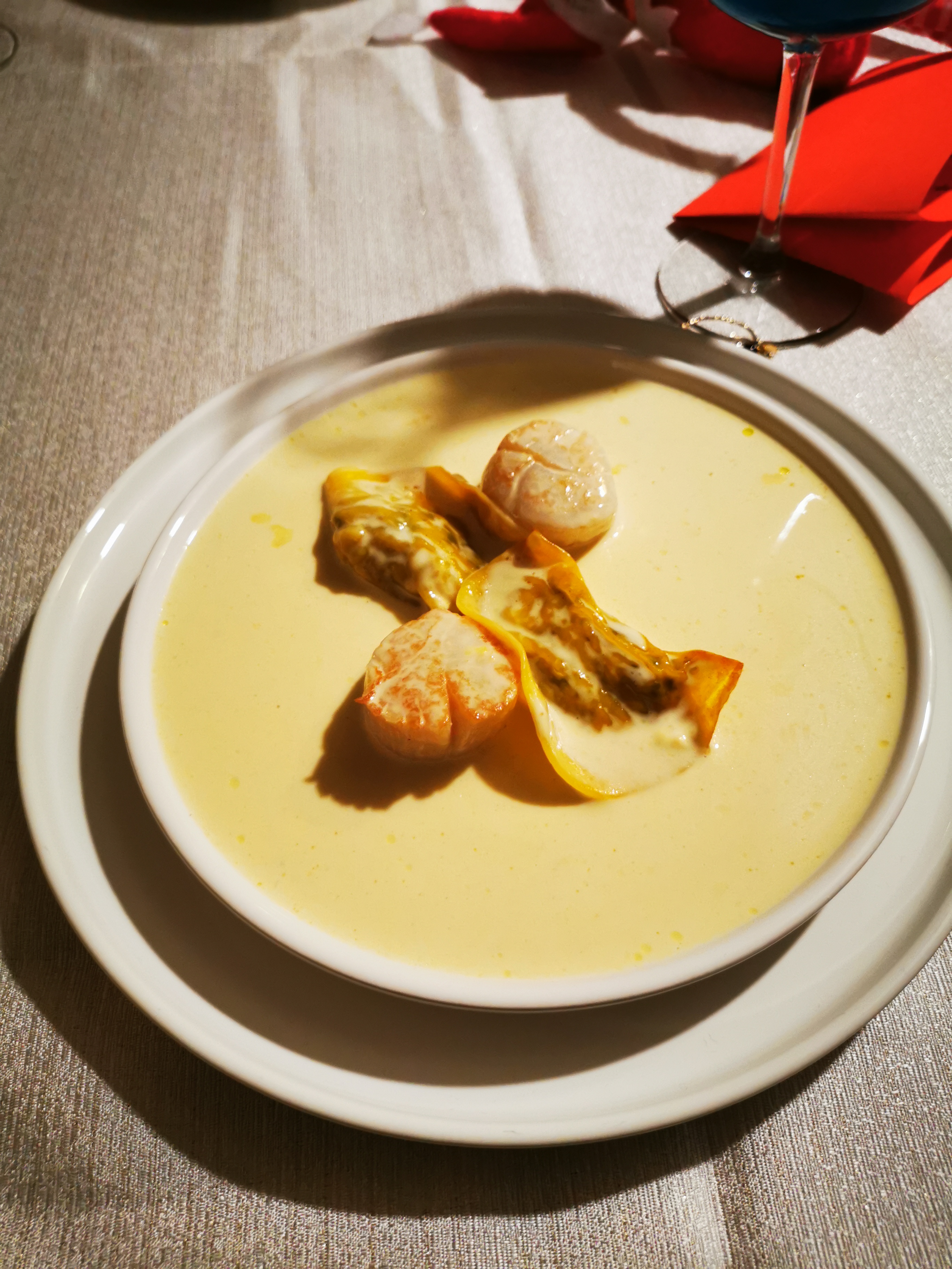 Retour chez Greg et Allison . Que c’est bon… accueil,boissons, plats toujours au top dans une ambiance cool .Gaspacho puis cabillaud aux ravioles de saumon et sole meunière façon « Gregory » avec un verre de Gosset et un saint Joseph … pur moment de bonheur