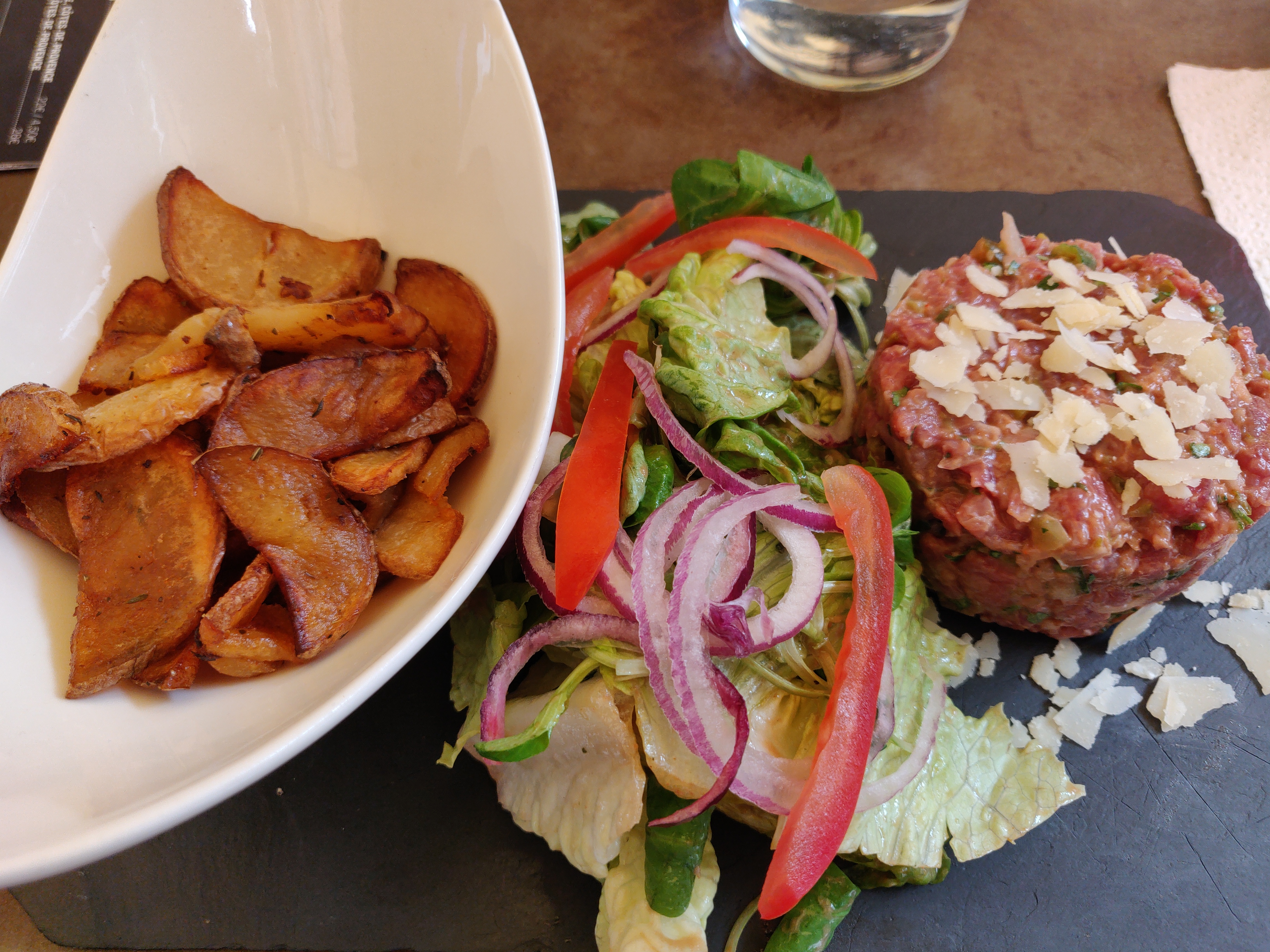 À EVITER pour manger. Carte mensongère. -Burratta et carpaccio de tomate pesto : transformé en salade verte, petit bout de tomate et ananas, et mini burratta. Pas de pesto. Et servis avec des cheveux de cuistot. -Tartare coupé oignons frais : pas frais, mal assaisonné, donc immangeable. -Frite : autant dire la moitié de chips dures. Les images sont belles, mais c'est trompeur.