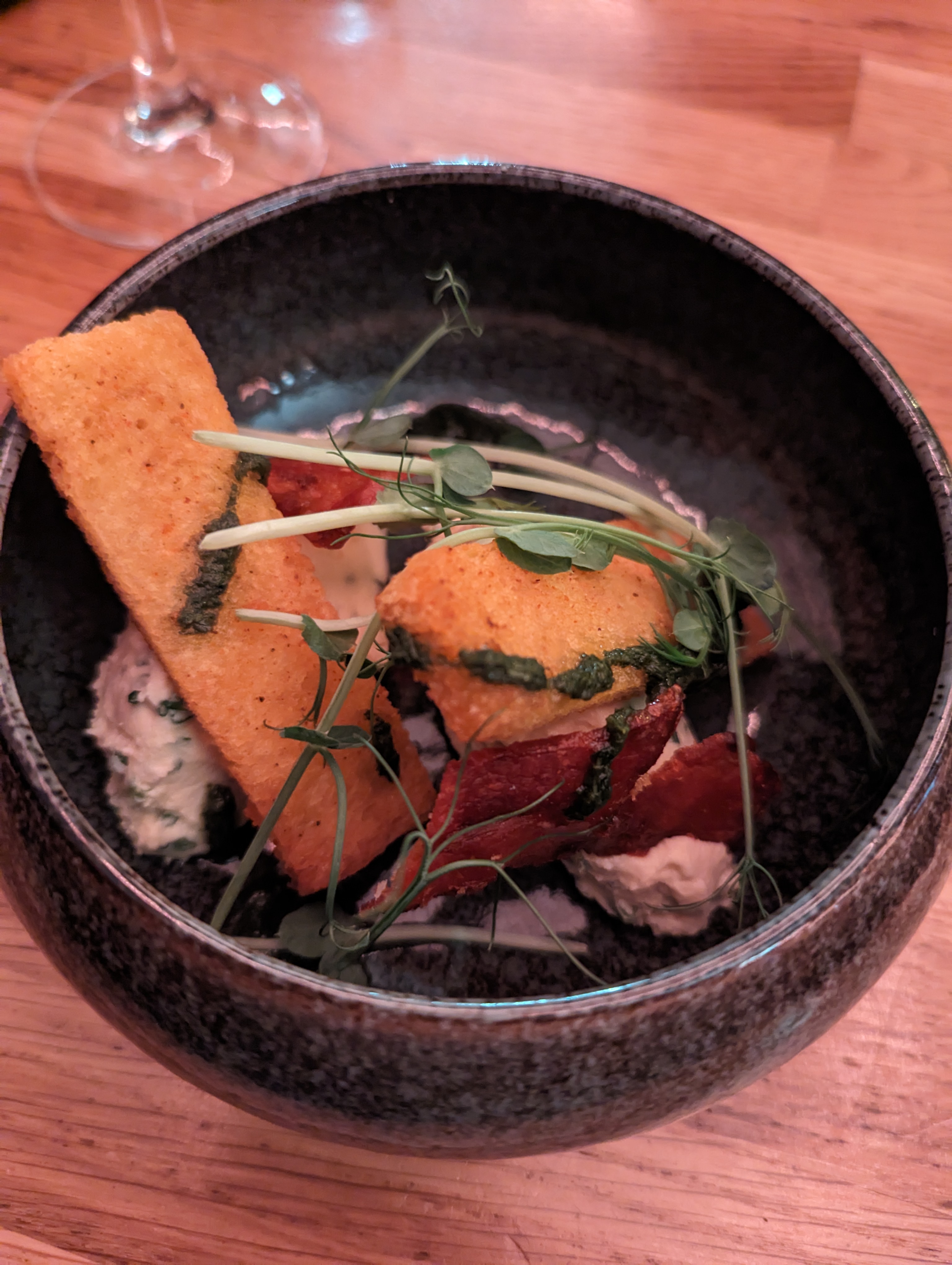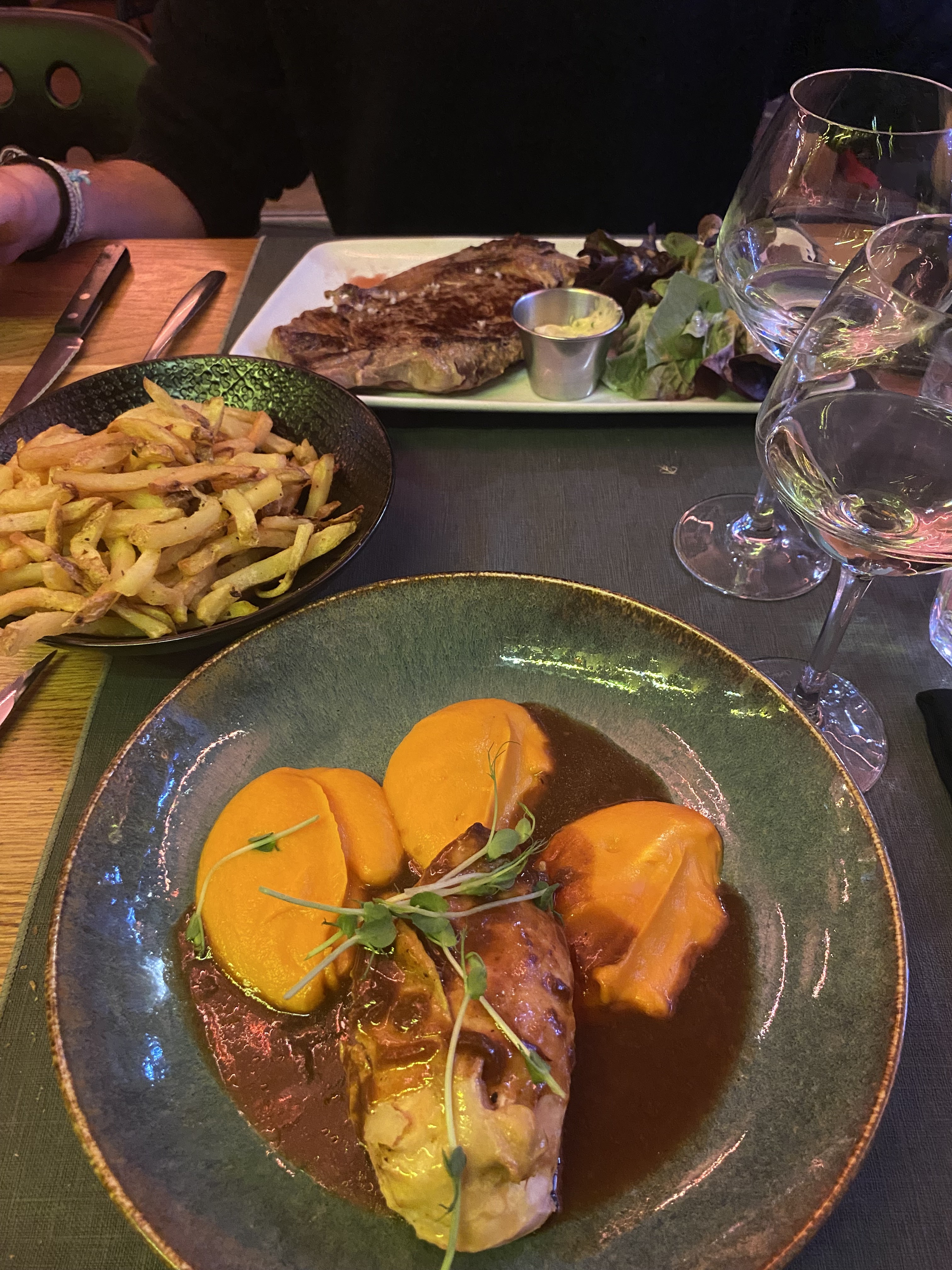 Super moment avec mon ami, on a pris les hanches elles étaient très bonne et je vous recommande la brioche à partager à deux c’est excellent ! L’eau est aromatisée au citron vert juste pour votre information. Le déco est pas mal et les serveurs très gentils. Nous recommandons !!
