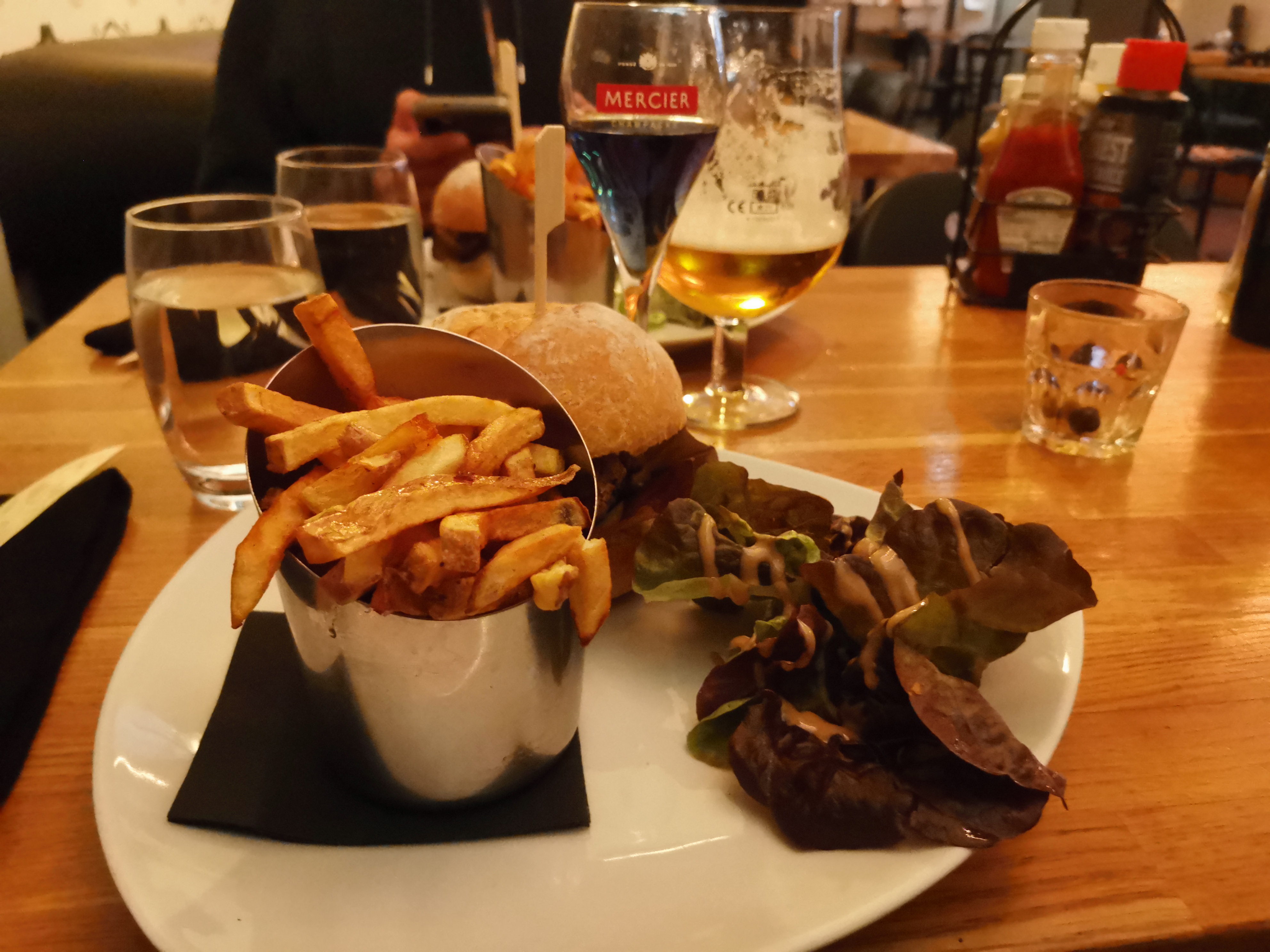 Rien d exceptionnel. Gout insipides, frites maison trop cuites. Notre fils qui est assez jeune à fait de plus une remarque sur son burger. Le pain du burger était très gros et pas assez de viande...Oublie de mon verre de vin... ca ne vaut pas mieux qu un Macdo. Nous avons donné ces impressions en direct ce midi donc pas d avis malhonnêtes