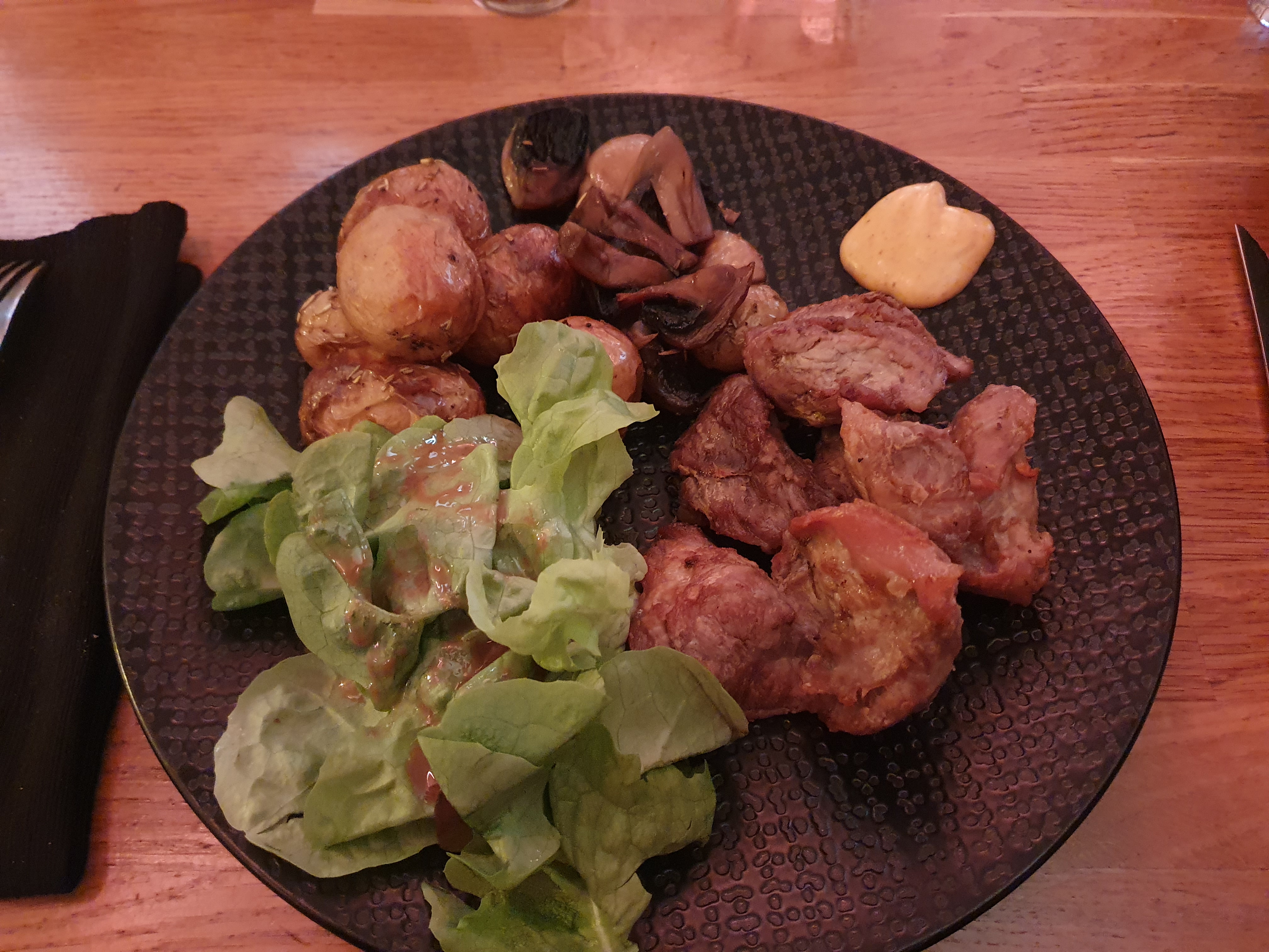 Très déçue 😞. Repas professionnel organisé ( choix des menus donnés au préalable par souci d'organisation). Service très lent durée du repas presque 2h00. Apéritif compris dans la formule non servi malgré plusieurs relances. Le filet mignon beaucoup trop cuit ( impression de réchauffé ) des collègues nont pas pû terminer leur viande. Purée et sauce bonnes. La bière 🍺 pas bonne du tout.