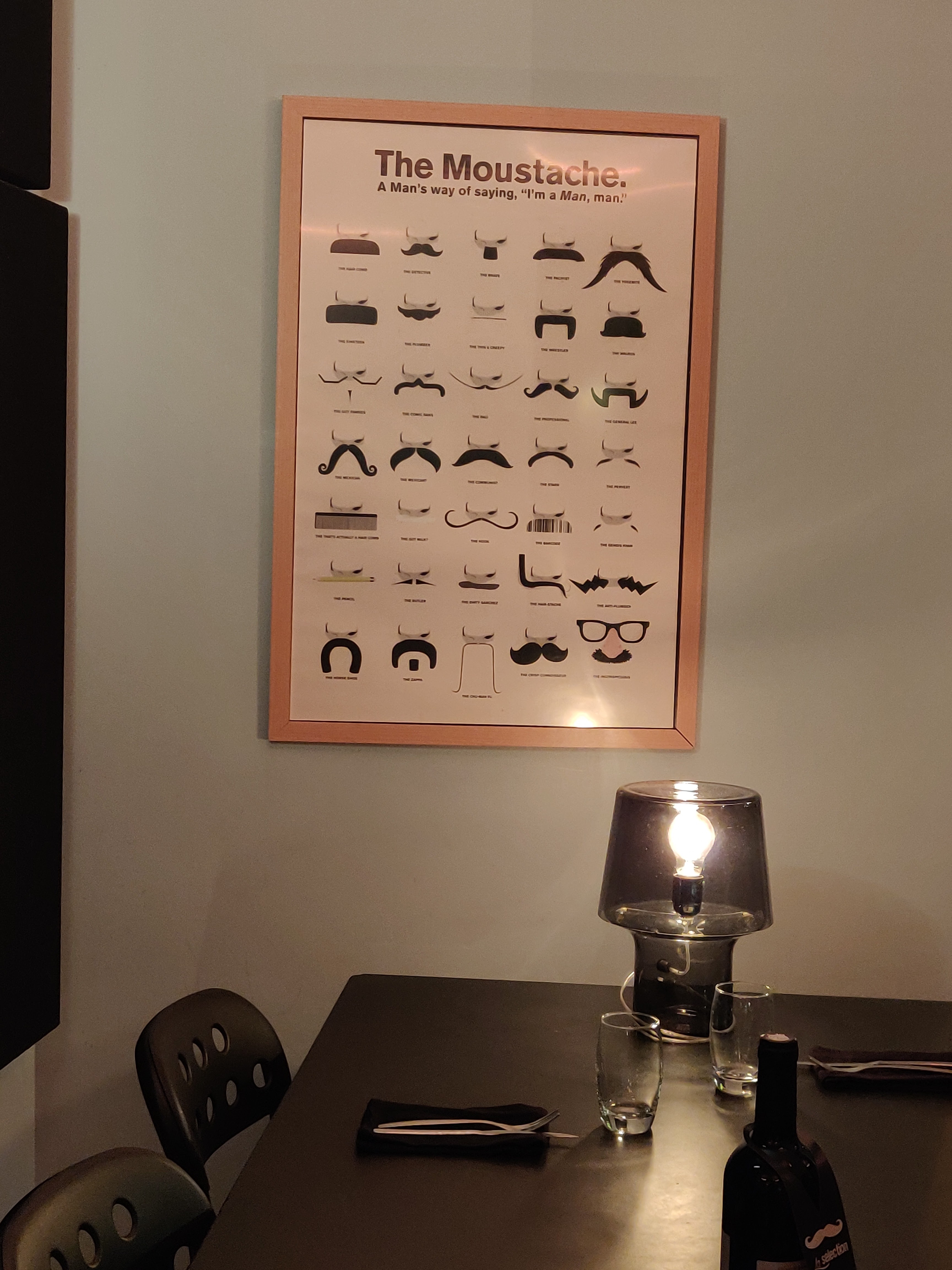 Beaucoup de moustaches.... j'aime beaucoup ce restaurant qui se démarque des autres ! Personnel au petit soin, carte plutôt bien remplie. Tres bonne cuisine fait maison ! Nous avons passé un bon moment je reviendrai avec grand plaisir. Merci beaucoup