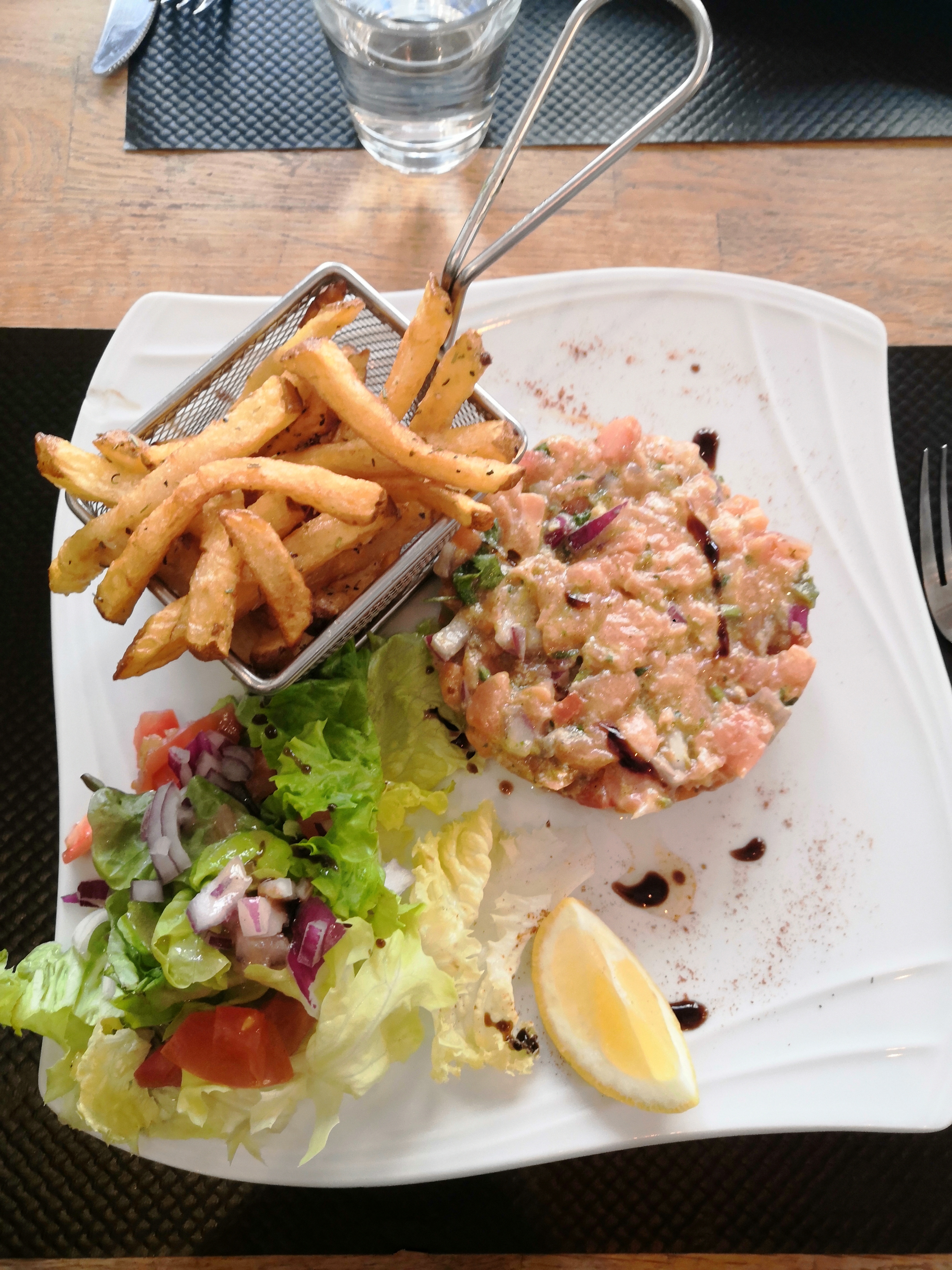 On y mange bien. Le tartare de thon était top, assaisonnement parfait et frites maison. Les linguines au pesto rosso avec pesto et sauce tomate maison, supplément burrata : sans faute. L’accueil est juste parfait !!! Le restaurant est canon. Une bonne adresse où faire un stop ! Merci pour votre gentillesse
