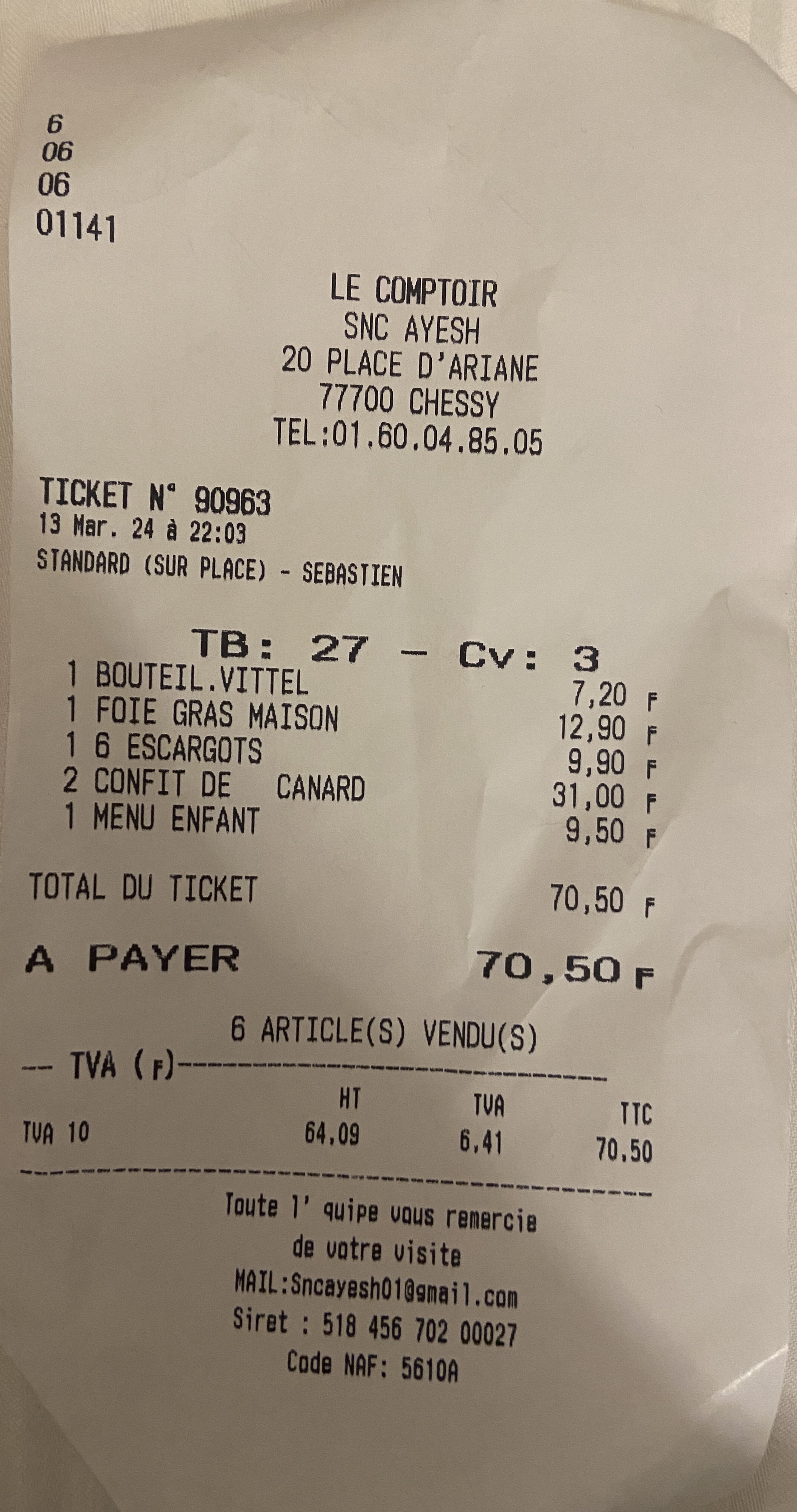 J'ai découvert ce petit restaurant parce que je voulais absolument manger des escargots et j'ai été vraiment satisfait ! Avec ma femme et ma fille de sept ans, nous avons décidé de l'essayer : un menu enfant pour elle à 9,50 € avec des nuggets et chips, des escargots pour moi et du foie gras pour ma femme. En deuxième plat, une cuisse de canard avec pommes de terre rôties et salade ; pour moi et pour ma femme. La nourriture était très bonne (je m'attendais à ce que la peau de la cuisse soit un peu plus croustillante mais la viande était délicieuse) et le service était sensationnel : la fille qui nous servait à table était pleine d'attention et apportait un petit panier de du pop corn (2 fois) avec du pain en attendant l'arrivée des entrées pour ne pas nous faire attendre trop longtemps, si la corbeille à pain était vide il travaillait immédiatement pour la remplir et s'assurait souvent que tout était à notre goût, avec courtoisie et la gentillesse. Nous avons mangé dans une heure. Informé.