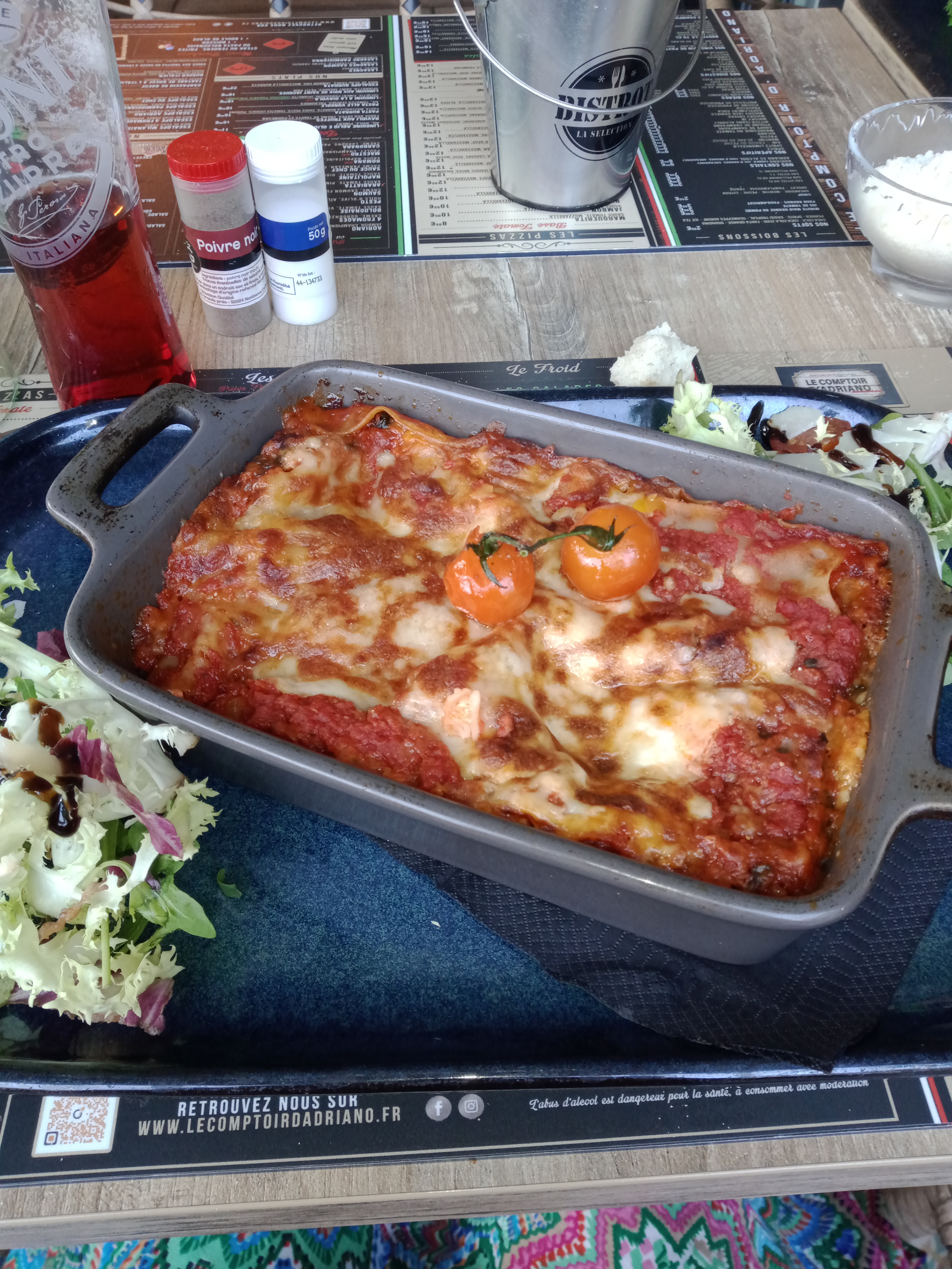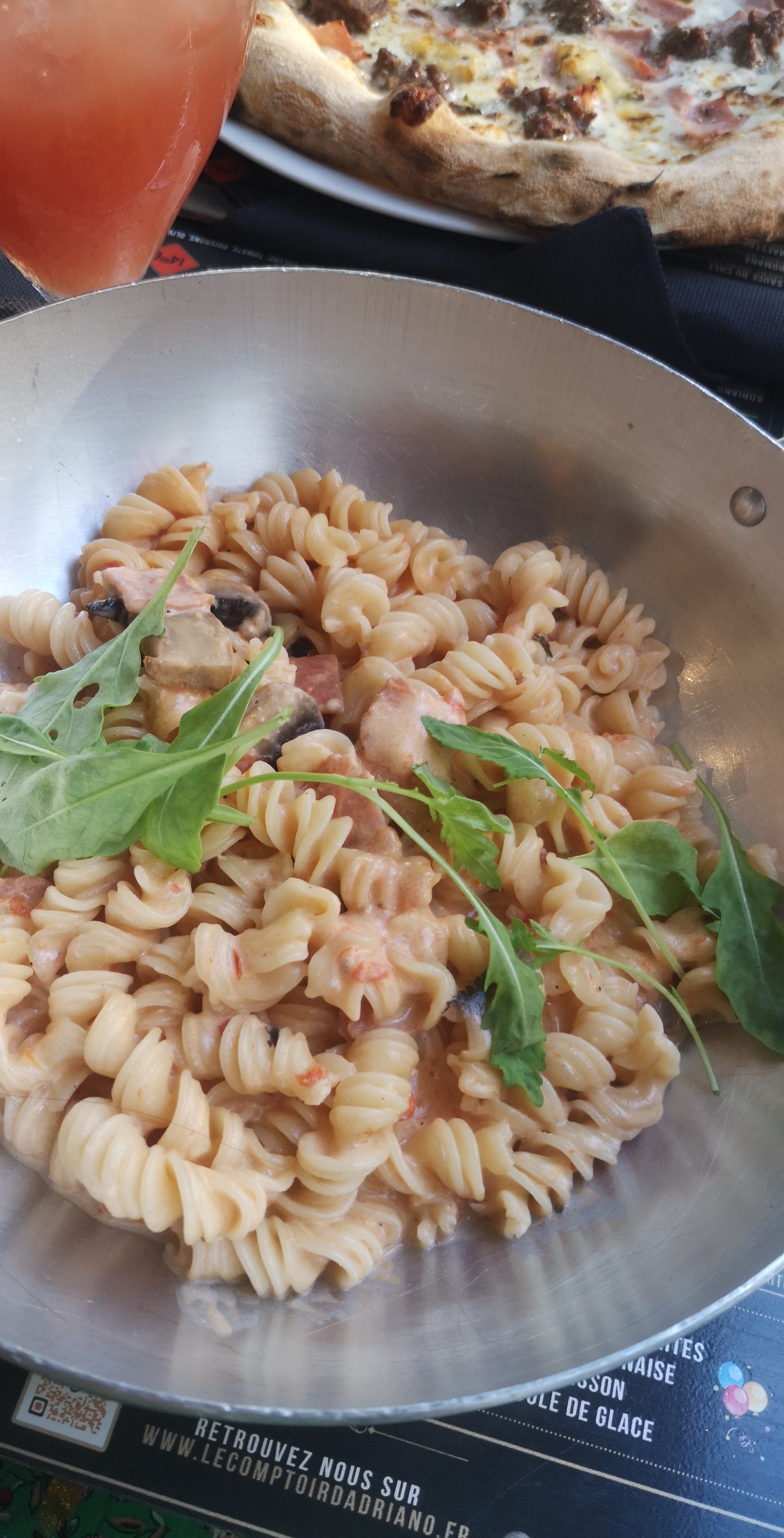 En vacances sur Frejus, passage obligatoire au comptoir d’Adriano à dire vrai ils disent restaurant italien ils font de la vraie restauration italienne. Le restaurant est tellement beau. La nourriture est tellement bonne vraiment des professionnels dans leur domaine. Pour ma part lasagnes bolognaise obligé les enfants ont beaucoup apprécié la pizza au jambon et les pâtes, à la bolognaise, un délice, et qui dit restaurant italien, dit tiramisu, le meilleur que j’ai mangé dans ma vie, je recommande de tout cœur