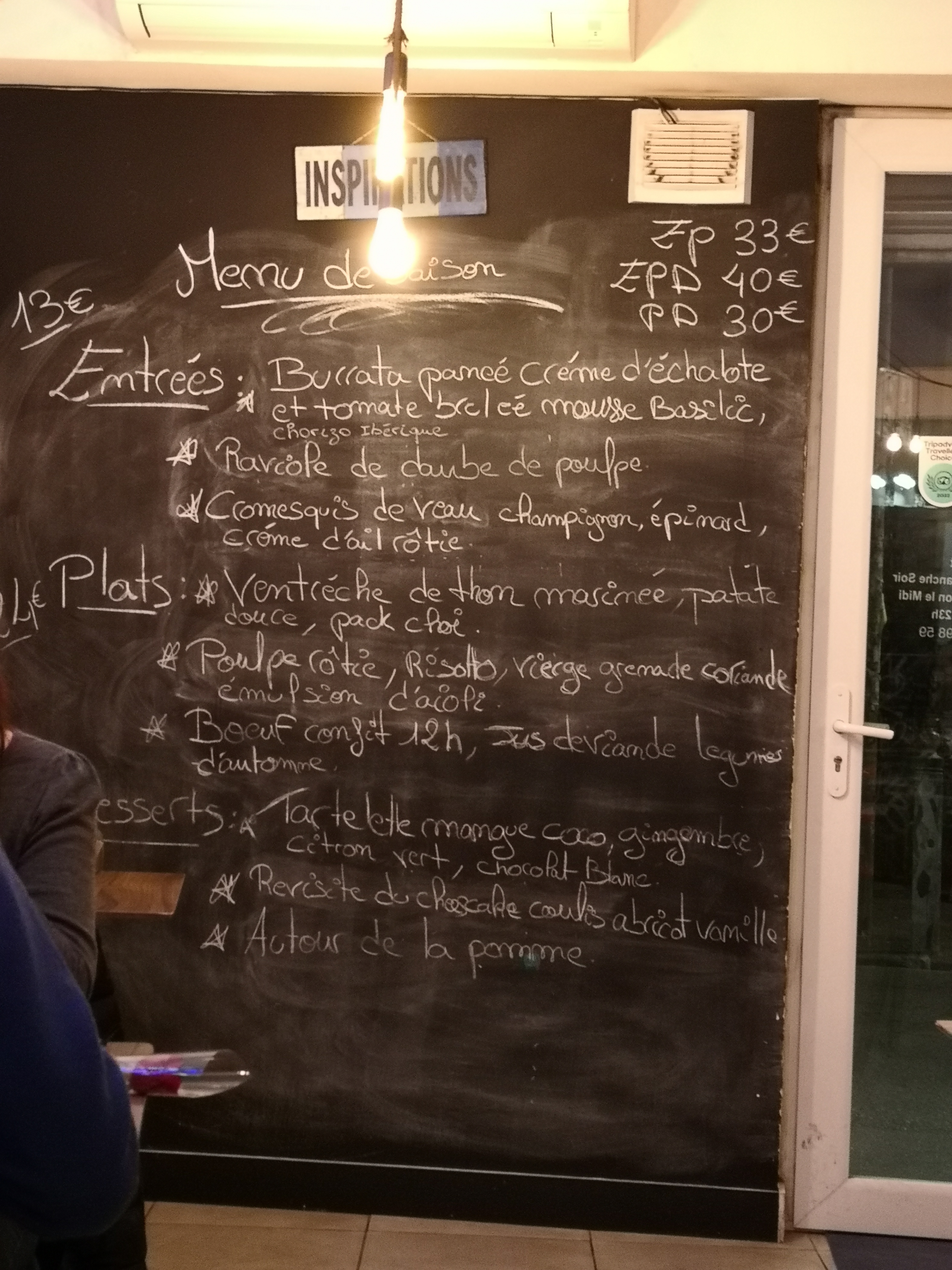 Carte réduite avec les entrées plats et desserts du jour. Très fin et service sympathique qui a accepté d'accueillir un groupe de 11 un samedi soir. La salle est plutôt petite, c'est intime. On s'en sort pour 40eur environ pour tout le menu et du vin.