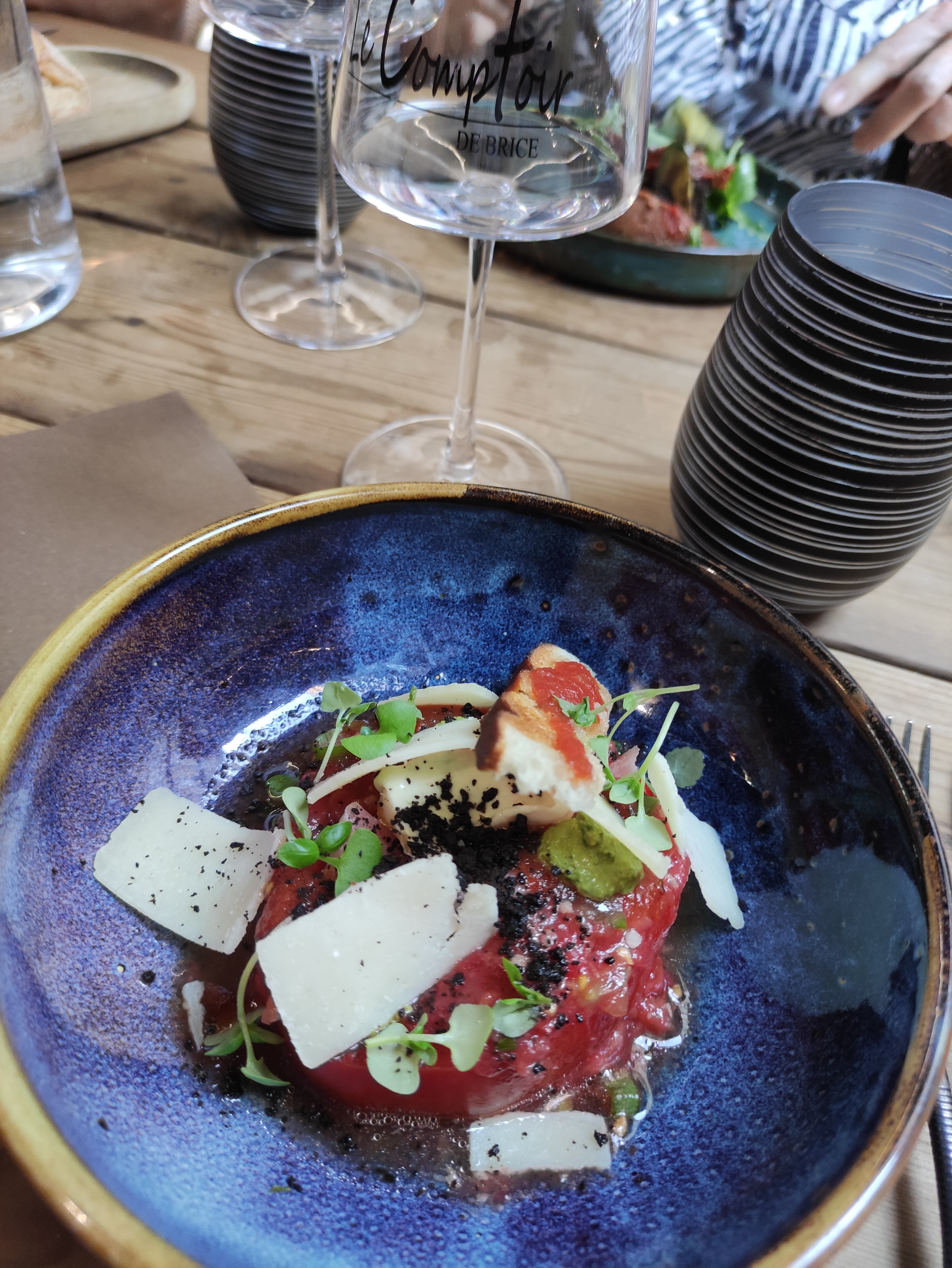 Superbe découverte que le comptoir de Brice. Le concept du chef est de nous révéler ses plats grâce à sa cuisine ouverte. Le menu du jour et la carte de 3 entrées 3 plats 3 desserts proposent un voyage des sens. Nous nous sommes régalés et reviendrons avec plaisir. Une terrasse dans les ruelles du vieux Angoulême ombragée grâce à des stores nous a permis de déjeuner à l'abri en extérieur.